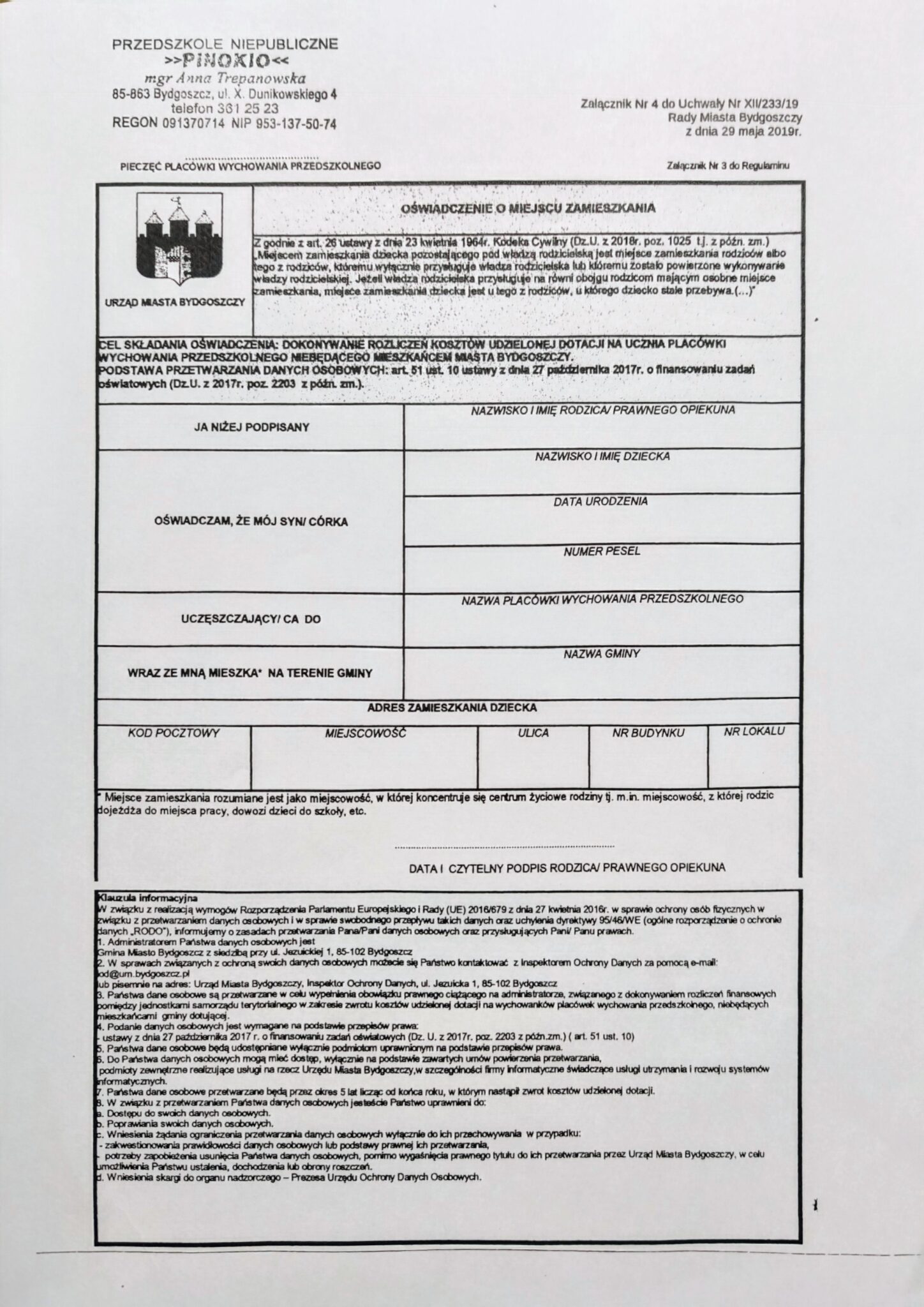 dokumenty do pobrania Karta zgłoszenia dziecka do przedszkola dokument do pobrania 2. Jednodniowe upoważnienie do odbioru dziecka z przedszkola dokument do pobrania 3. Oświadczenie o miejscu zamieszkania dokument do pobrania 4. Umowa z rodzicami dokument do pobrania 5.Upoważnienia do odbioru dziecka dokument do pobrania