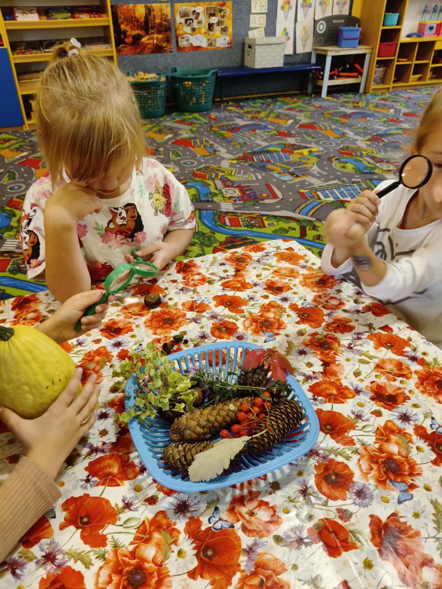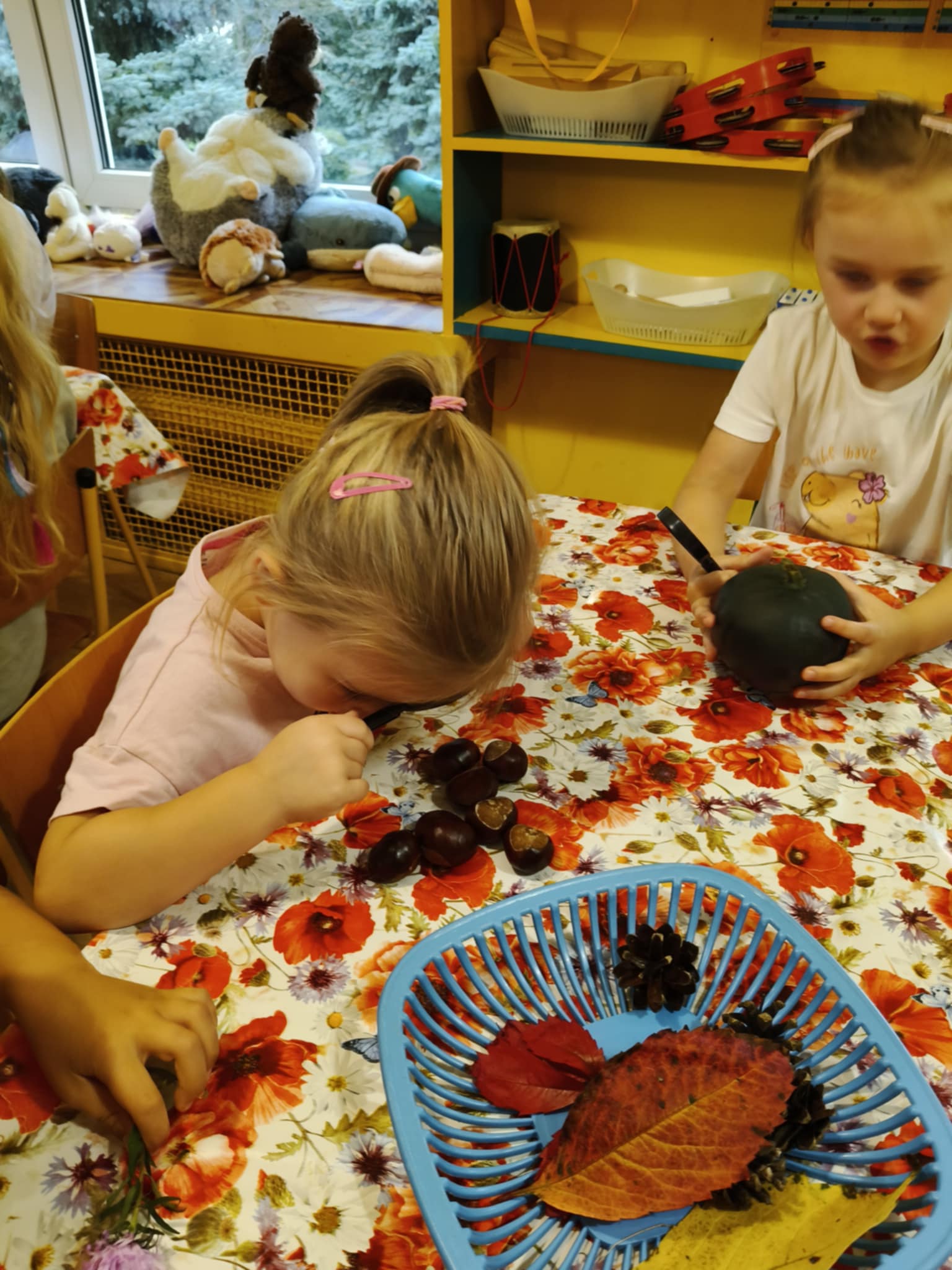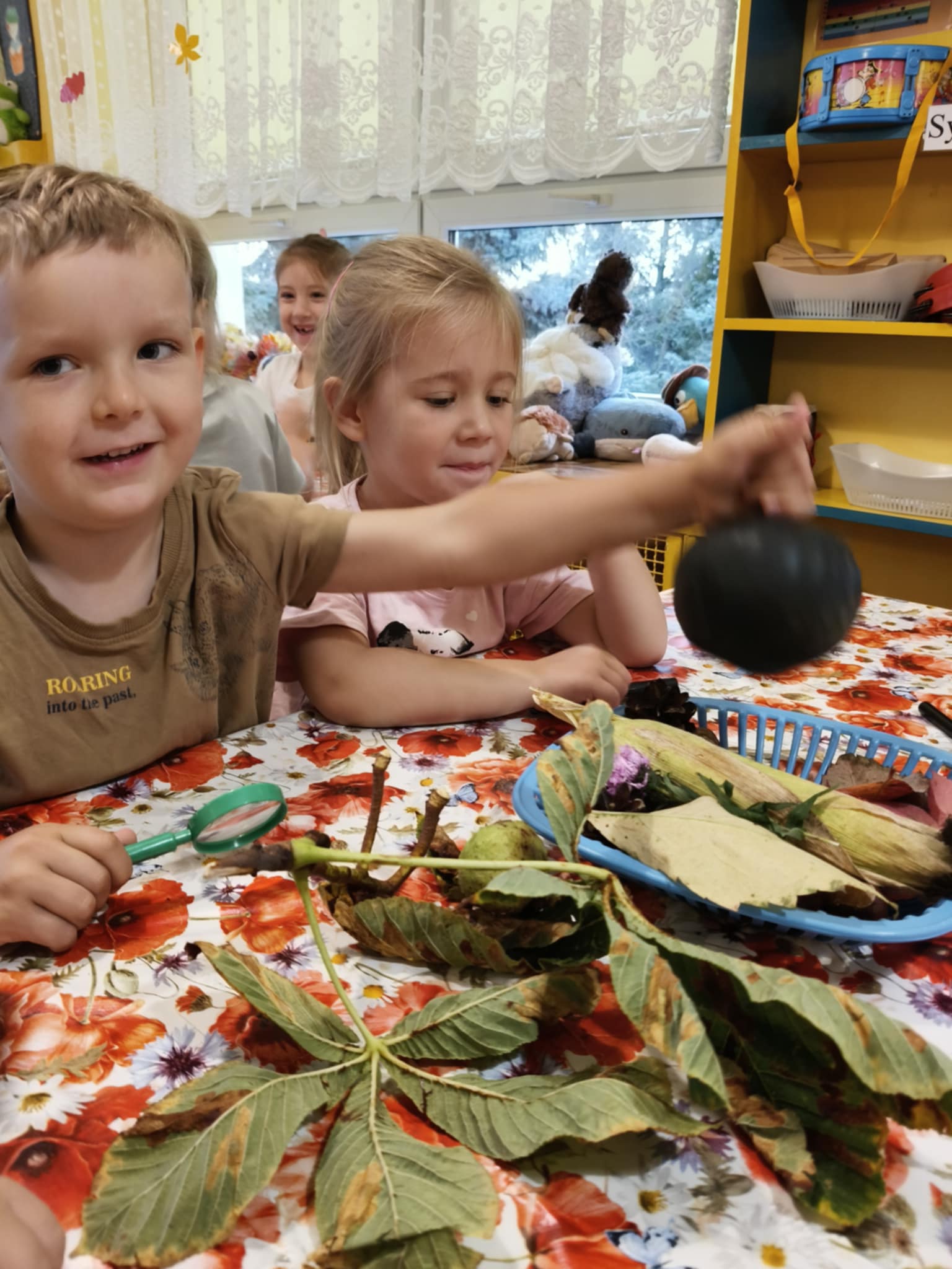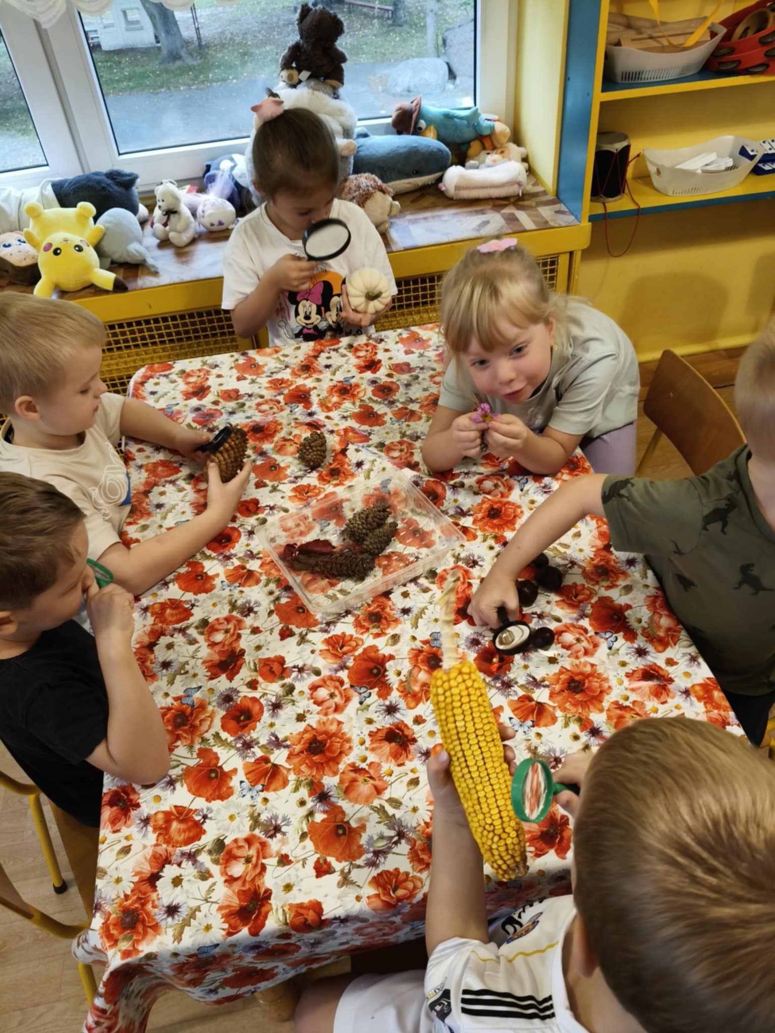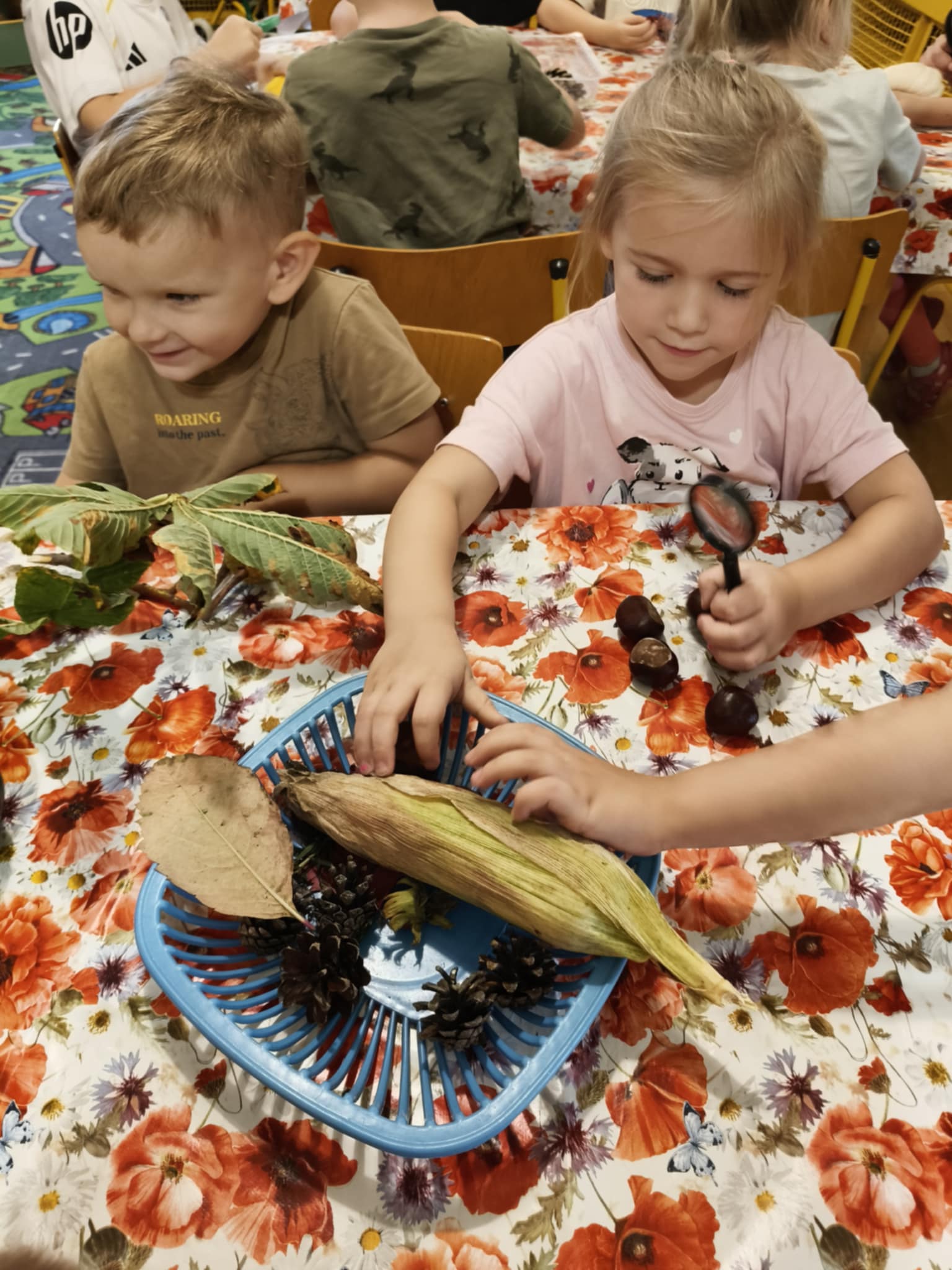 Poznajemy jesienne dary poprzez zabawy badawcze – dotykamy, wąchamy, oglądamy i odkrywamy, co kryje jesień! 🌰🍁