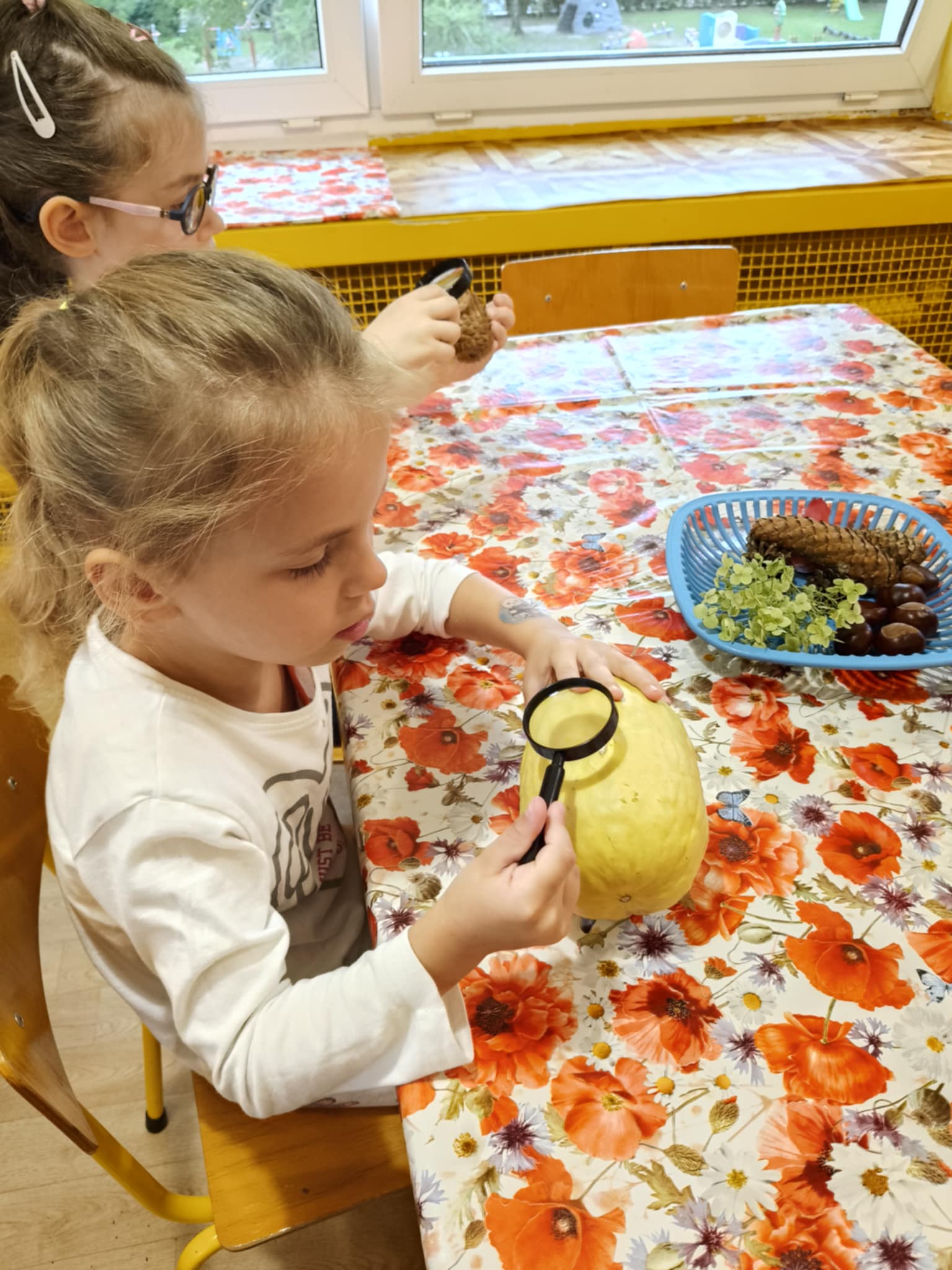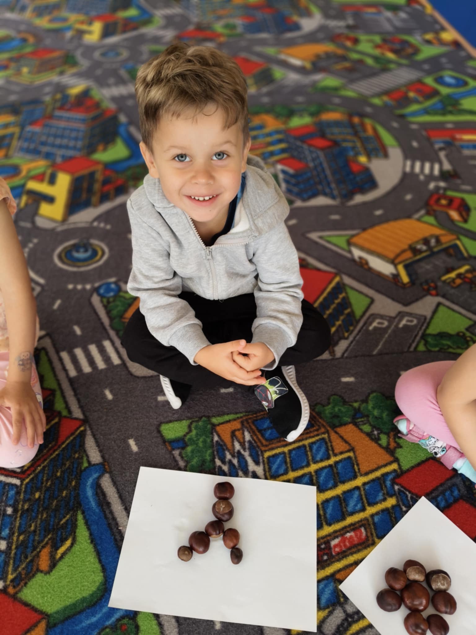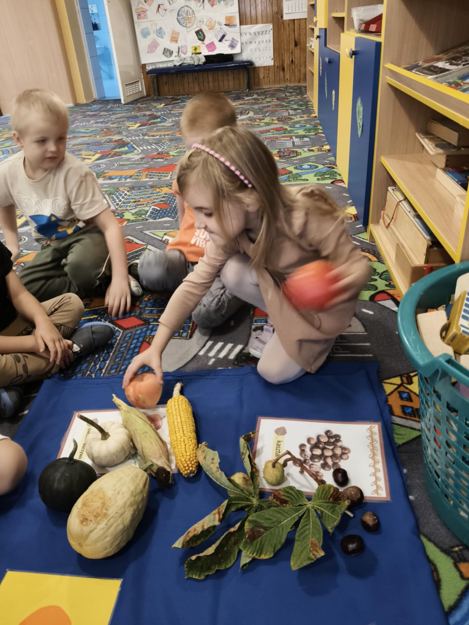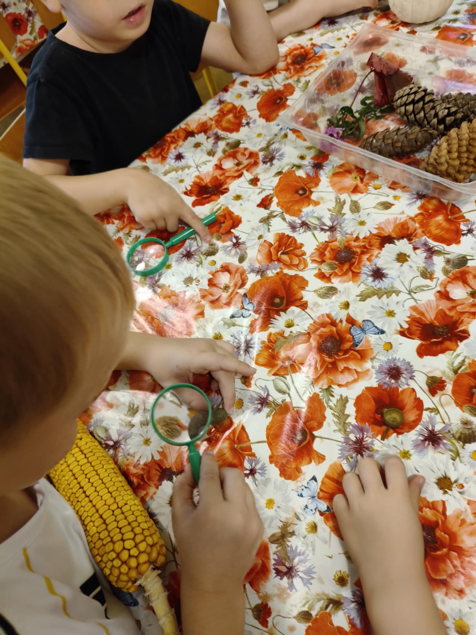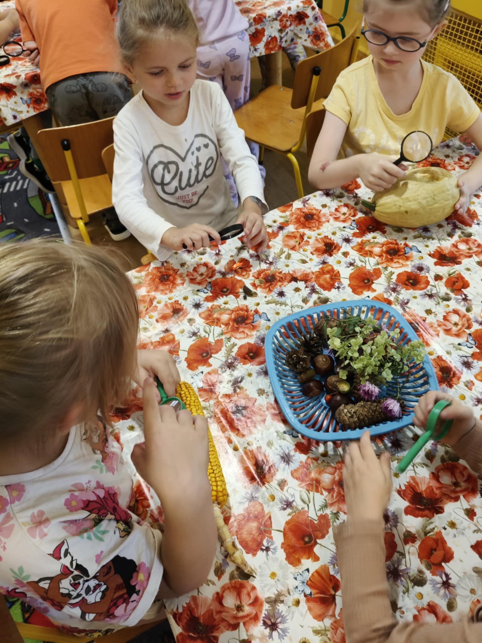 Poznajemy jesienne dary poprzez zabawy badawcze – dotykamy, wąchamy, oglądamy i odkrywamy, co kryje jesień! 🌰🍁