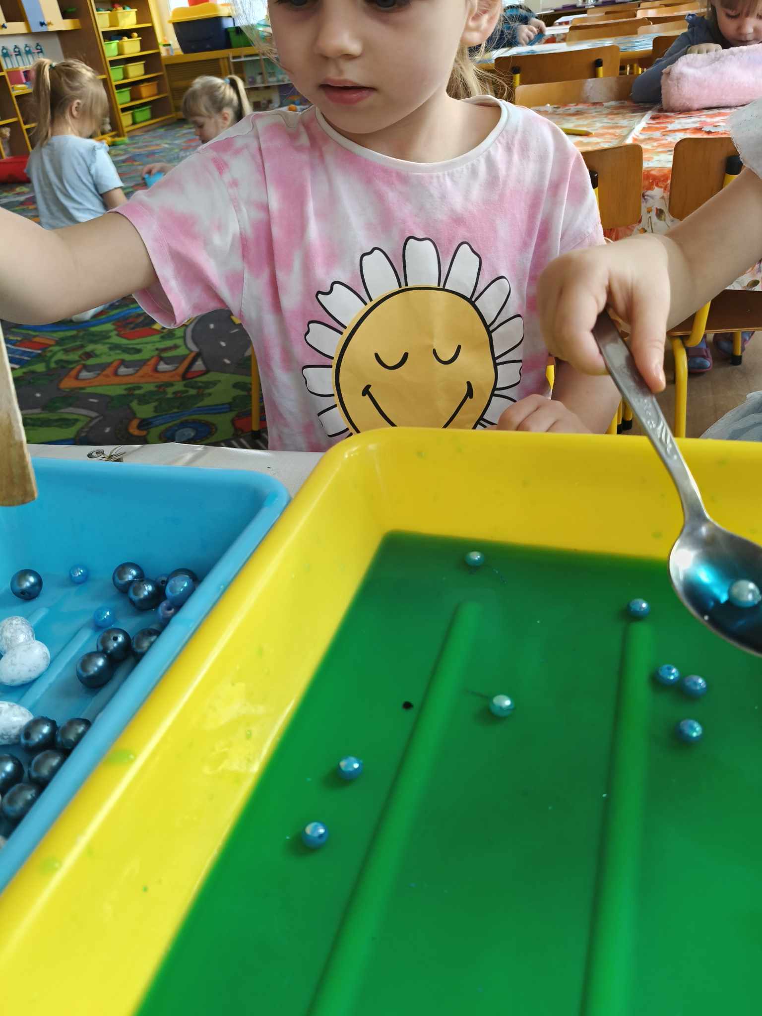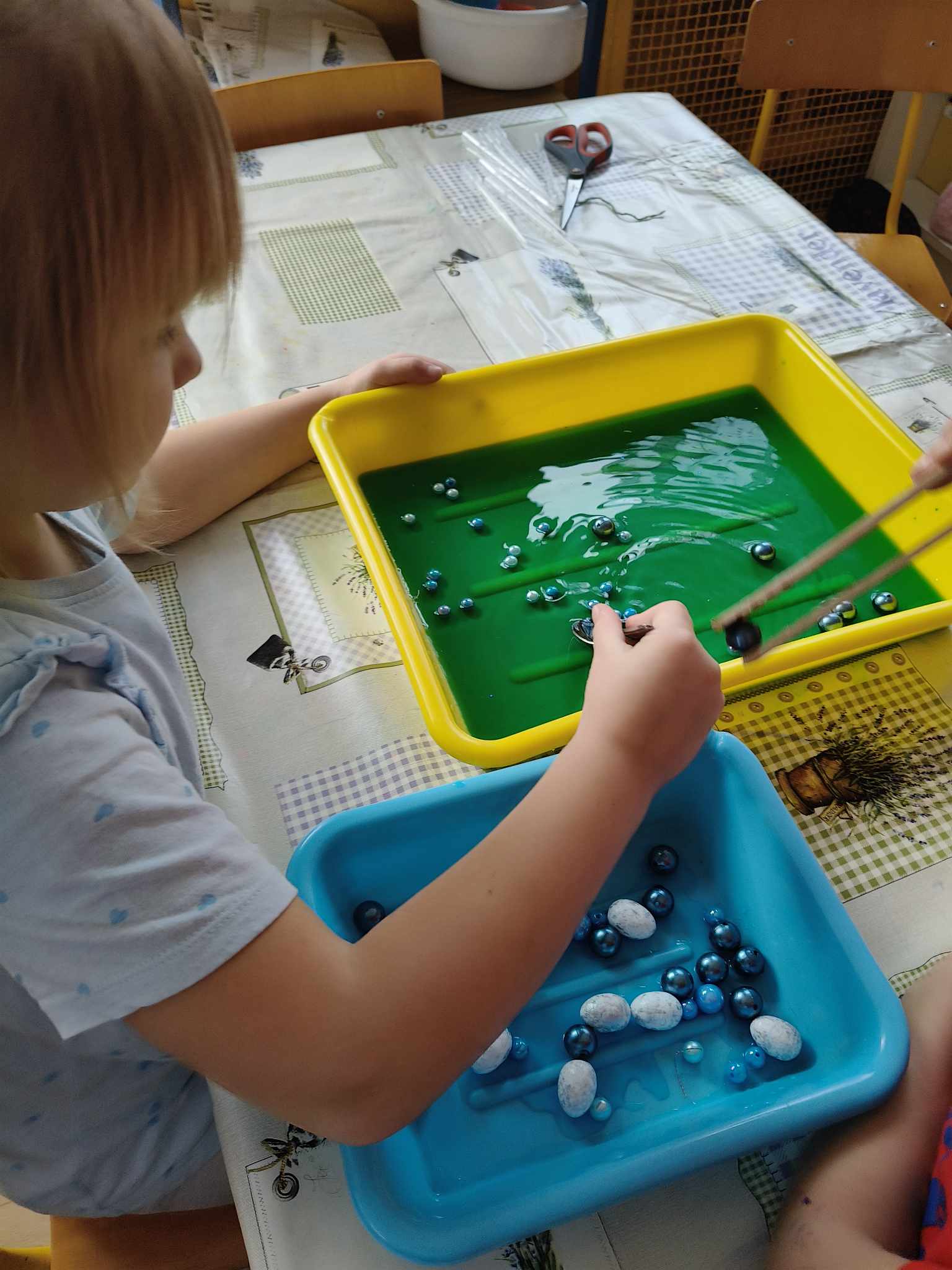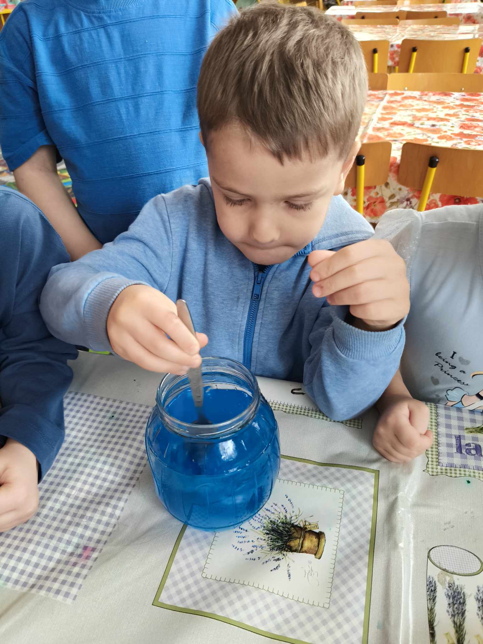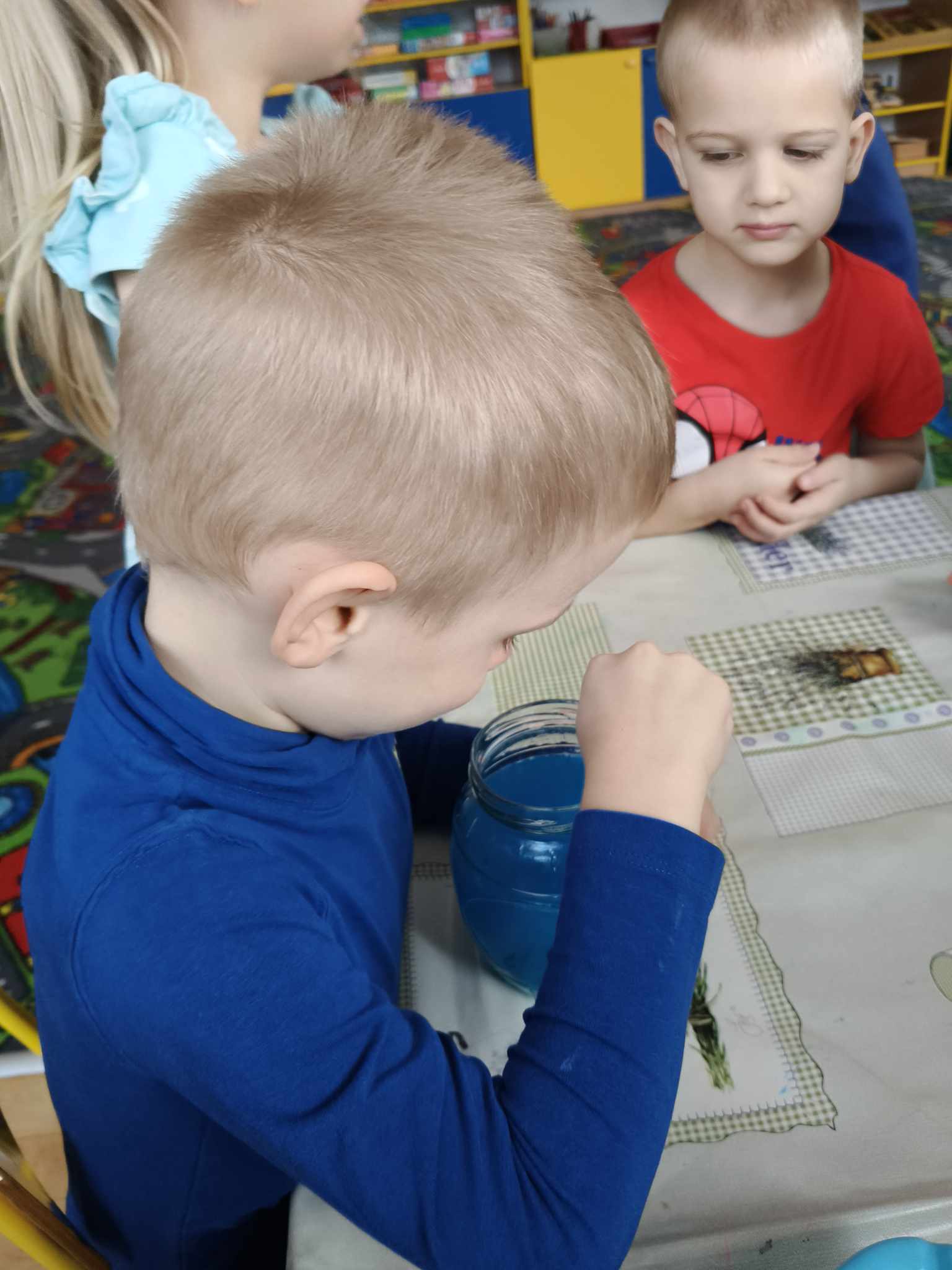 W grupie żabek odbył się Dzień Niebieski 💙. Dzieci bawiły się niebieskimi kubeczkami, szukały niebieskich przedmiotów i wyławiały z wody koraliki. Na koniec wykonaliśmy kilka eksperymentów i czekamy na stworzenie się niebieskich kryształków soli.