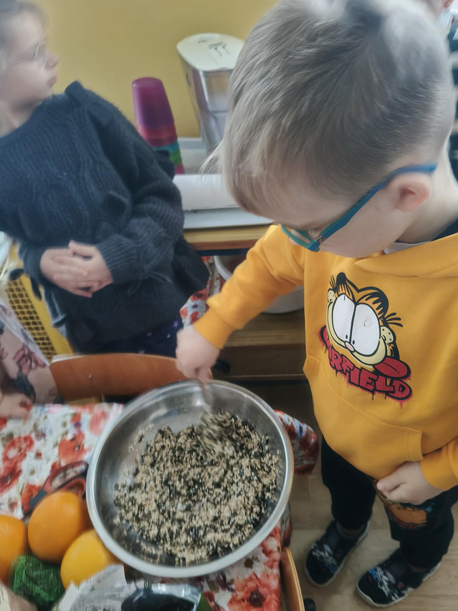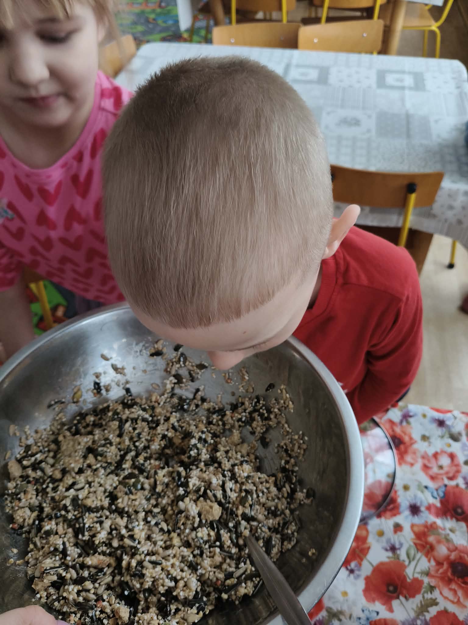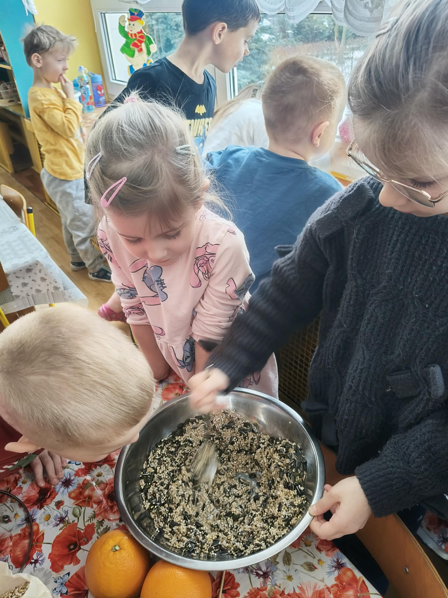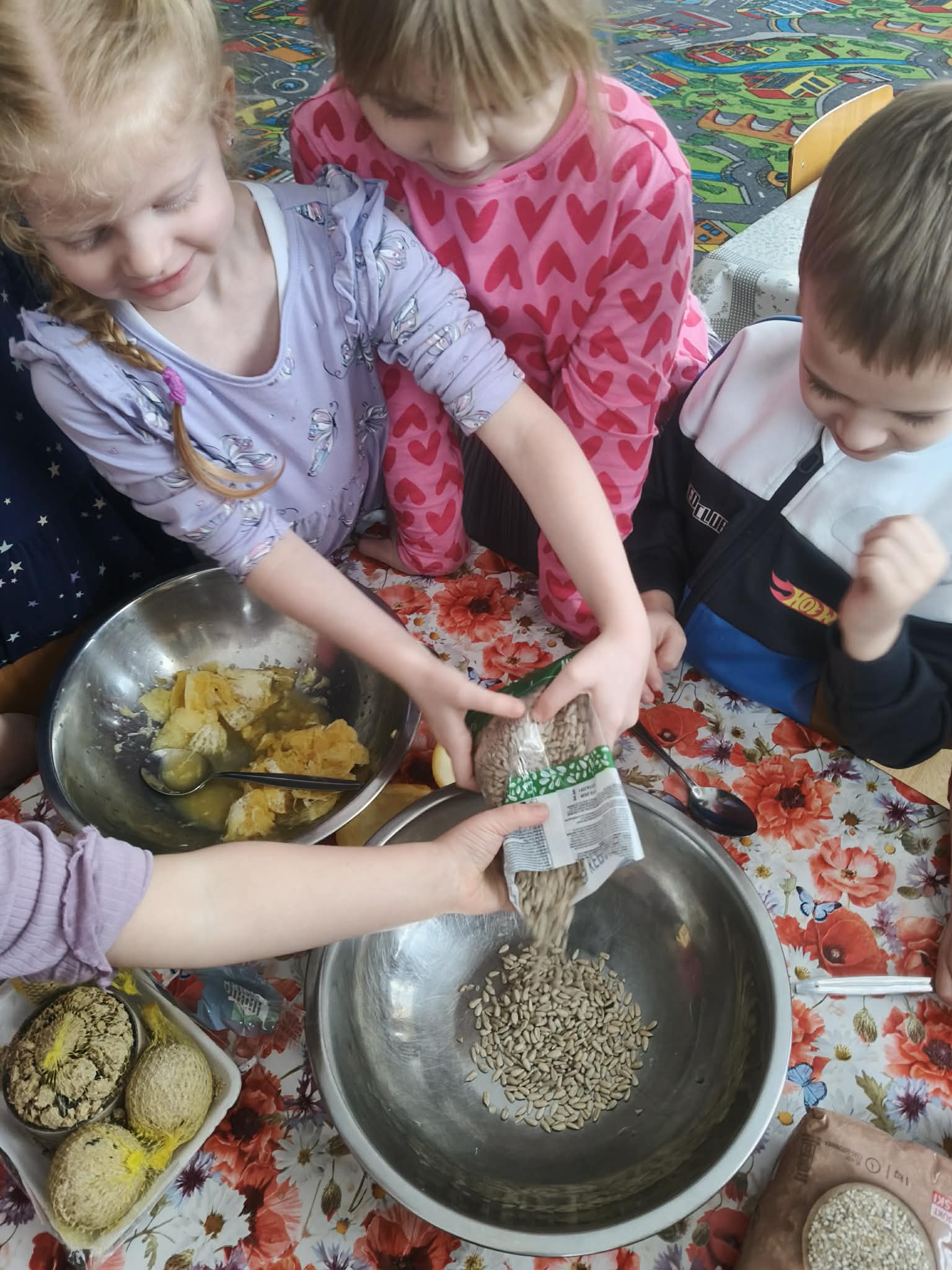 Rozmawialiśmy o tym, jak dokarmiać ptaki zimą i jak o nie dbać. Dzieci poznały zasady bezpiecznego dokarmiania oraz wykonały własne jedzenie dla ptaków.