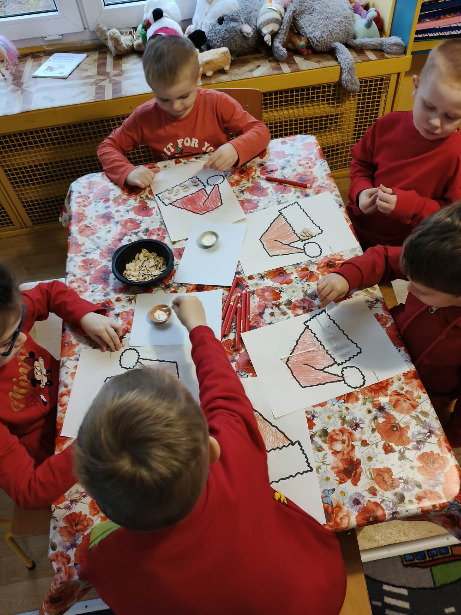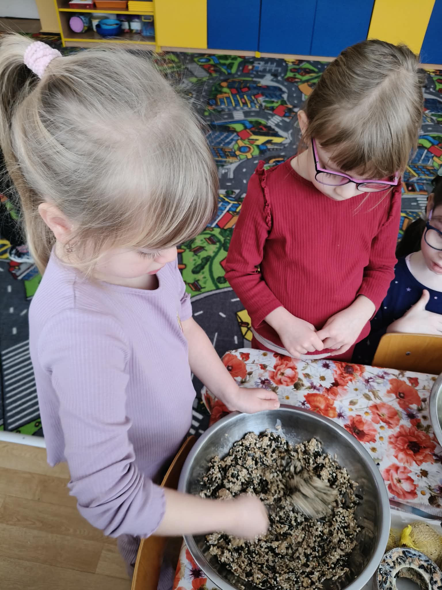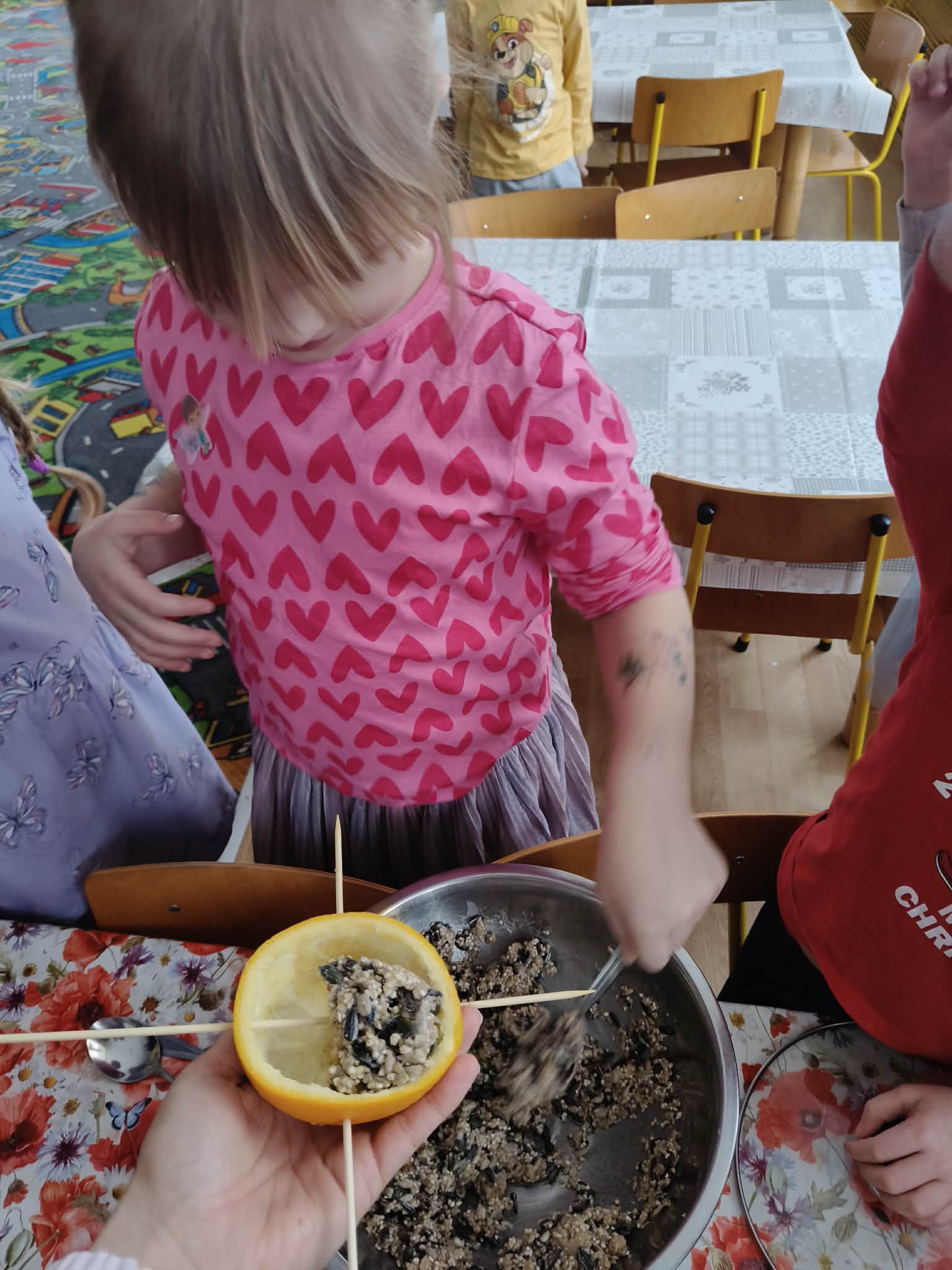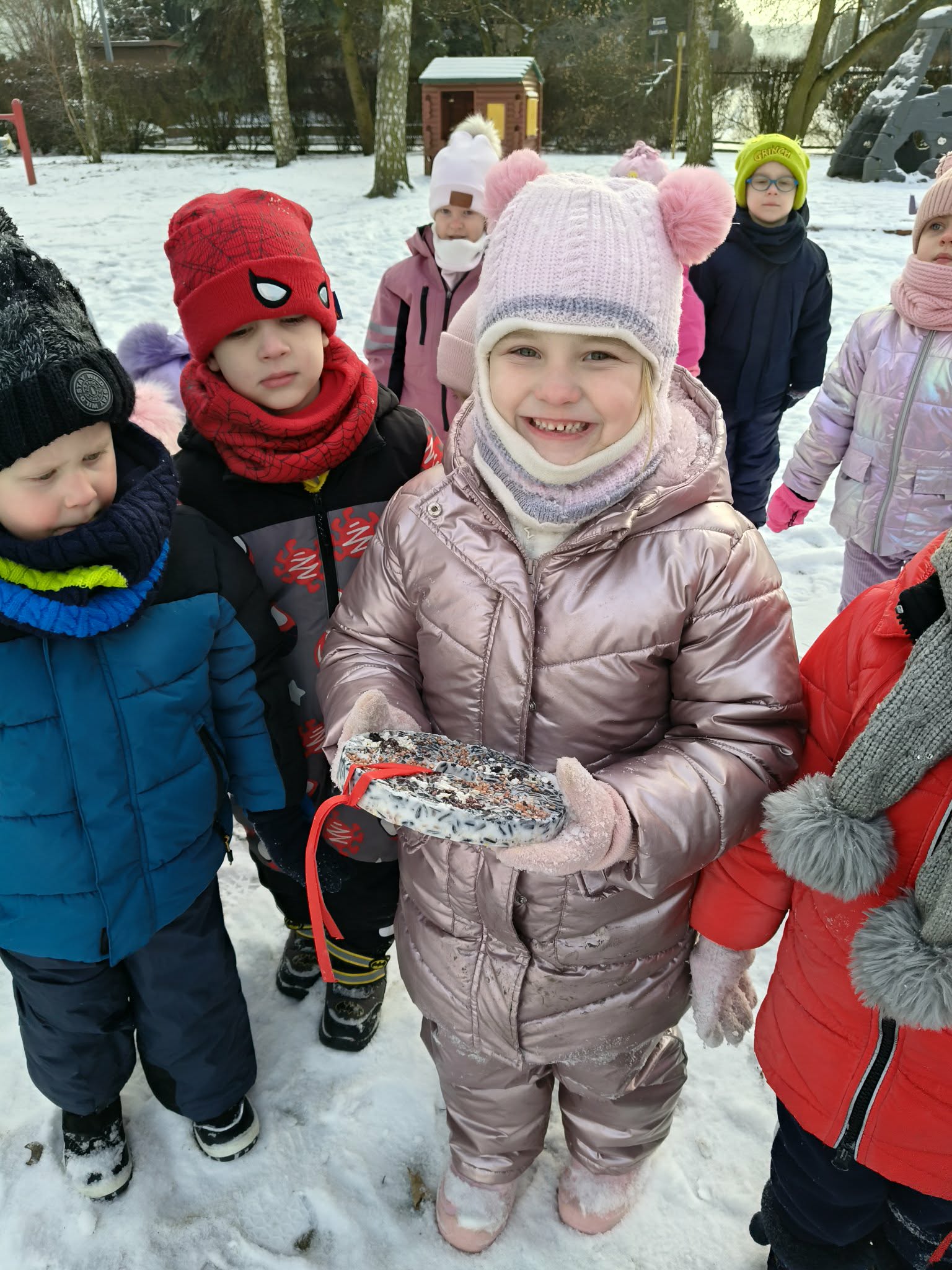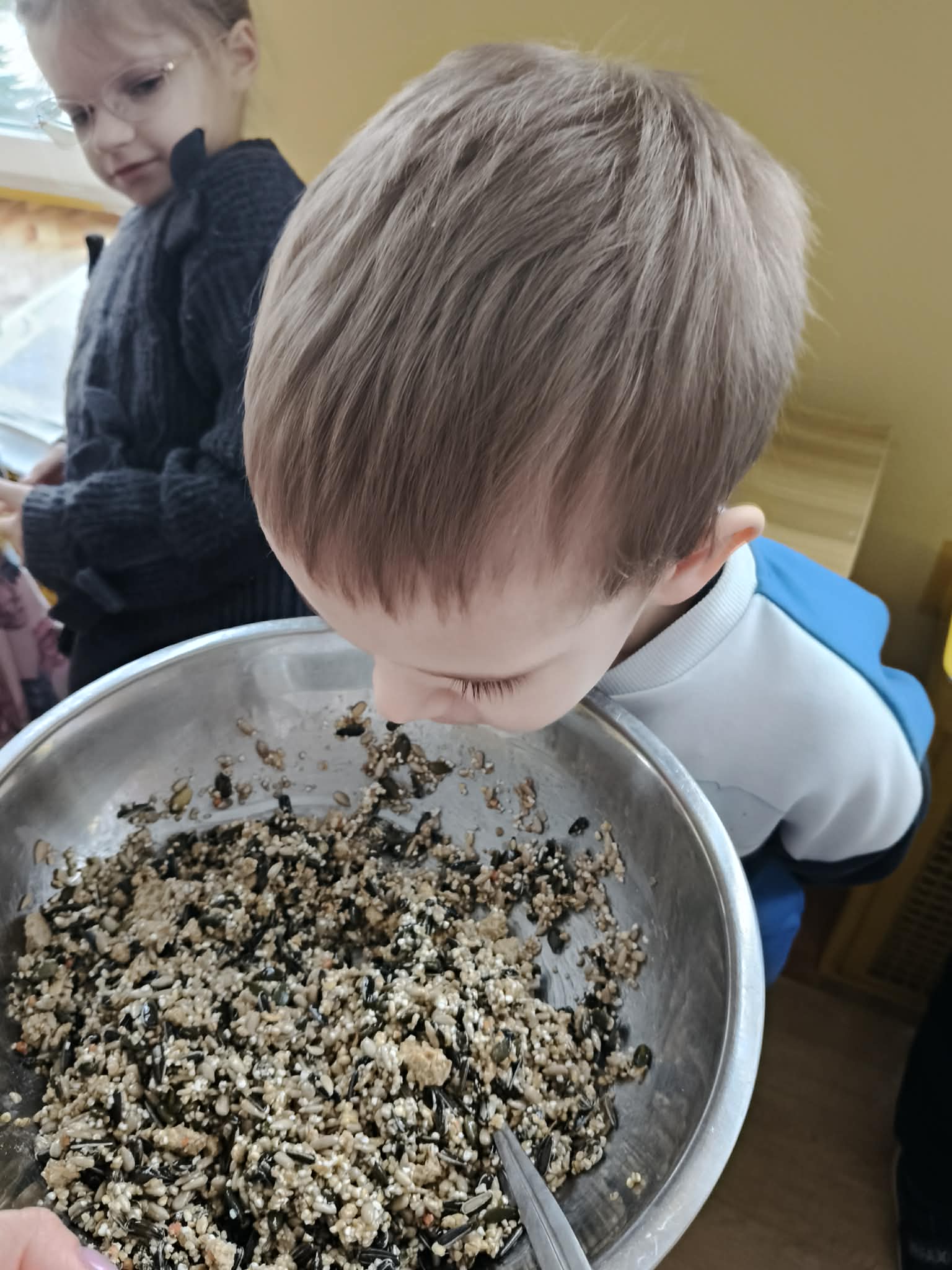 Rozmawialiśmy o tym, jak dokarmiać ptaki zimą i jak o nie dbać. Dzieci poznały zasady bezpiecznego dokarmiania oraz wykonały własne jedzenie dla ptaków.
