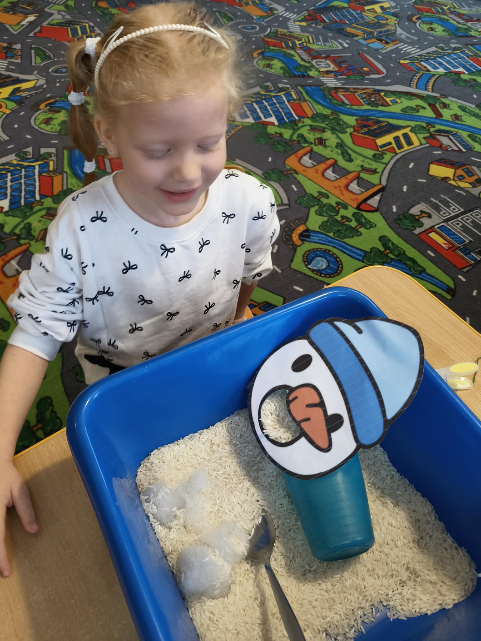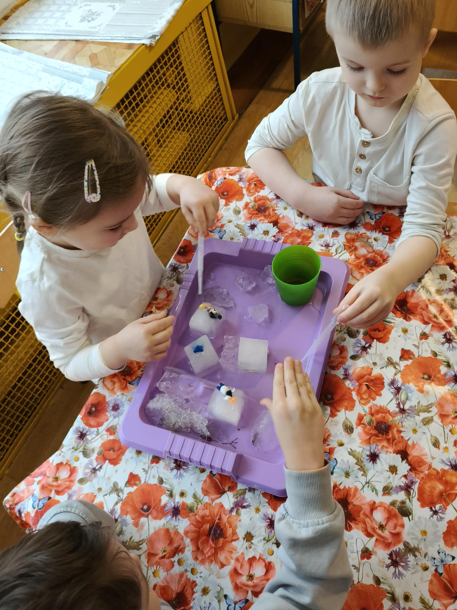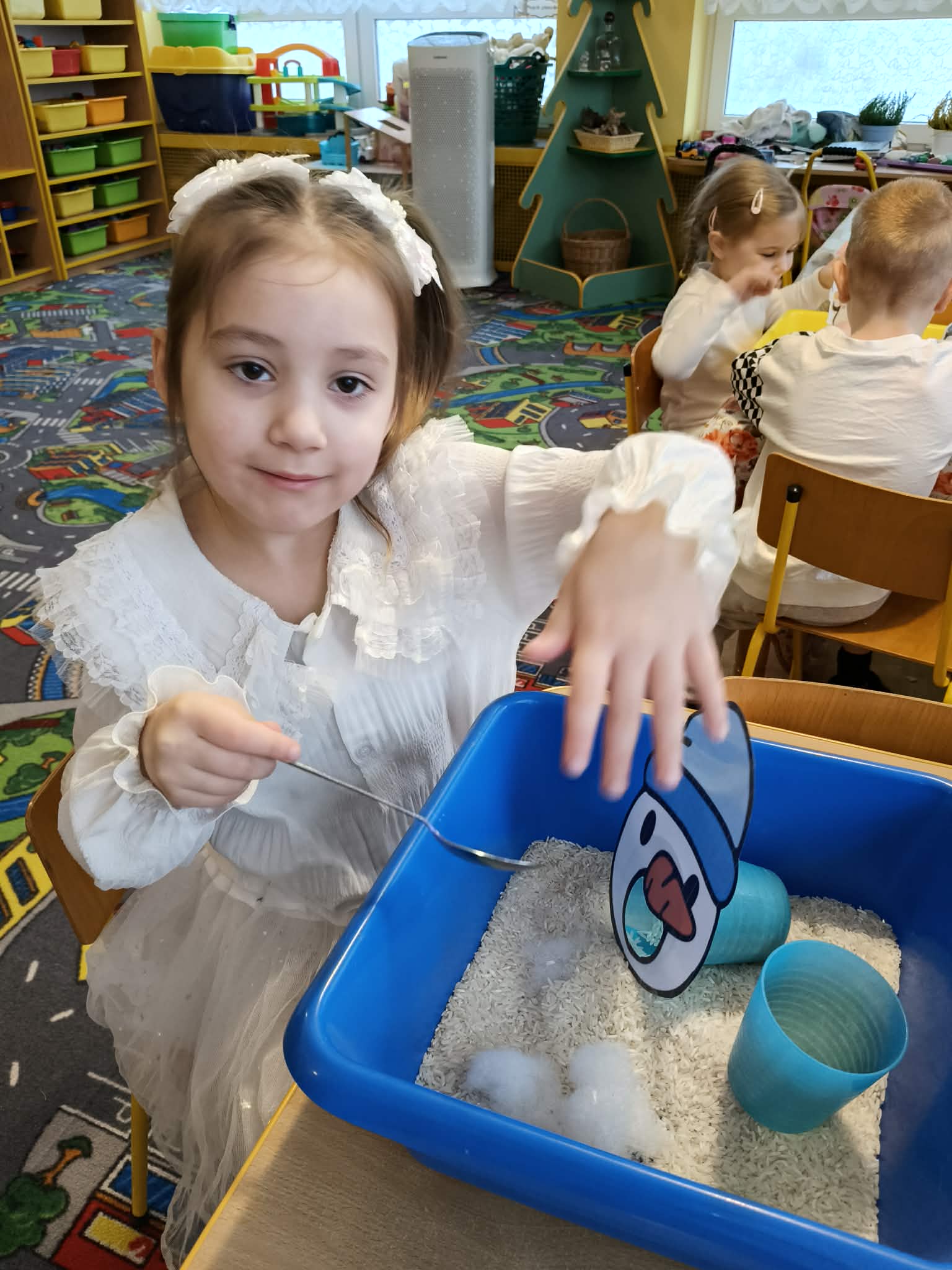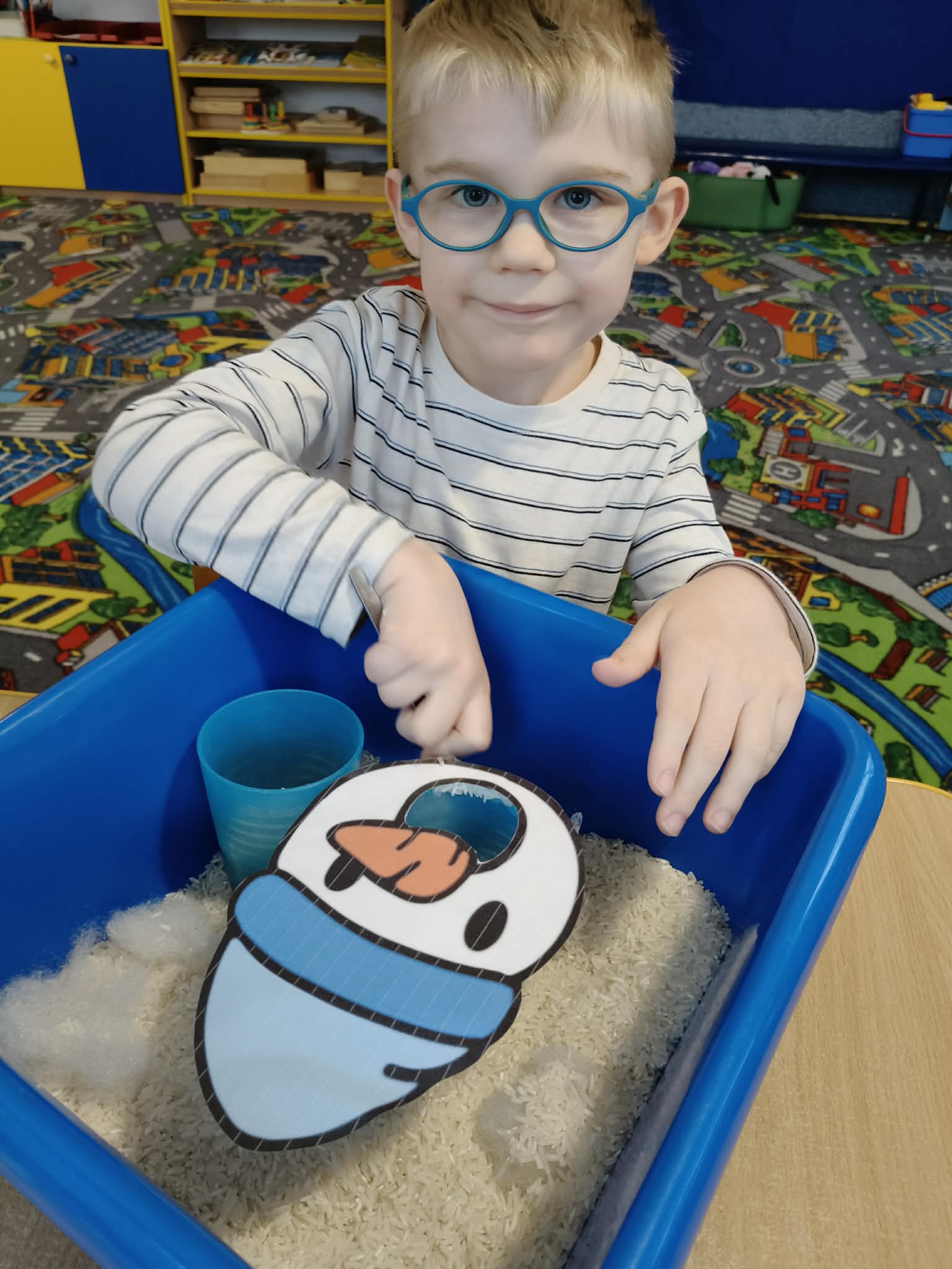 Były zabawy z lodem i ryżem, pisanie literek na kaszy oraz ćwiczenia oddechowe z pingwinkami. Nie zabrakło też innych sensorycznych aktywności i świetnej zabawy 😊❄️