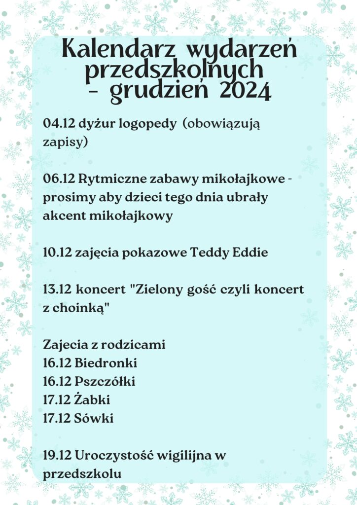 Kalendarz wydarzeń przedszkolnych – grudzień 2024 Post author:pinokioadmin Post published:3 grudnia, 2024 Post category:Aktualności Może ci się spodobać również Kalendarz wydarzeń przedszkolnych – kwiecień 2025 1 kwietnia, 2025 Kalendarz wydarzeń przedszkolnych – czerwiec 2025 1 czerwca, 2025 Akcje charytatywne w przedszkolu 16 września, 2024