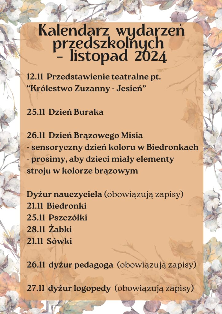 Kalendarz wydarzeń przedszkolnych – listopad 2024 Post author:pinokioadmin Post published:6 listopada, 2024 Post category:Aktualności Może ci się spodobać również Kalendarz wydarzeń przedszkolnych – czerwiec 2025 1 czerwca, 2025 Zebranie z rodzicami 1 września, 2024 Kalendarz wydarzeń przedszkolnych – maj 2025 24 maja, 2025