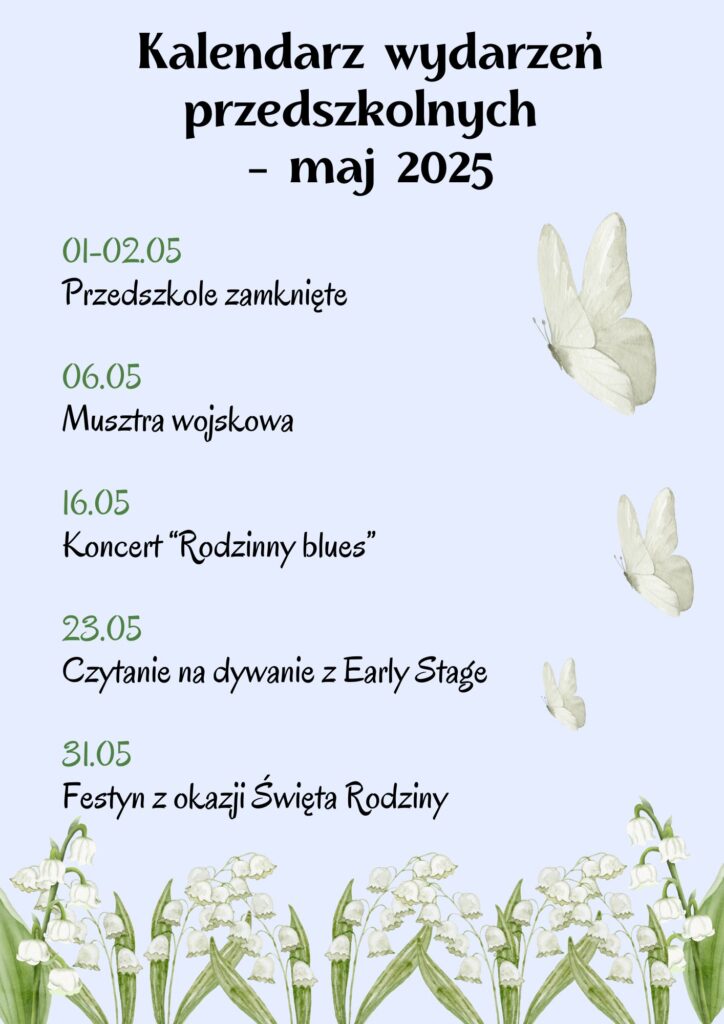 Kalendarz wydarzeń przedszkolnych – maj 2025 Post author:pinokioadmin Post published:24 maja, 2025 Post category:Aktualności Może ci się spodobać również Akcja wsparcia dla powodzian 16 września, 2024 Harmonogram zajęć z Robotyki i Legoedukacji 1 października, 2024 Dzień Kundelka 23 października, 2024