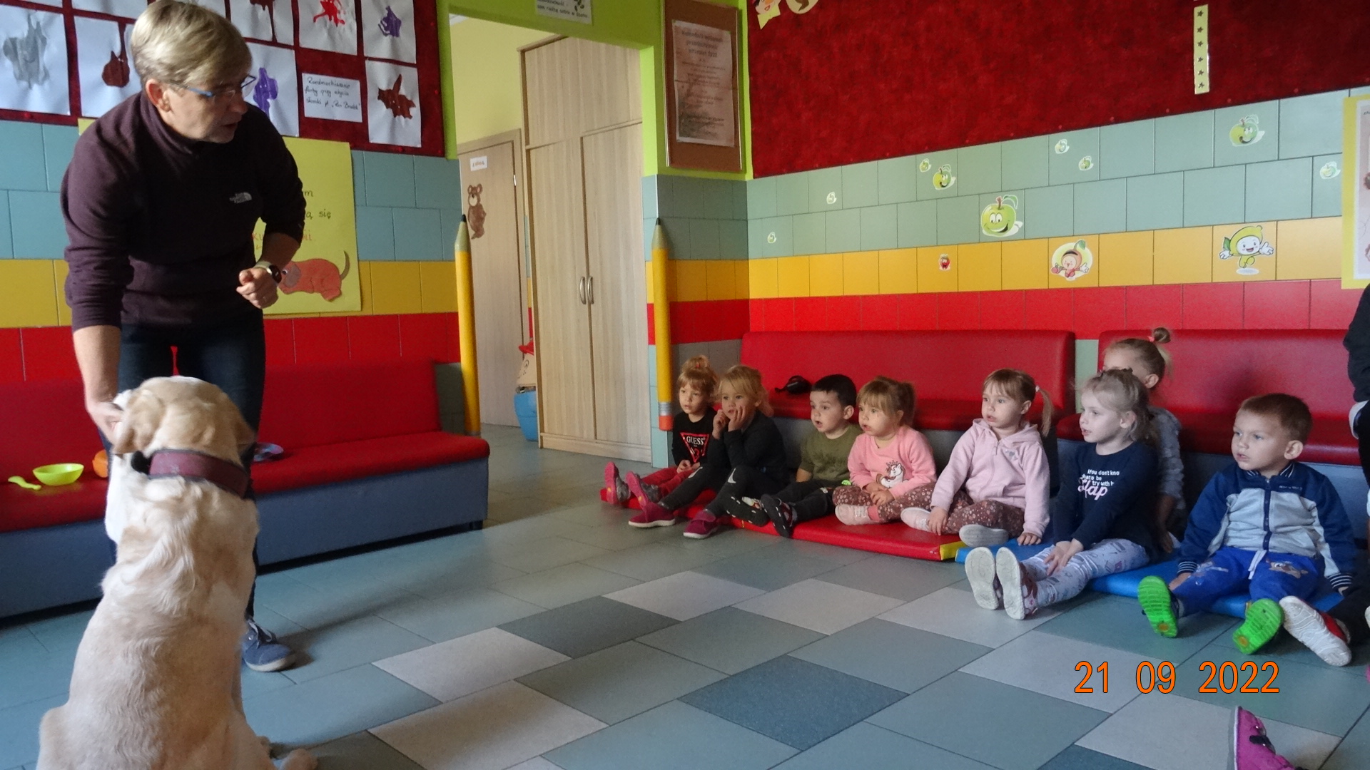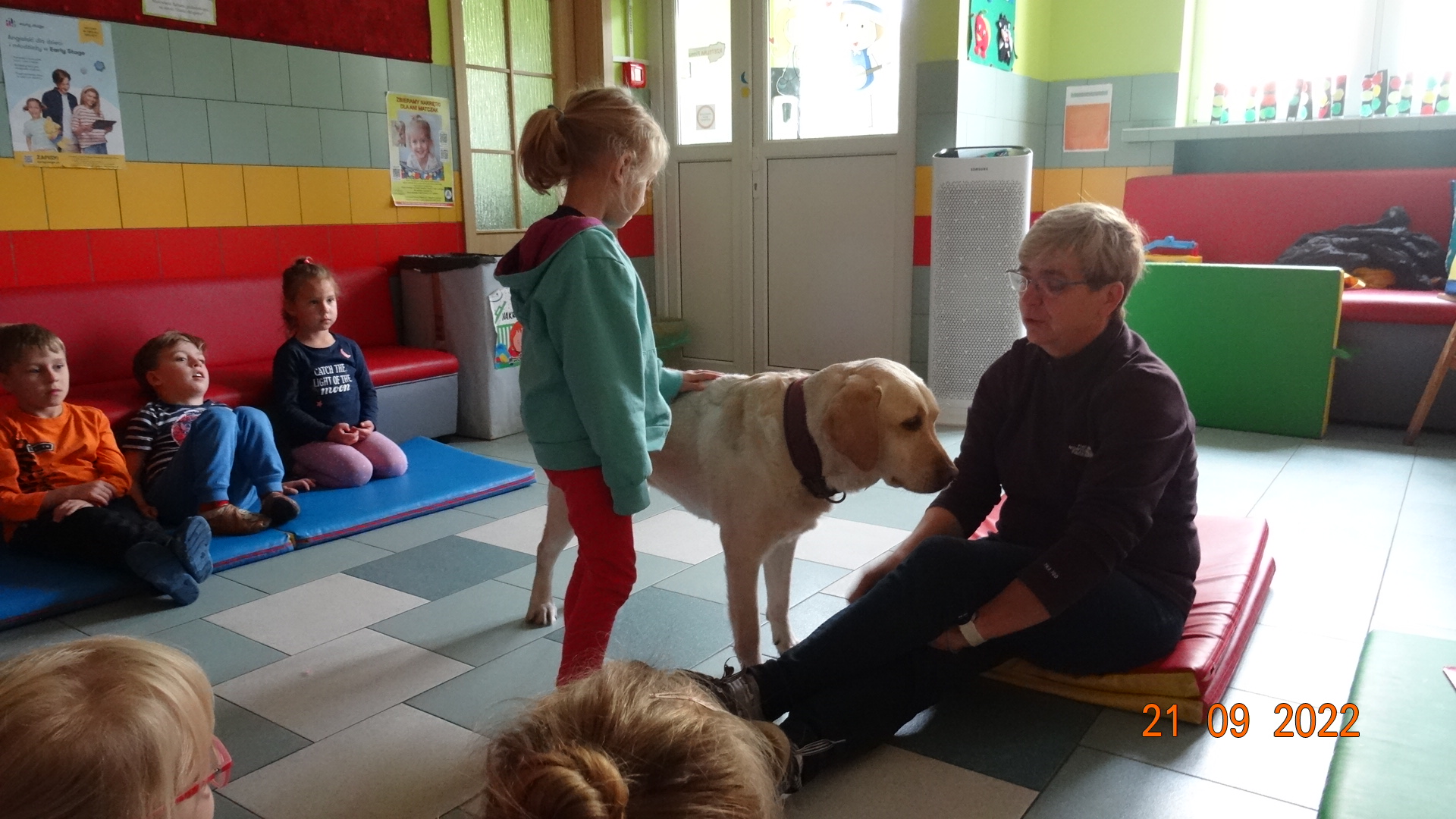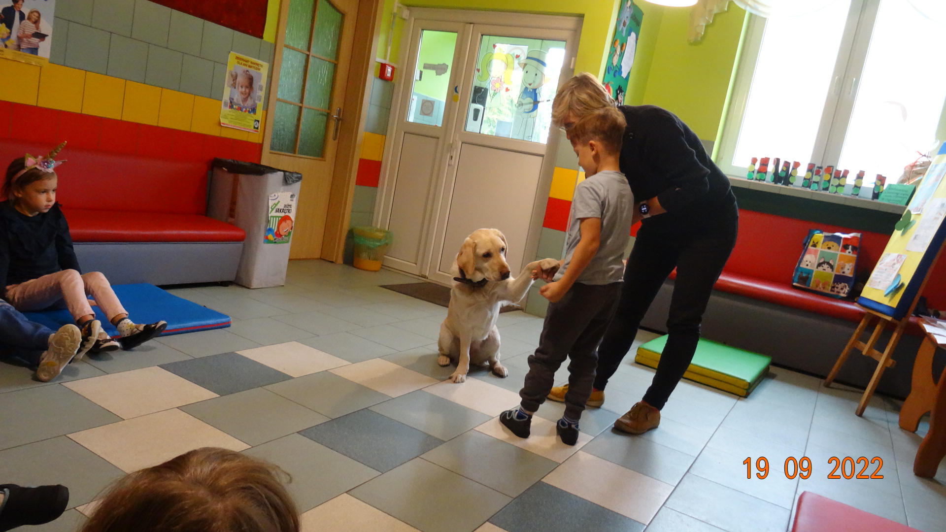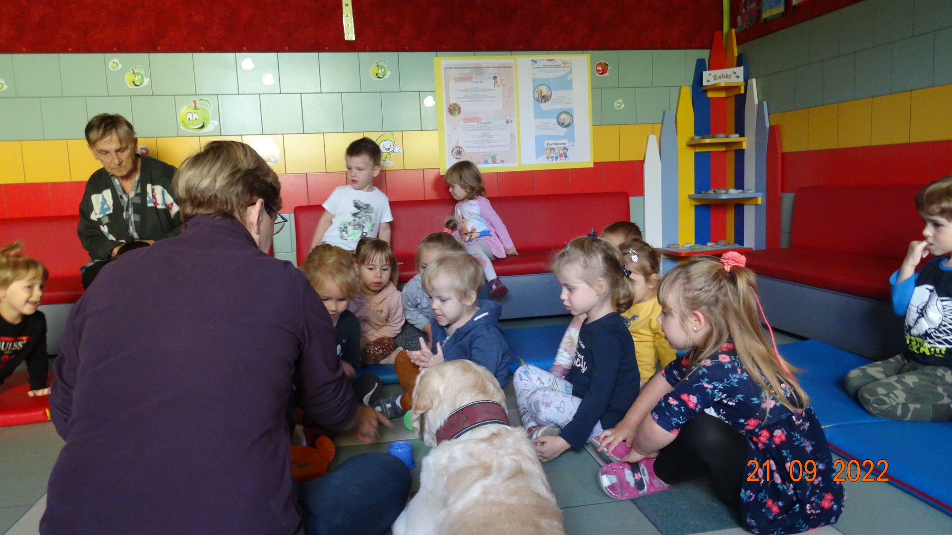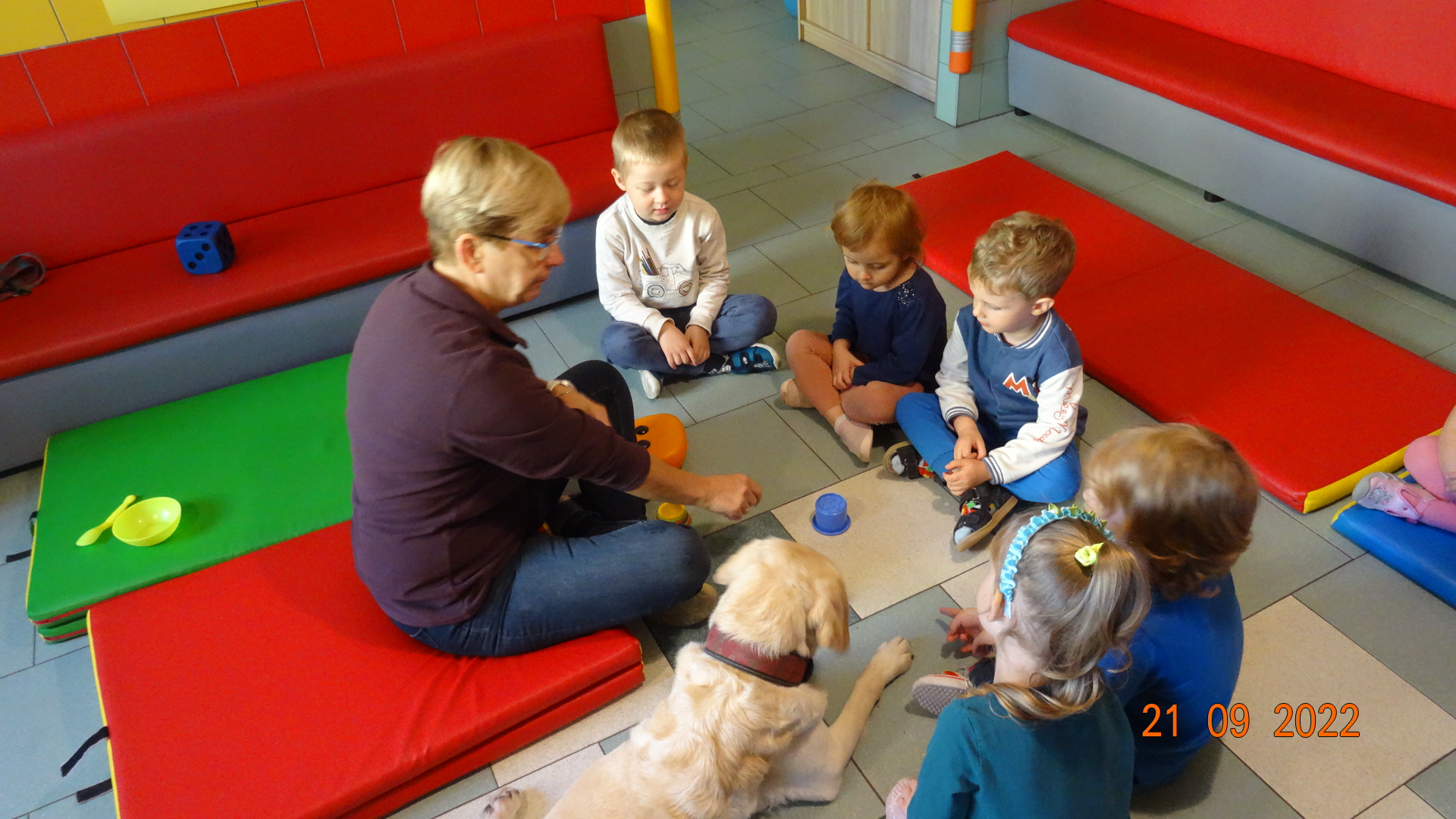 We wrześniu w przedszkolu miały miejsce pierwsze zajęcia z kynoterapii. W czasie spotkania dzieci nauczyły się prawidłowego kontaktu z psem, poznały jego potrzeby i wzmacniały empatię względem zwierząt. Poza tym takie spotkanie z psem to świetna okazja do relaksacji i wyciszenia, a także motywacja do działań w zakresie usprawniania funkcji motorycznych.