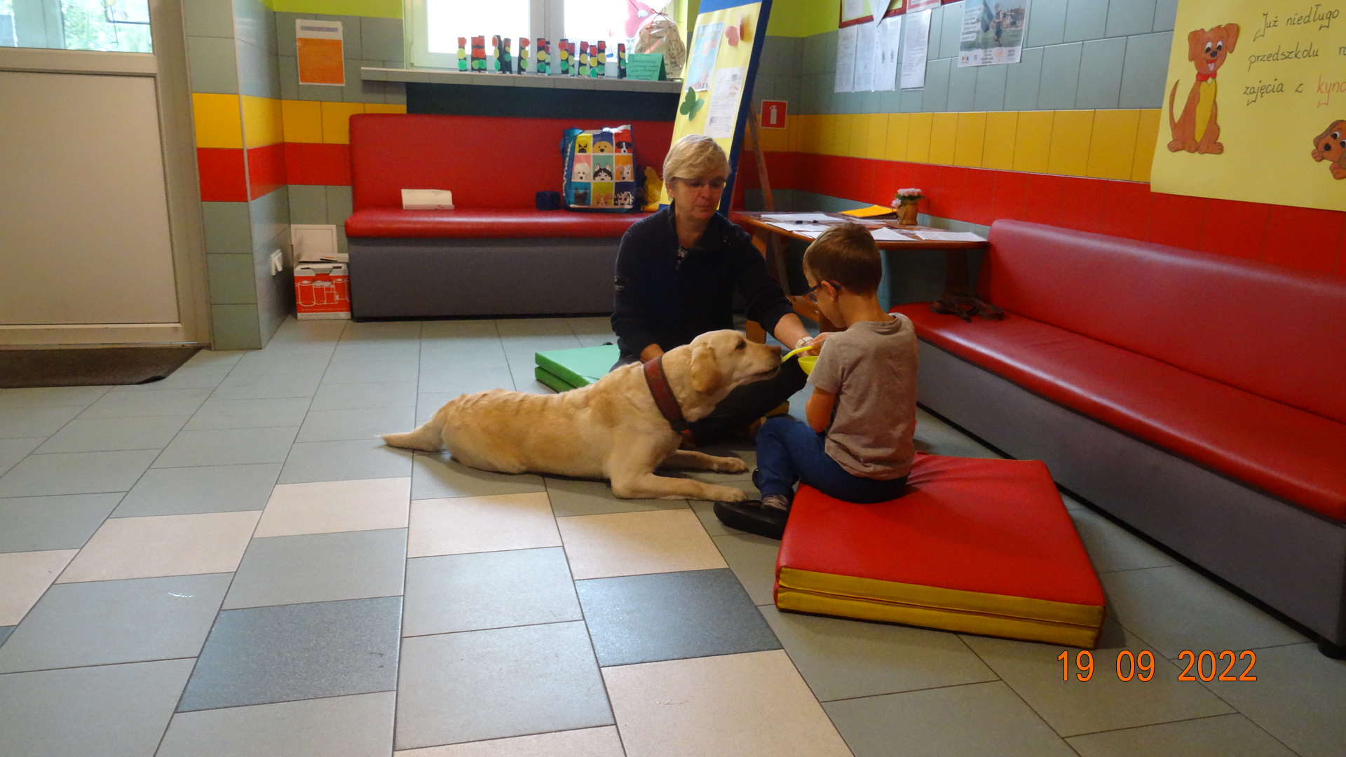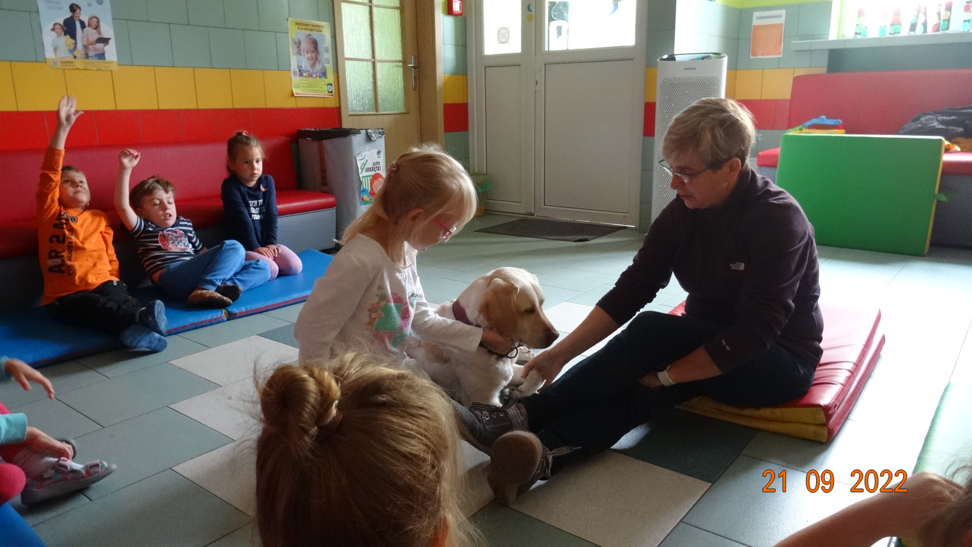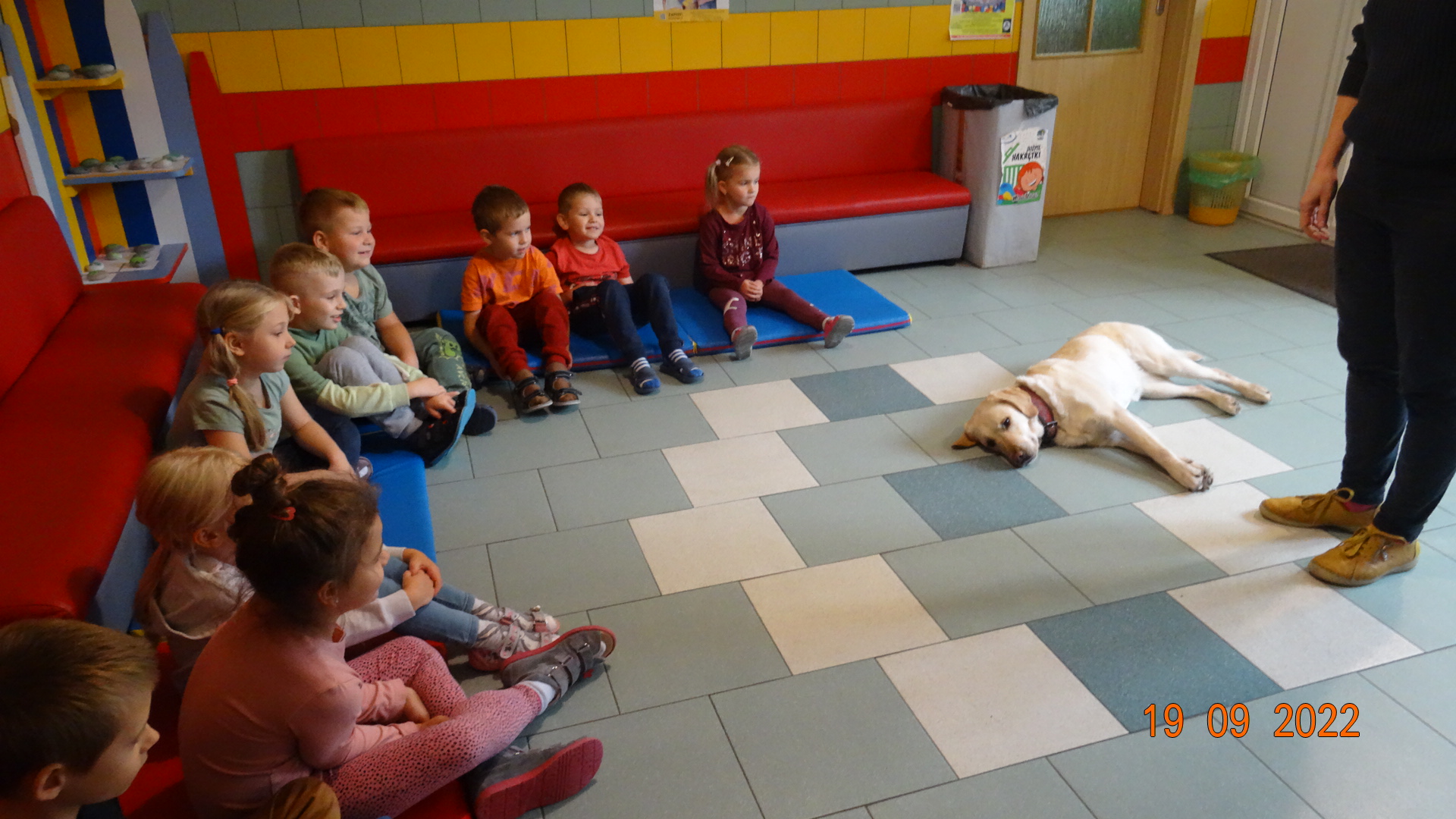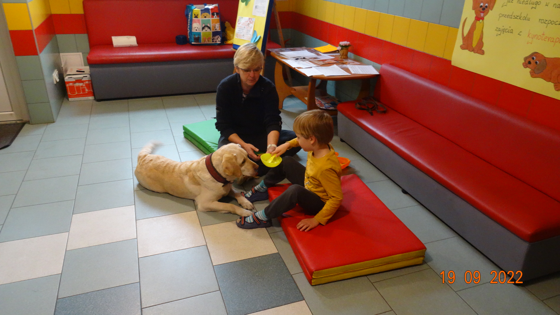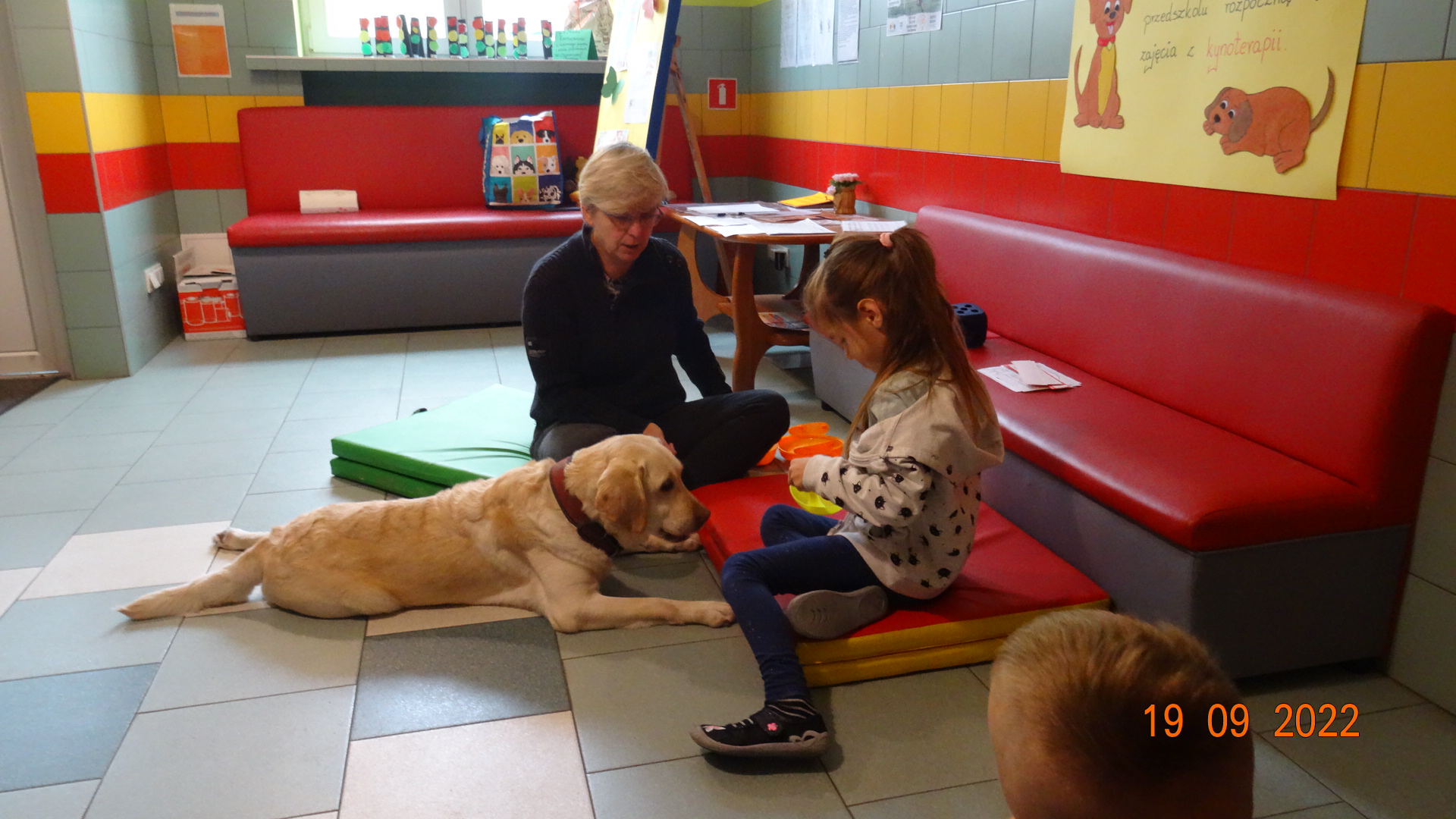 We wrześniu w przedszkolu miały miejsce pierwsze zajęcia z kynoterapii. W czasie spotkania dzieci nauczyły się prawidłowego kontaktu z psem, poznały jego potrzeby i wzmacniały empatię względem zwierząt. Poza tym takie spotkanie z psem to świetna okazja do relaksacji i wyciszenia, a także motywacja do działań w zakresie usprawniania funkcji motorycznych.