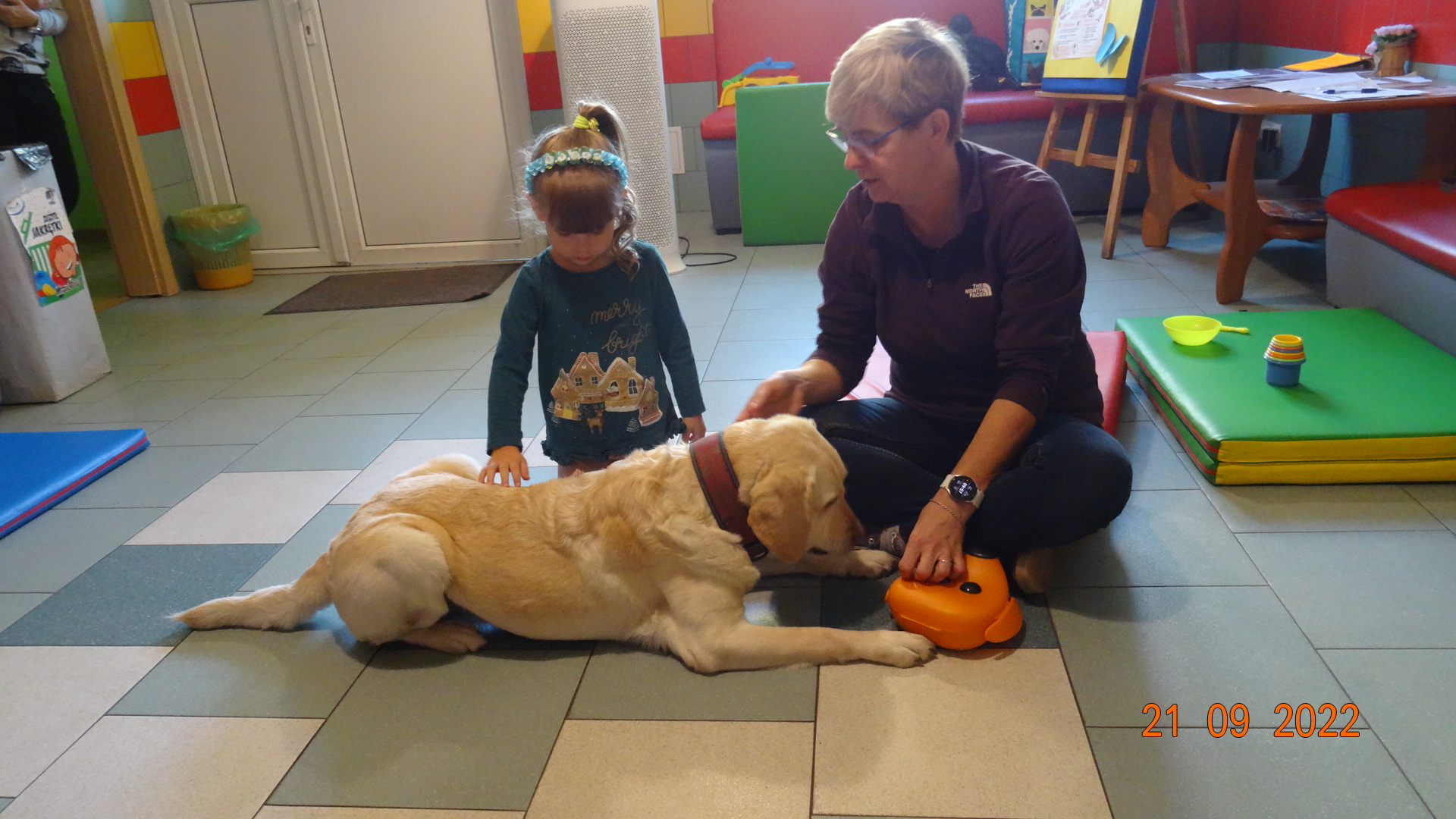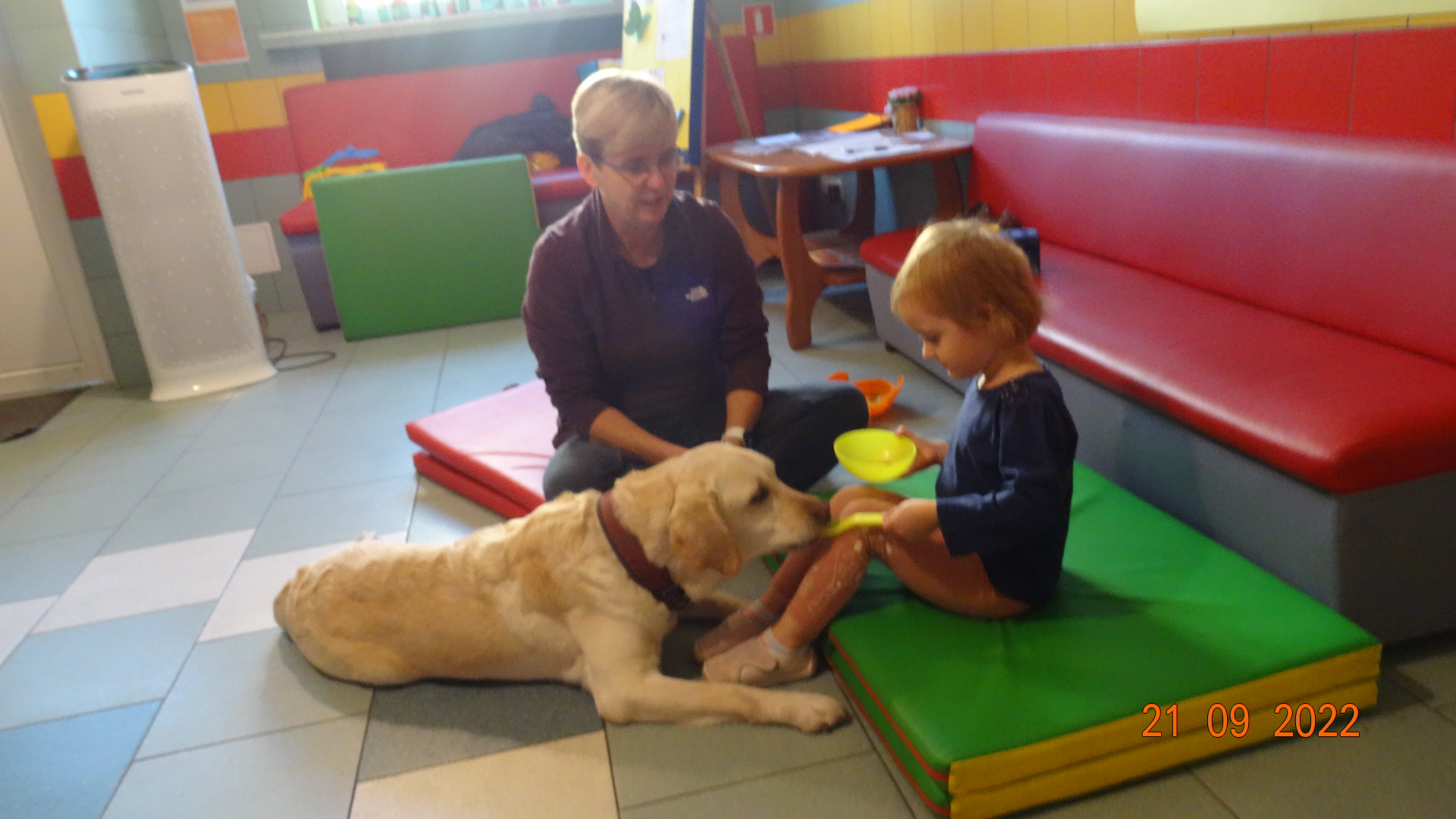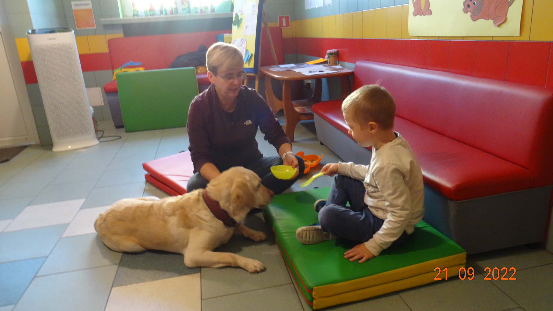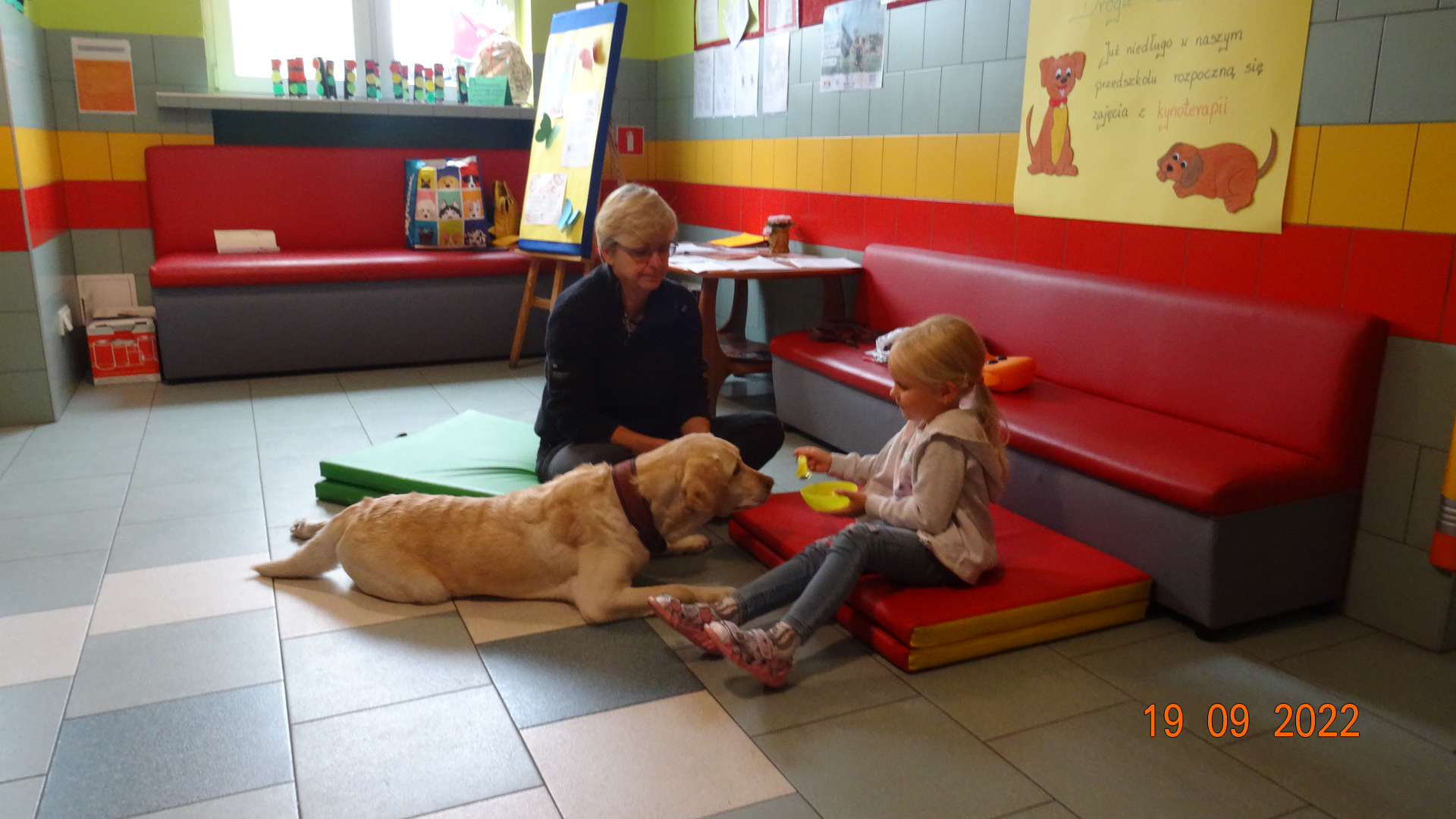 We wrześniu w przedszkolu miały miejsce pierwsze zajęcia z kynoterapii. W czasie spotkania dzieci nauczyły się prawidłowego kontaktu z psem, poznały jego potrzeby i wzmacniały empatię względem zwierząt. Poza tym takie spotkanie z psem to świetna okazja do relaksacji i wyciszenia, a także motywacja do działań w zakresie usprawniania funkcji motorycznych.