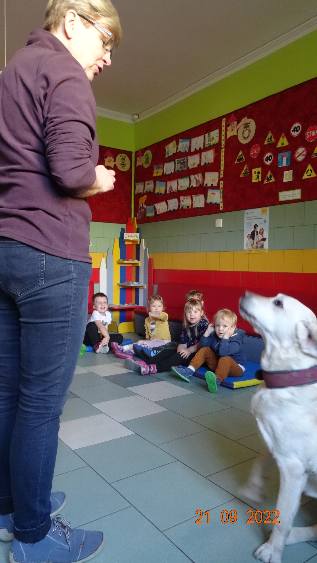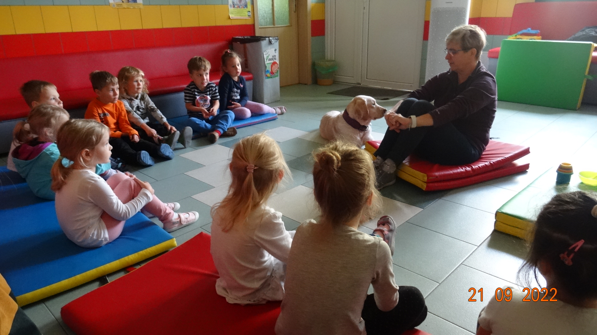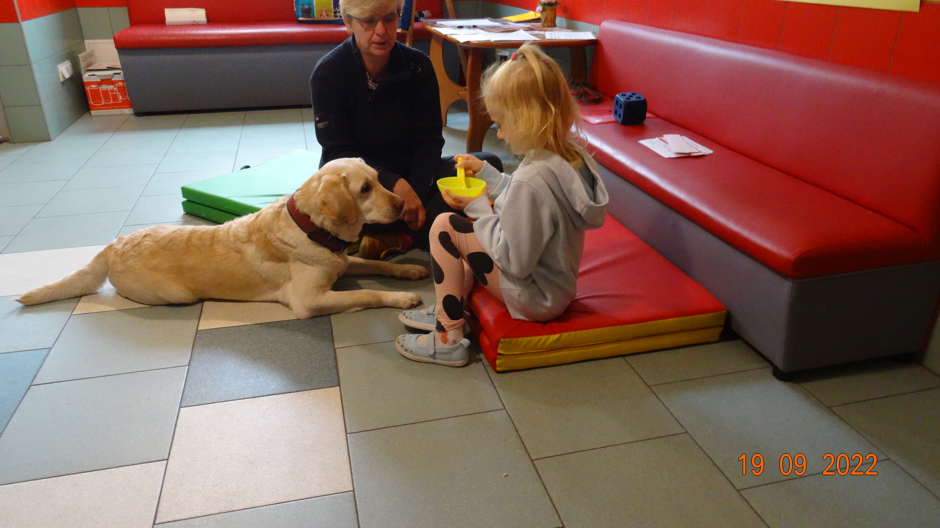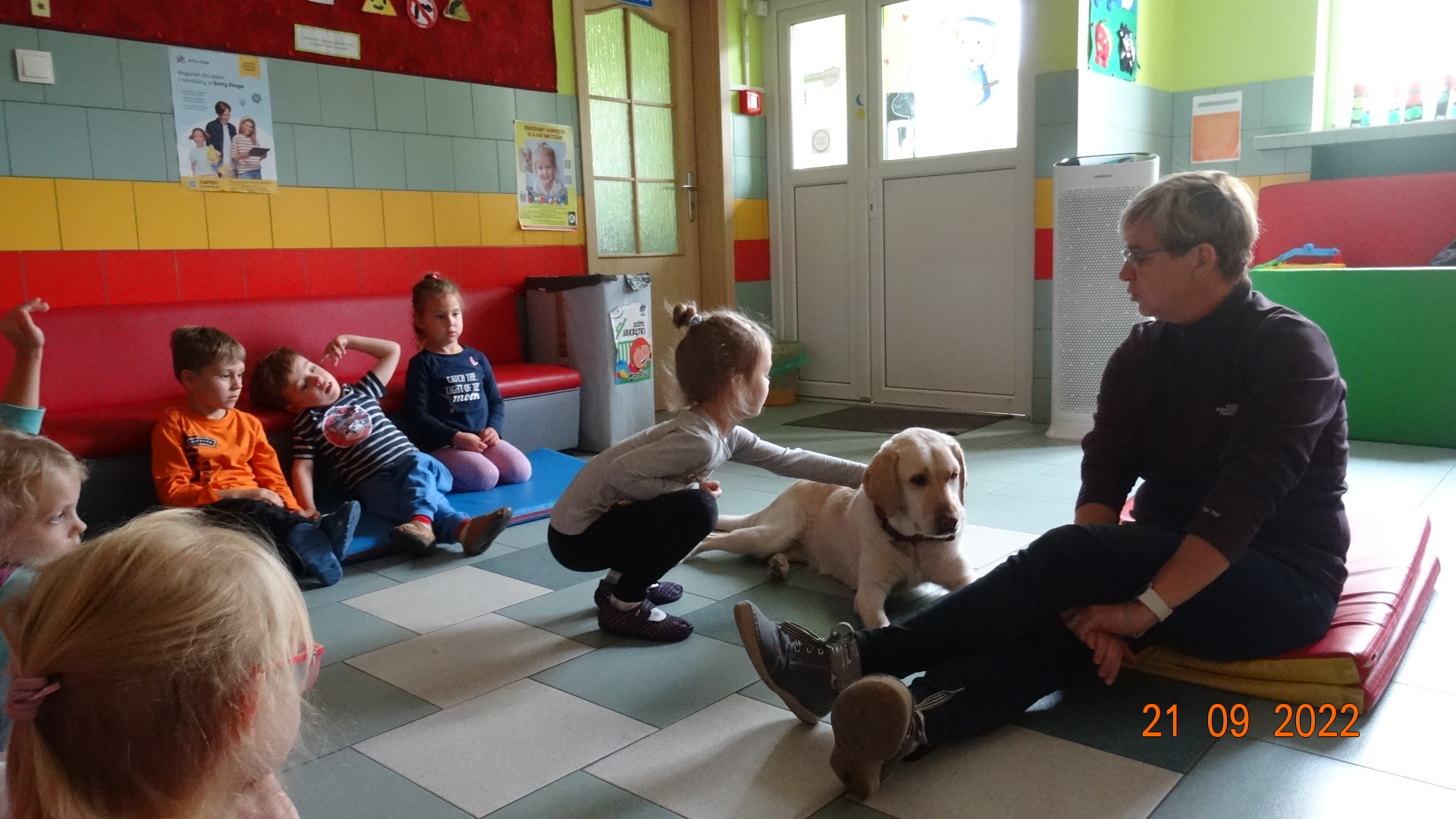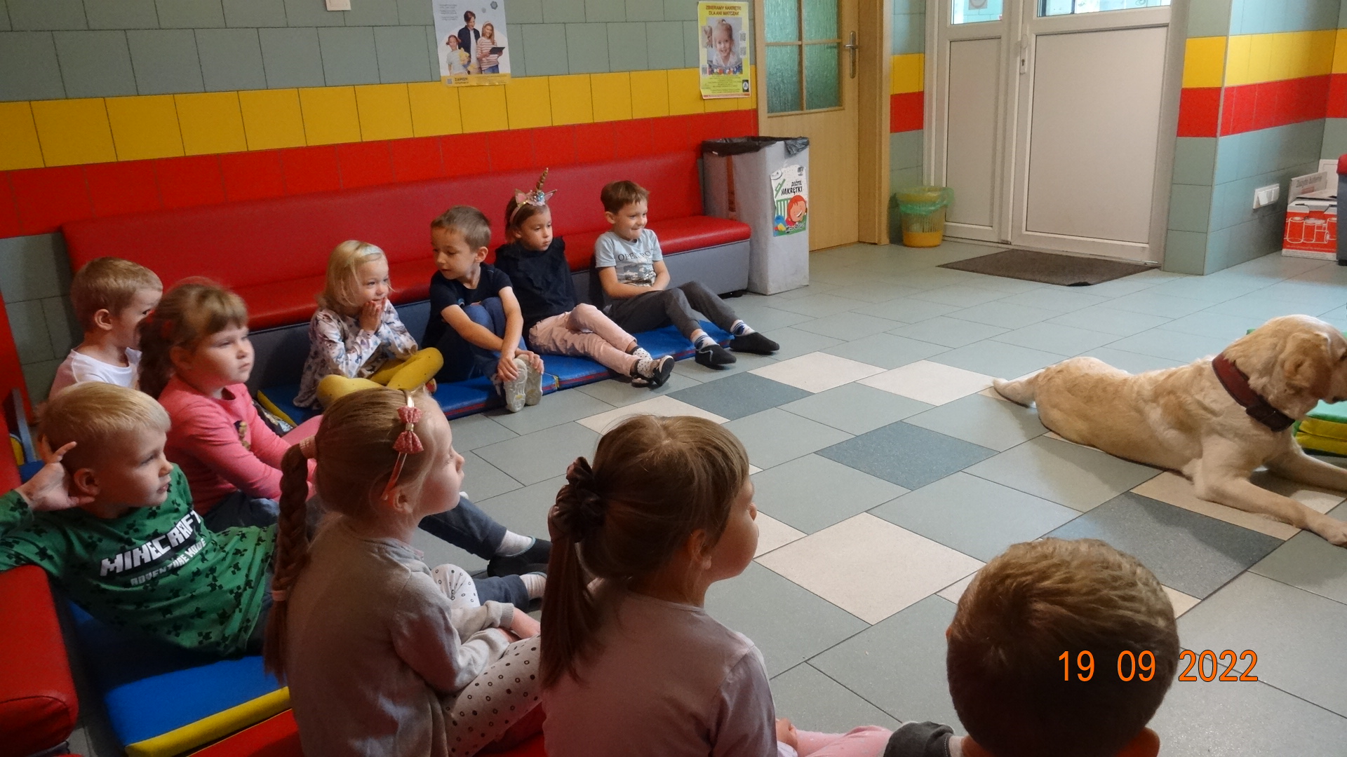 We wrześniu w przedszkolu miały miejsce pierwsze zajęcia z kynoterapii. W czasie spotkania dzieci nauczyły się prawidłowego kontaktu z psem, poznały jego potrzeby i wzmacniały empatię względem zwierząt. Poza tym takie spotkanie z psem to świetna okazja do relaksacji i wyciszenia, a także motywacja do działań w zakresie usprawniania funkcji motorycznych.