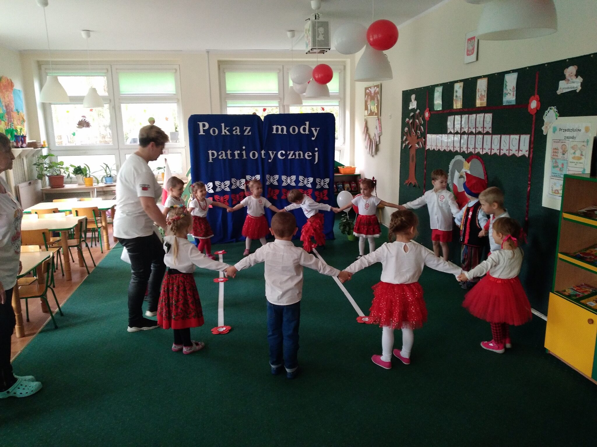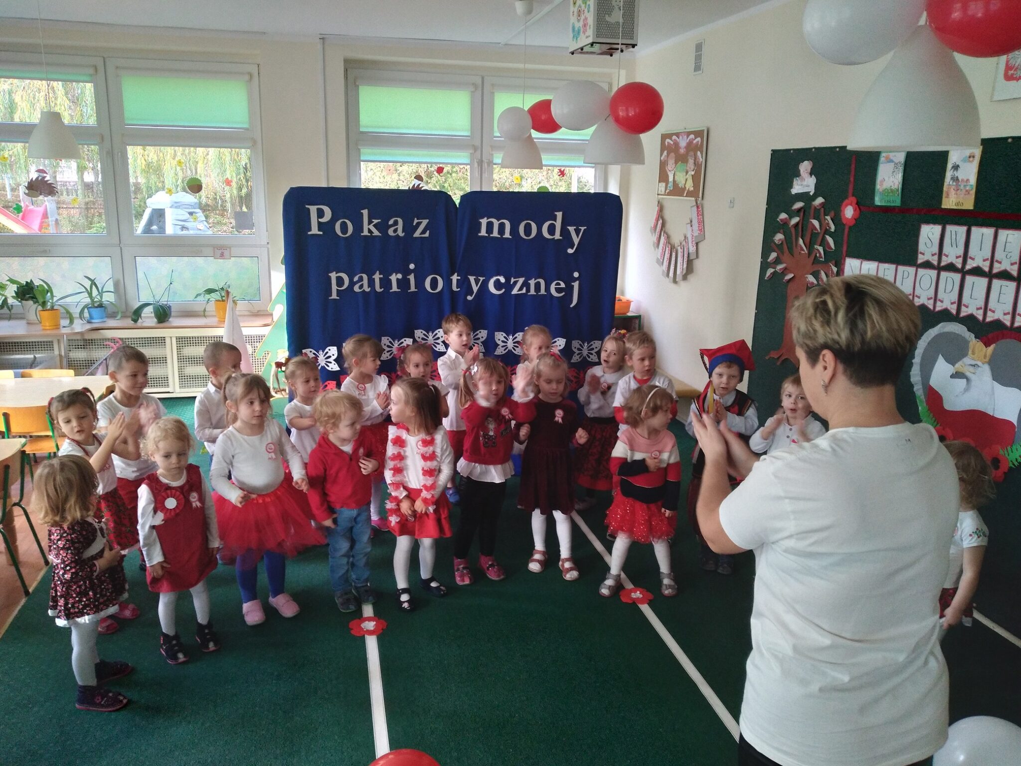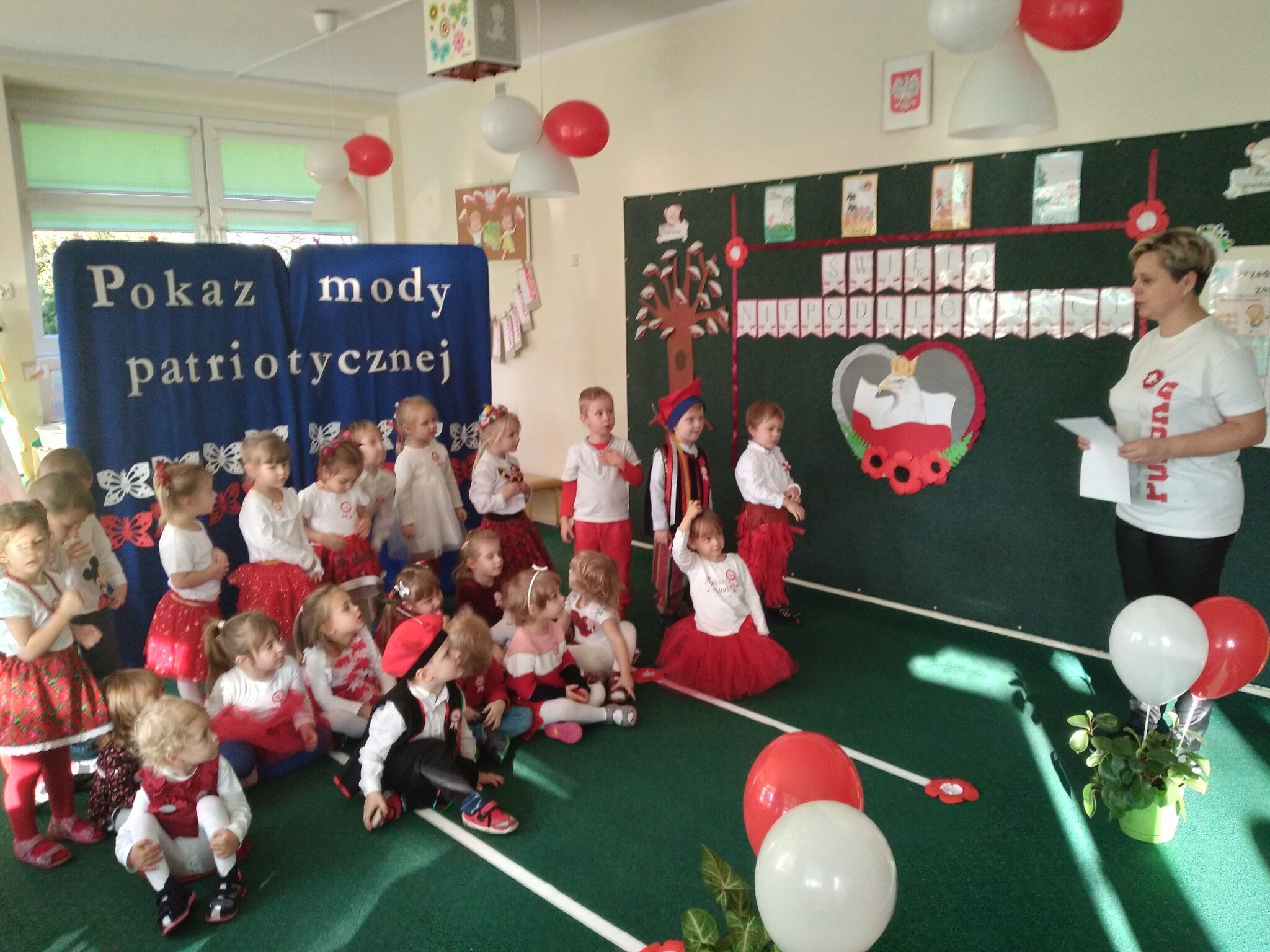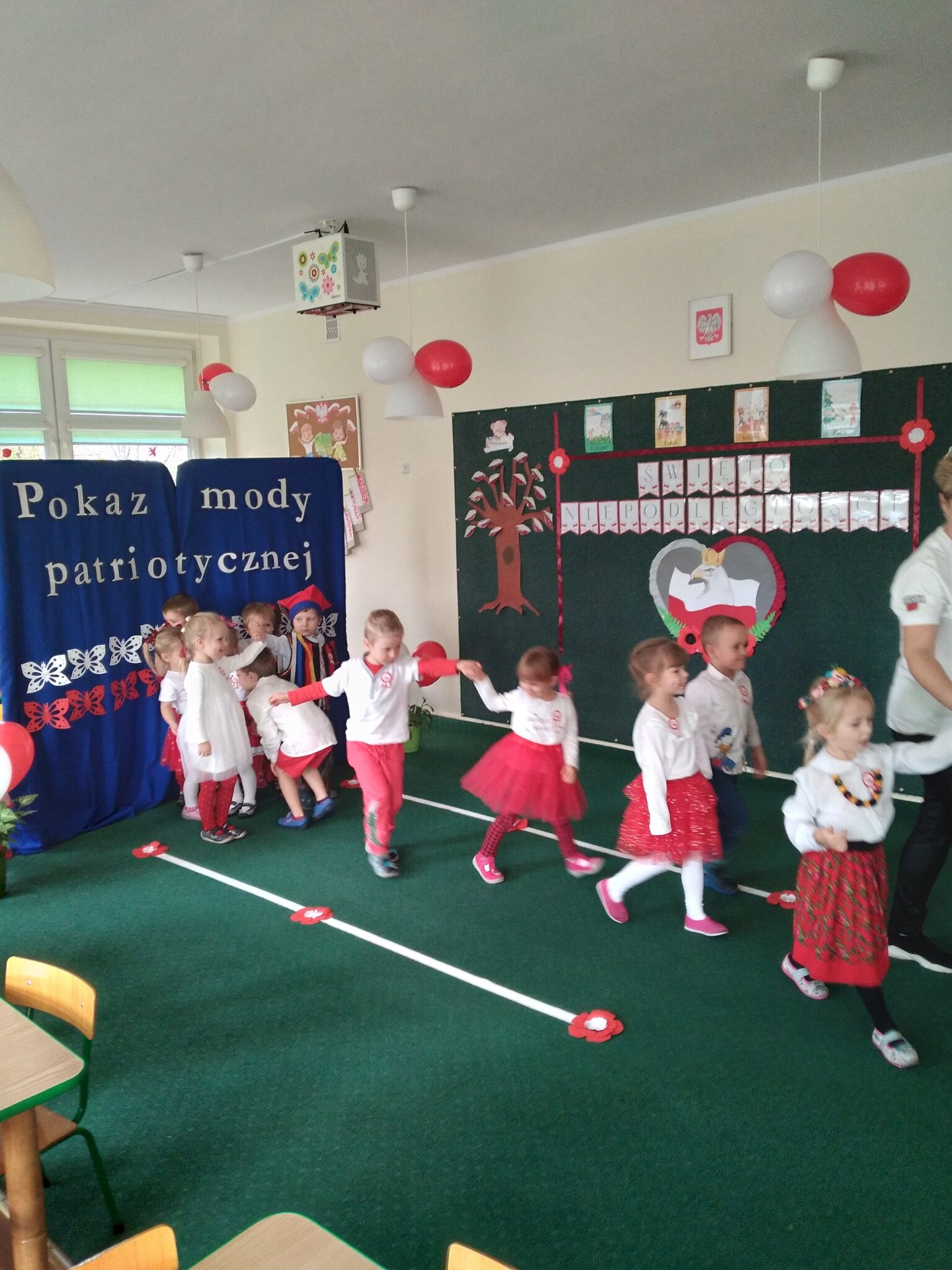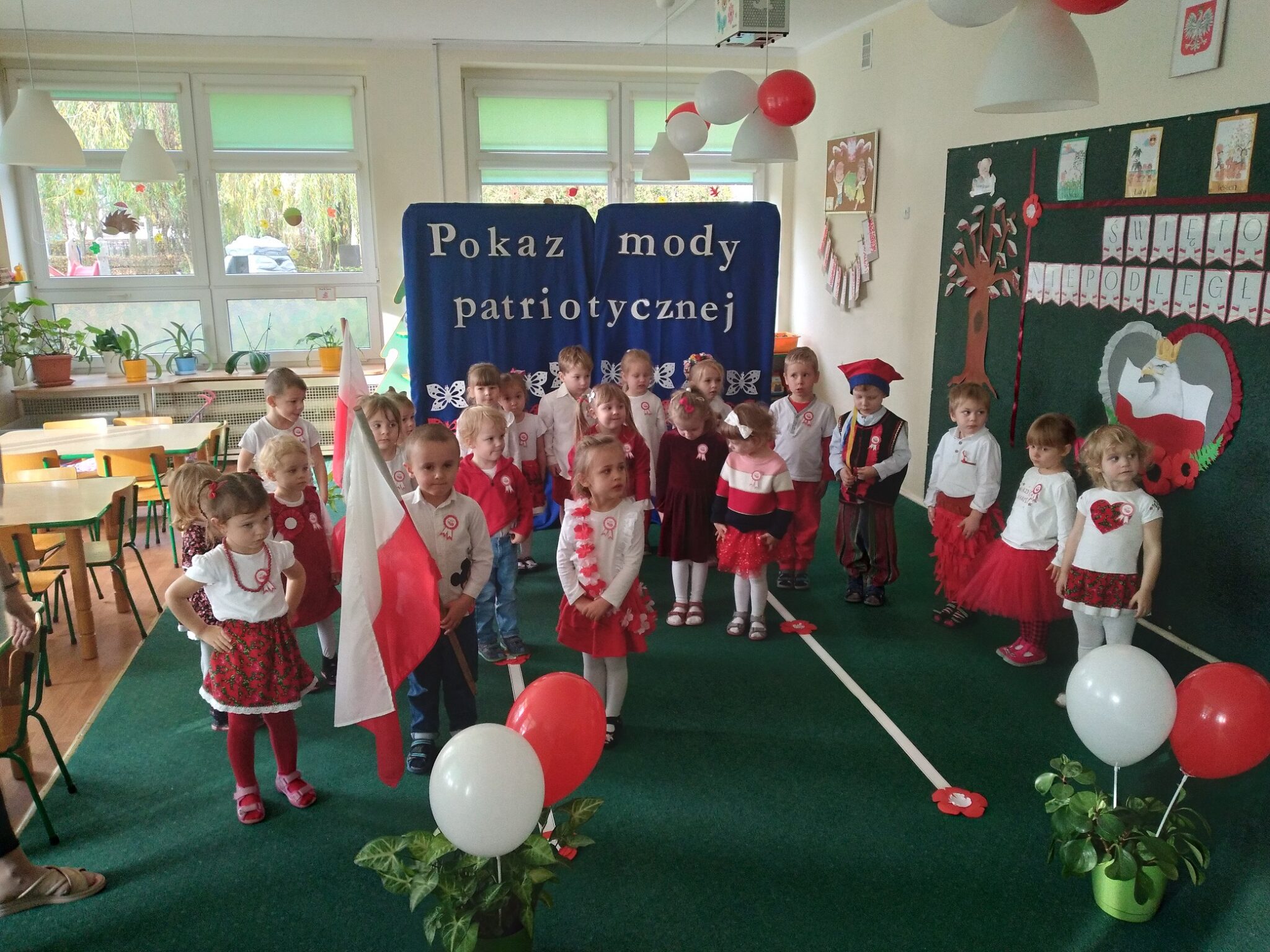 Punktem kulminacyjnym obchodów był pokaz strojów patriotycznych. W ten dzień przedszkolna sala zamieniła się w wybieg, a przedszkolaki w modelki i modeli, którzy przy dźwiękach muzyki, prezentowali swe piękne stroje. Wśród strojów dominowały stroje ludowe i w barwach narodowych.