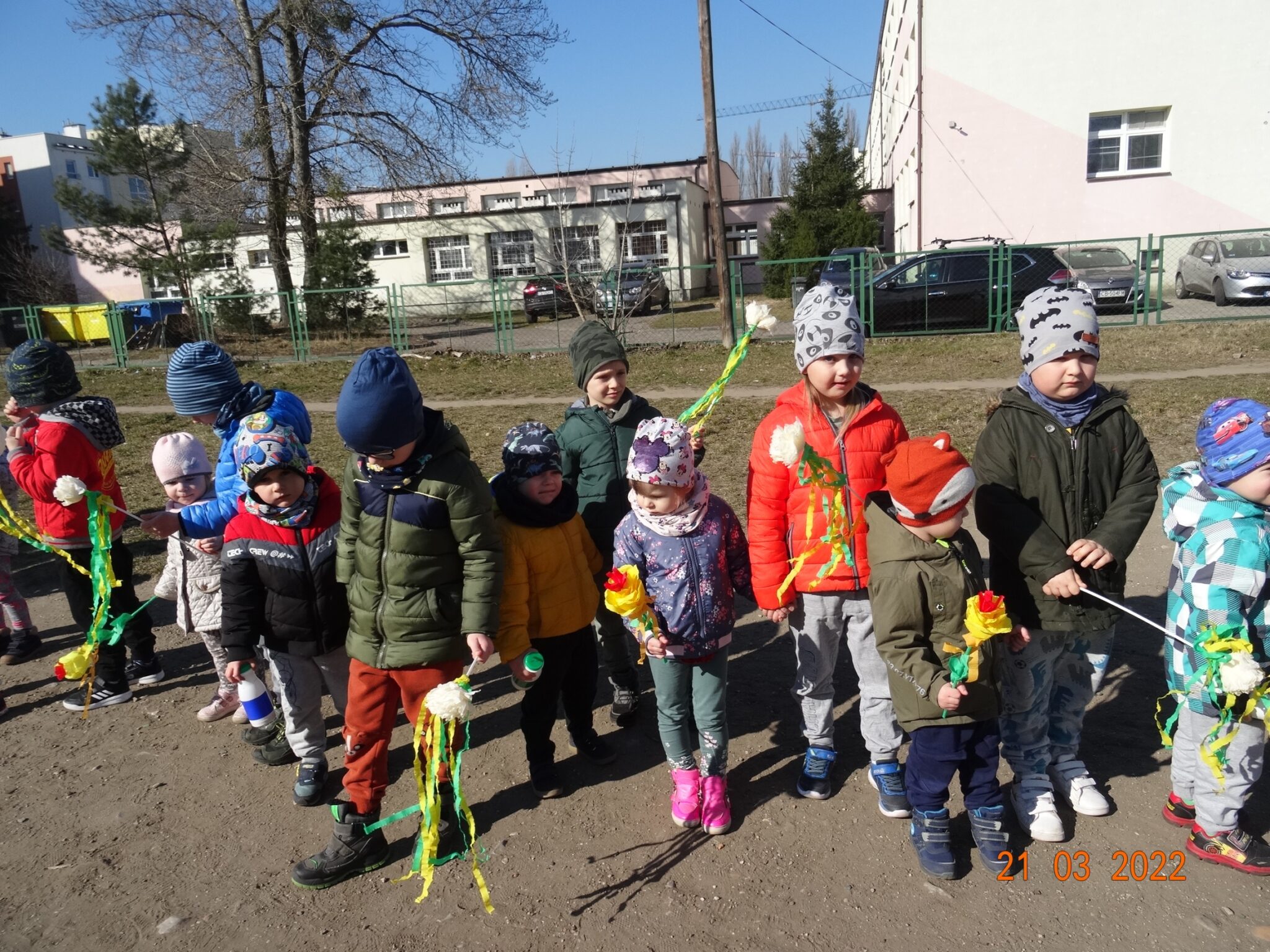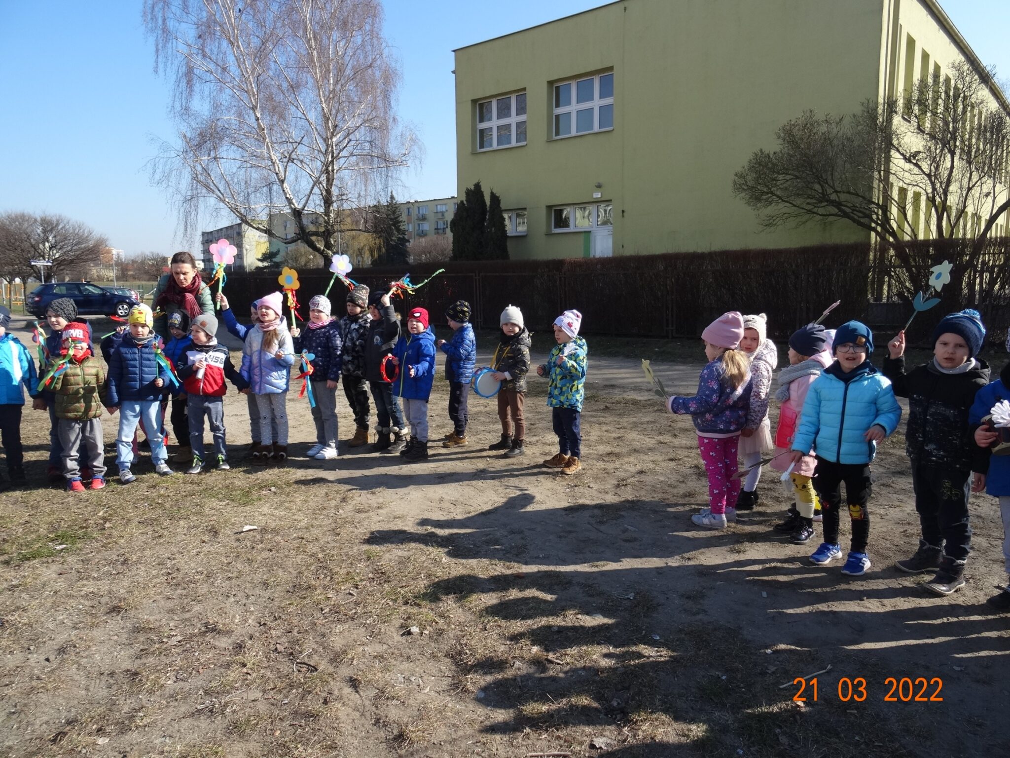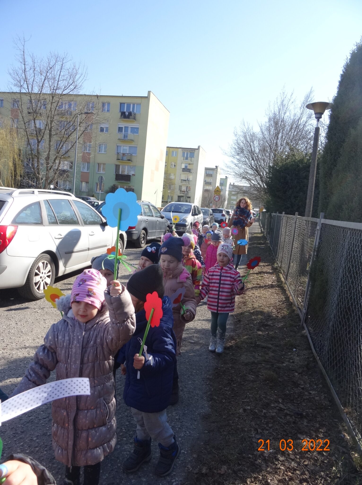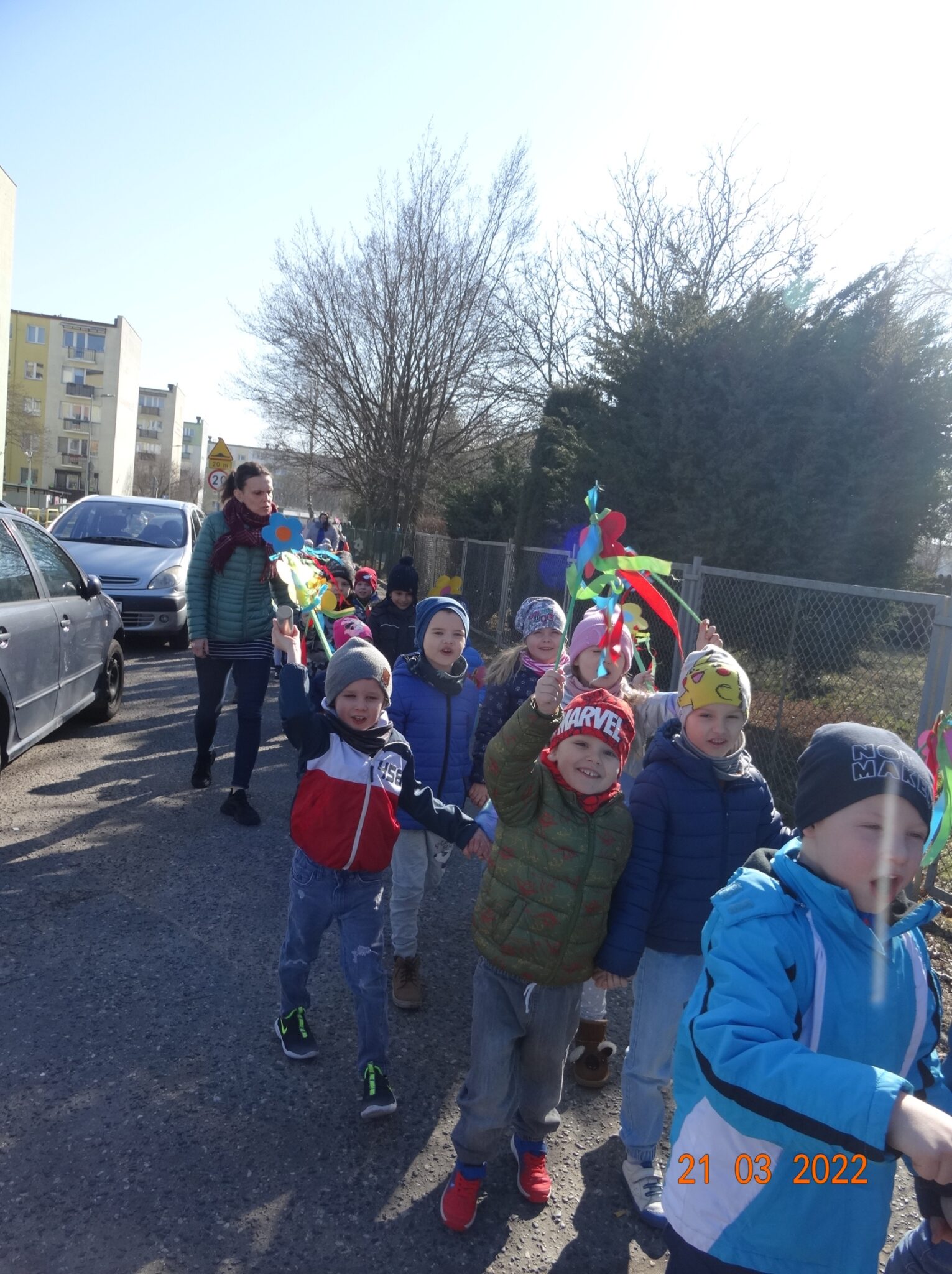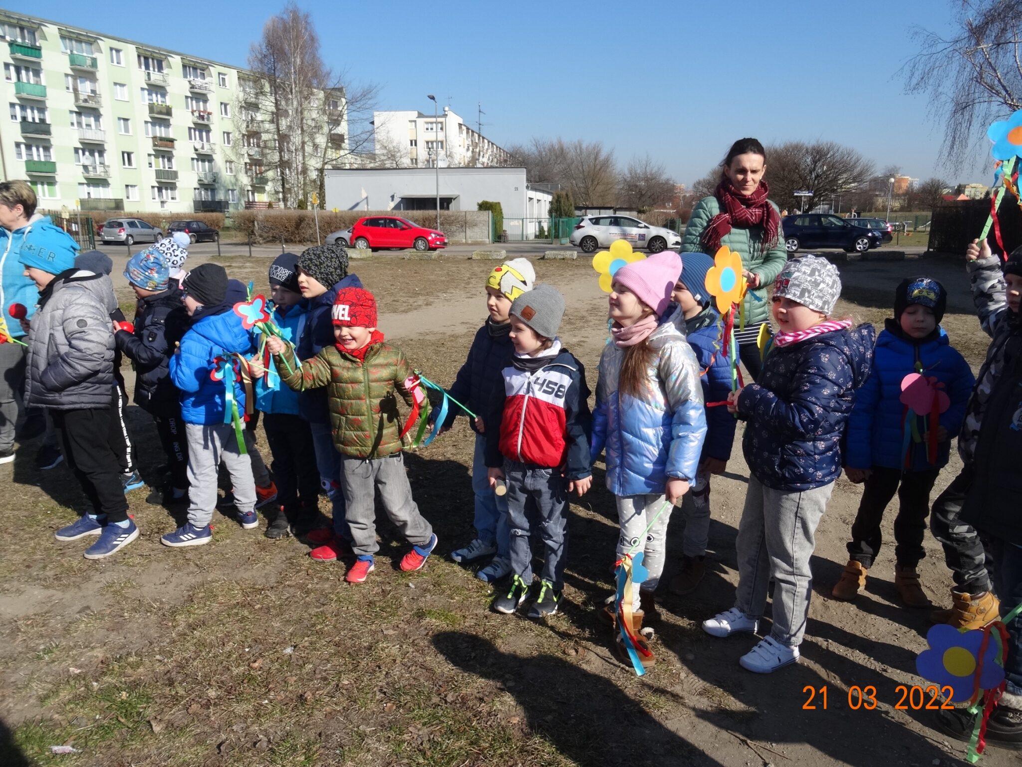 W końcu nadszedł długo wyczekiwany przez przedszkolaków pierwszy dzień wiosny. W tym dniu wszystkie grupy, wraz ze swoimi paniami wyruszyły barwnym korowodem po najbliższej okolicy przedszkola, trzymając w rękach kolorowe kwiatki i gaiki. W taki oto sposób wyraziły swoją radość z nadejścia wiosny.