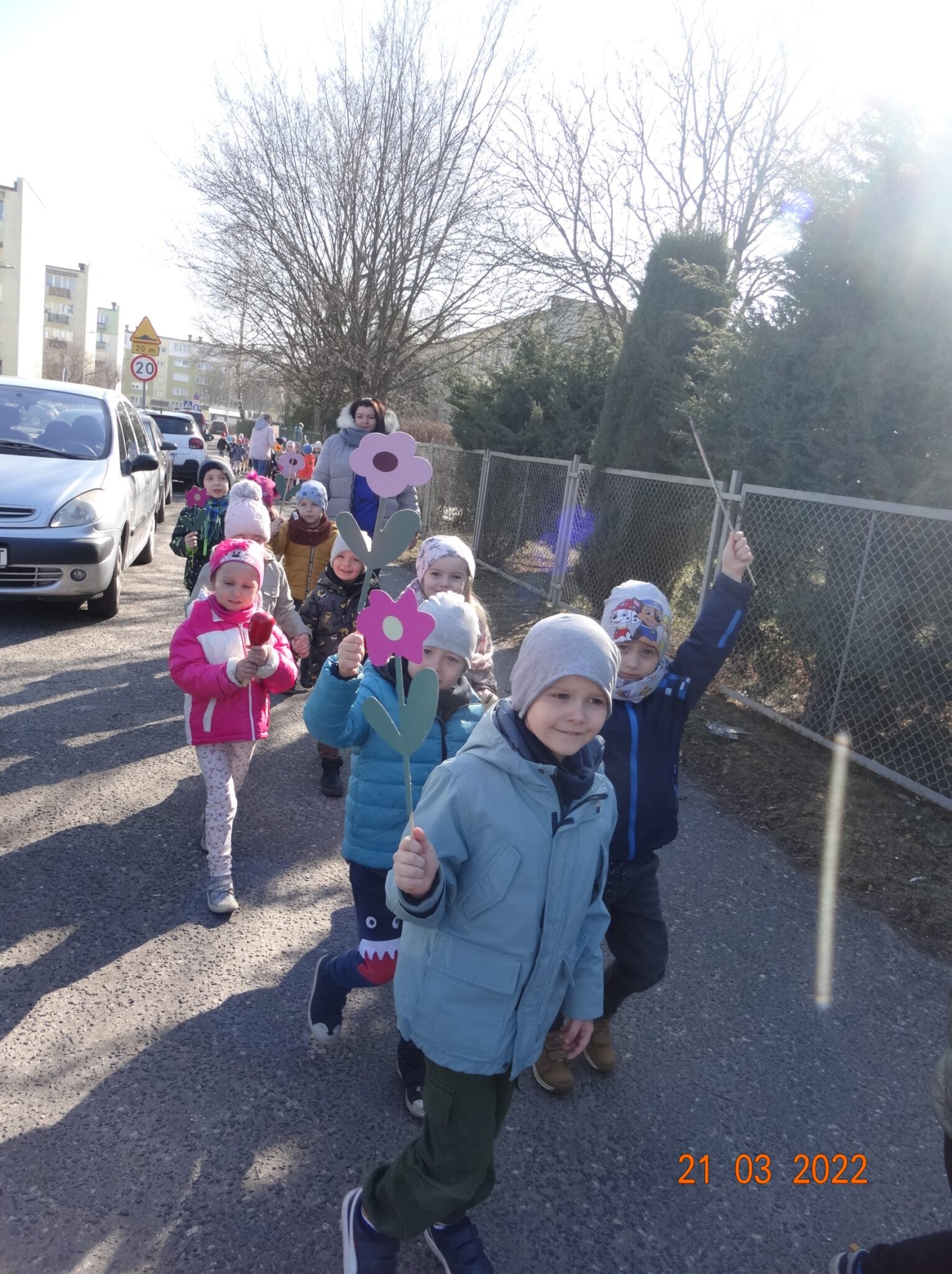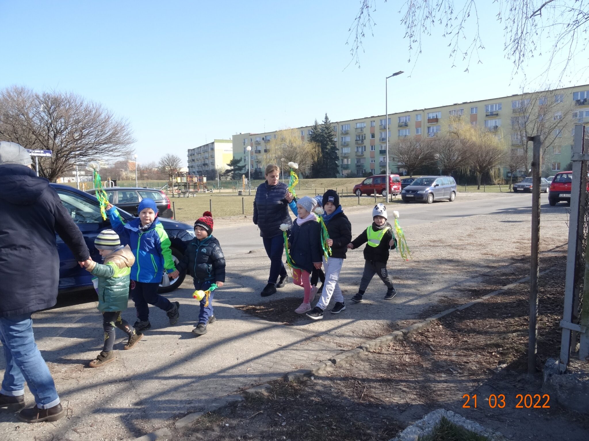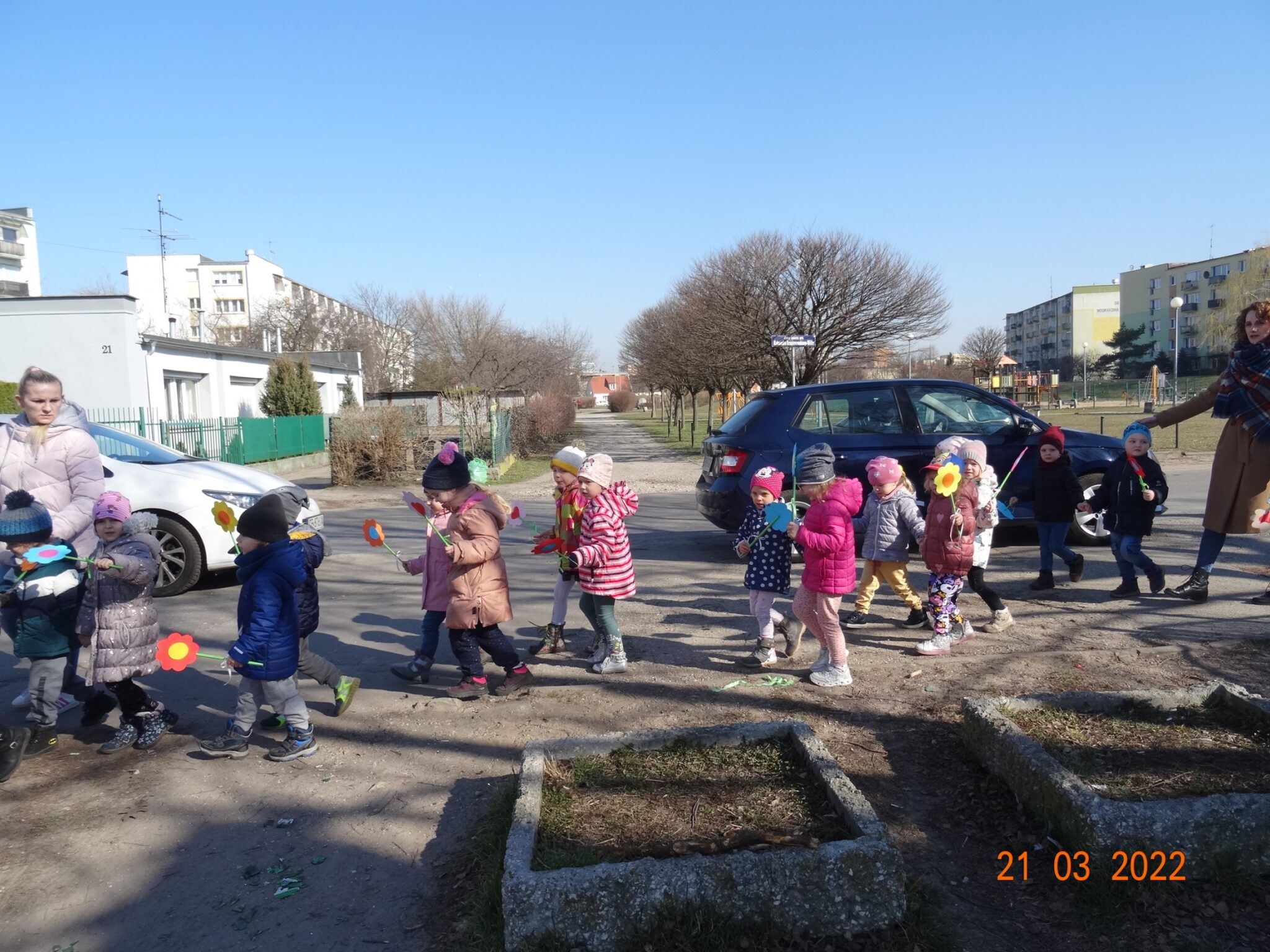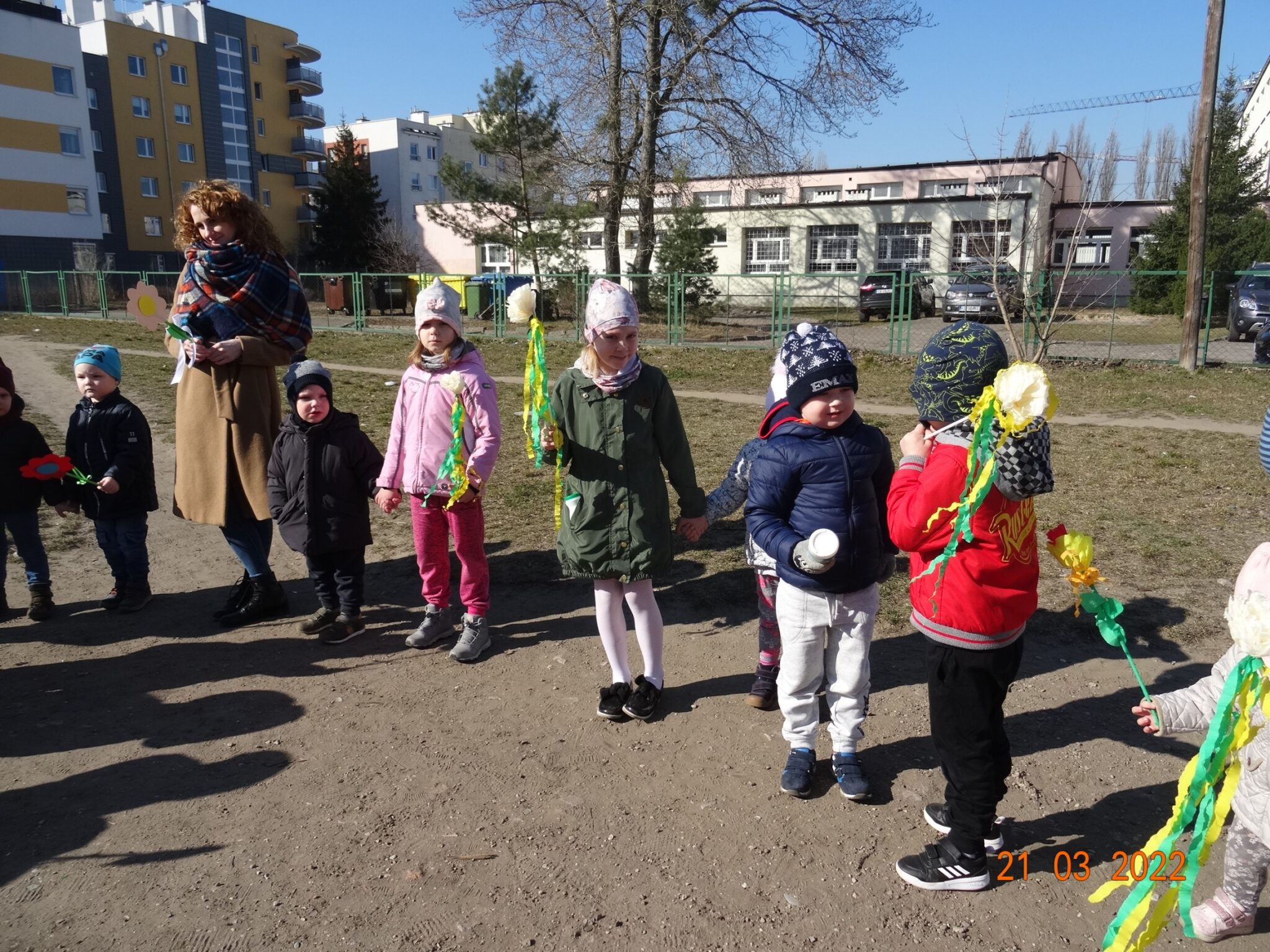 W końcu nadszedł długo wyczekiwany przez przedszkolaków pierwszy dzień wiosny. W tym dniu wszystkie grupy, wraz ze swoimi paniami wyruszyły barwnym korowodem po najbliższej okolicy przedszkola, trzymając w rękach kolorowe kwiatki i gaiki. W taki oto sposób wyraziły swoją radość z nadejścia wiosny.