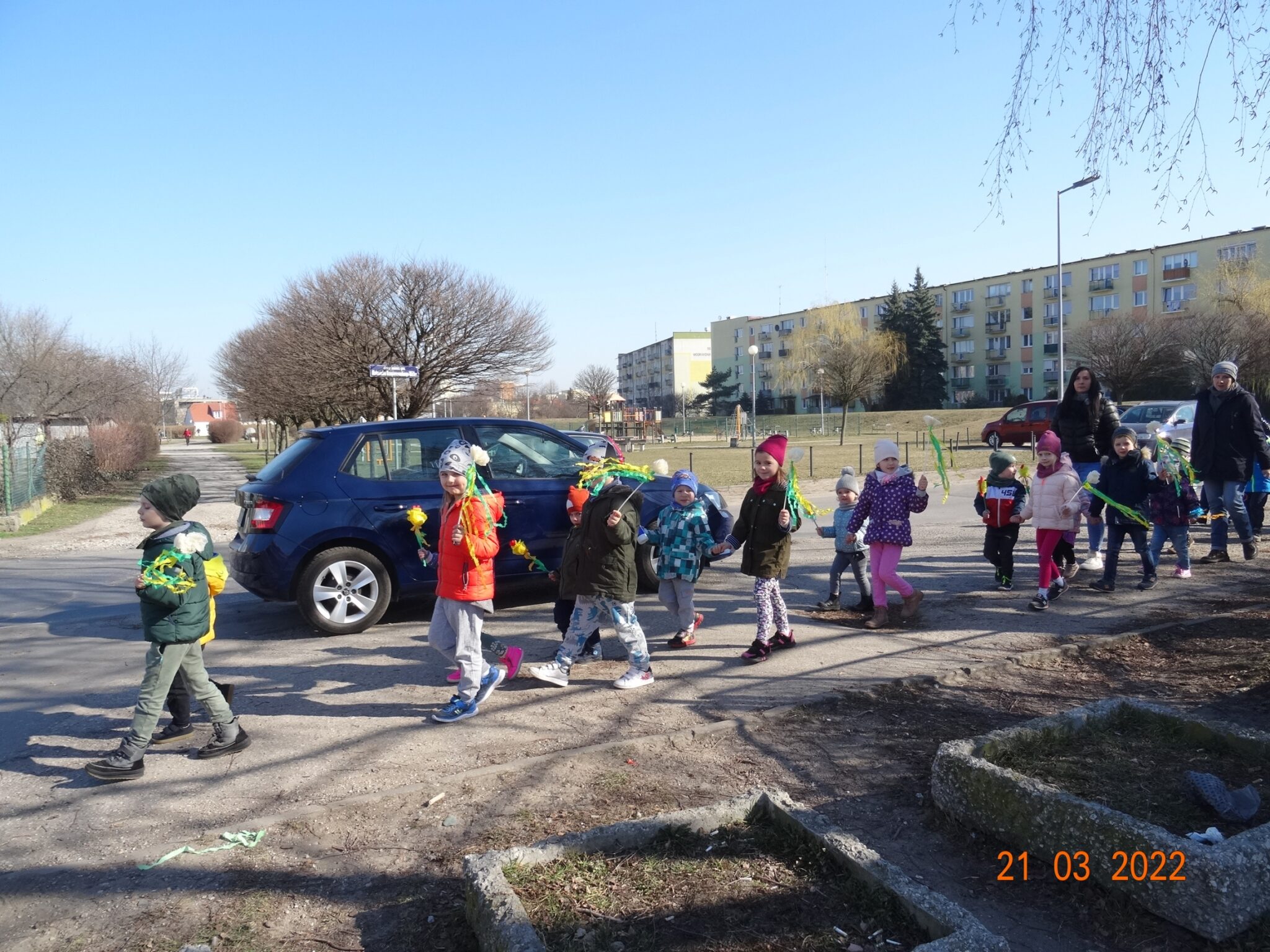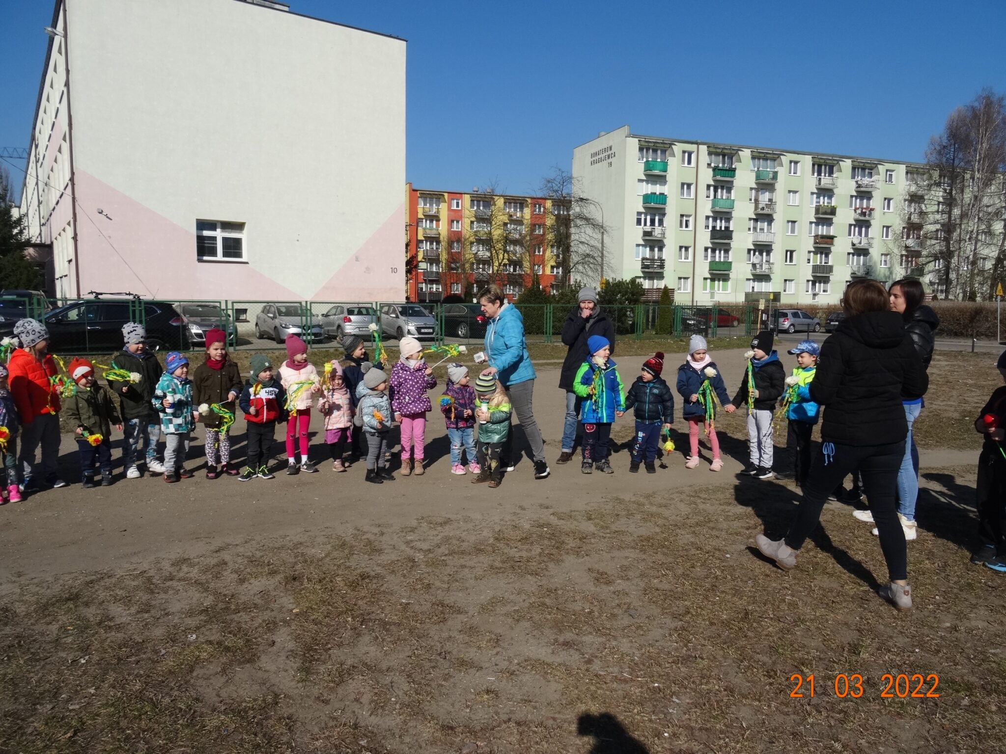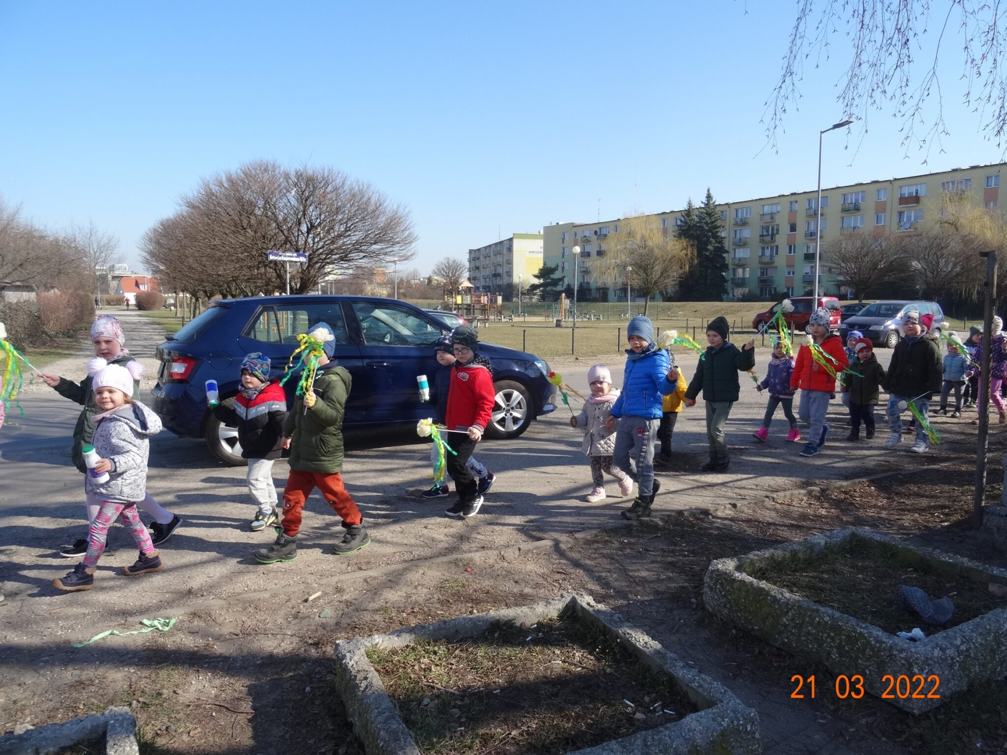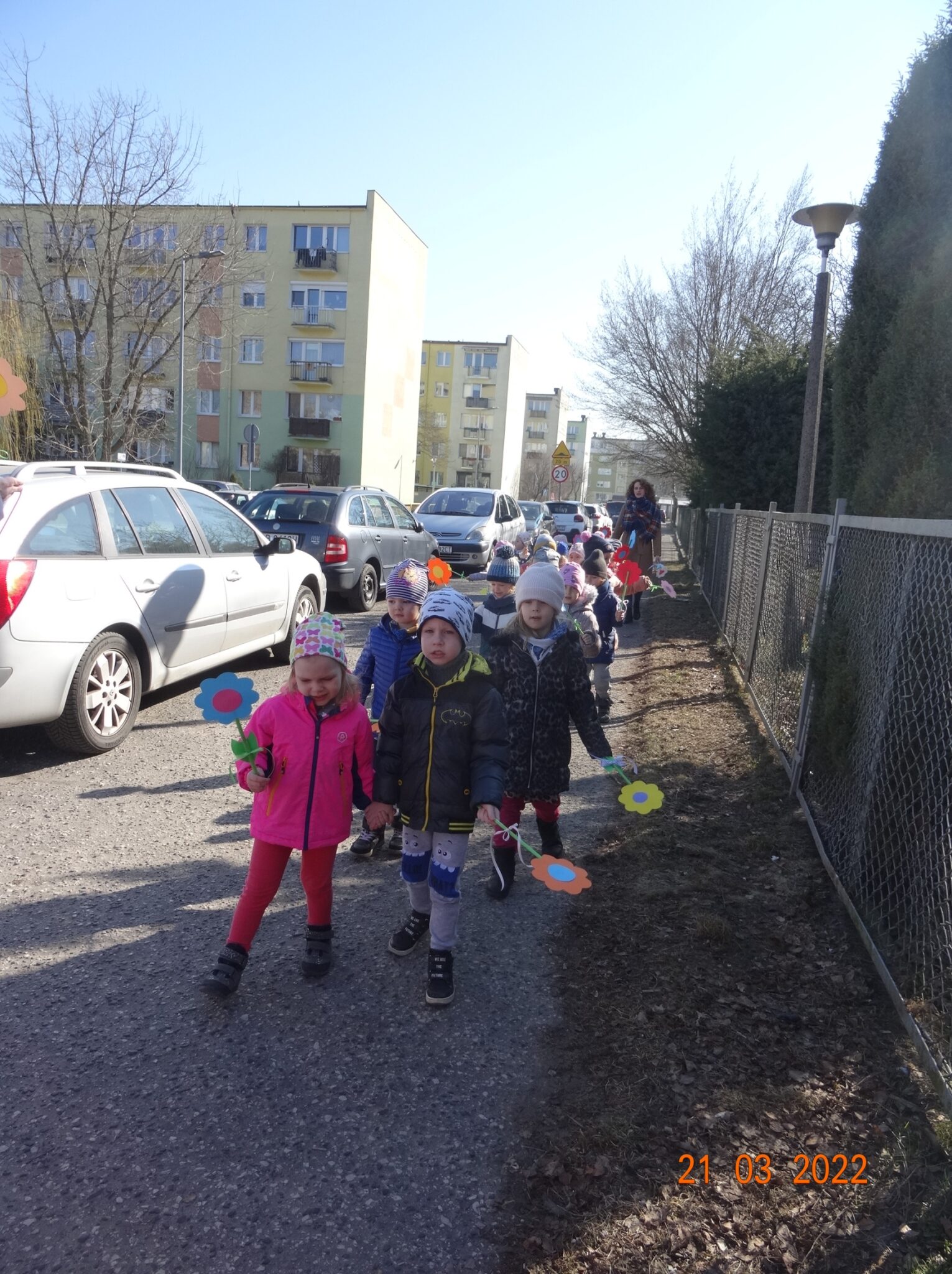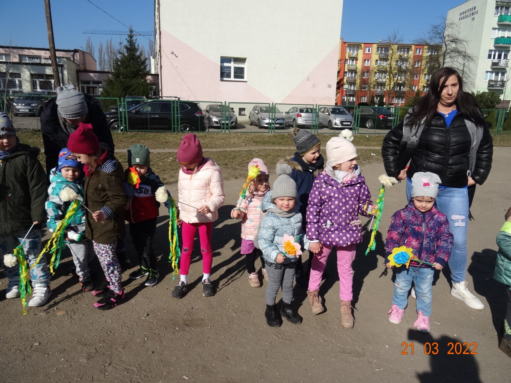 W końcu nadszedł długo wyczekiwany przez przedszkolaków pierwszy dzień wiosny. W tym dniu wszystkie grupy, wraz ze swoimi paniami wyruszyły barwnym korowodem po najbliższej okolicy przedszkola, trzymając w rękach kolorowe kwiatki i gaiki. W taki oto sposób wyraziły swoją radość z nadejścia wiosny.