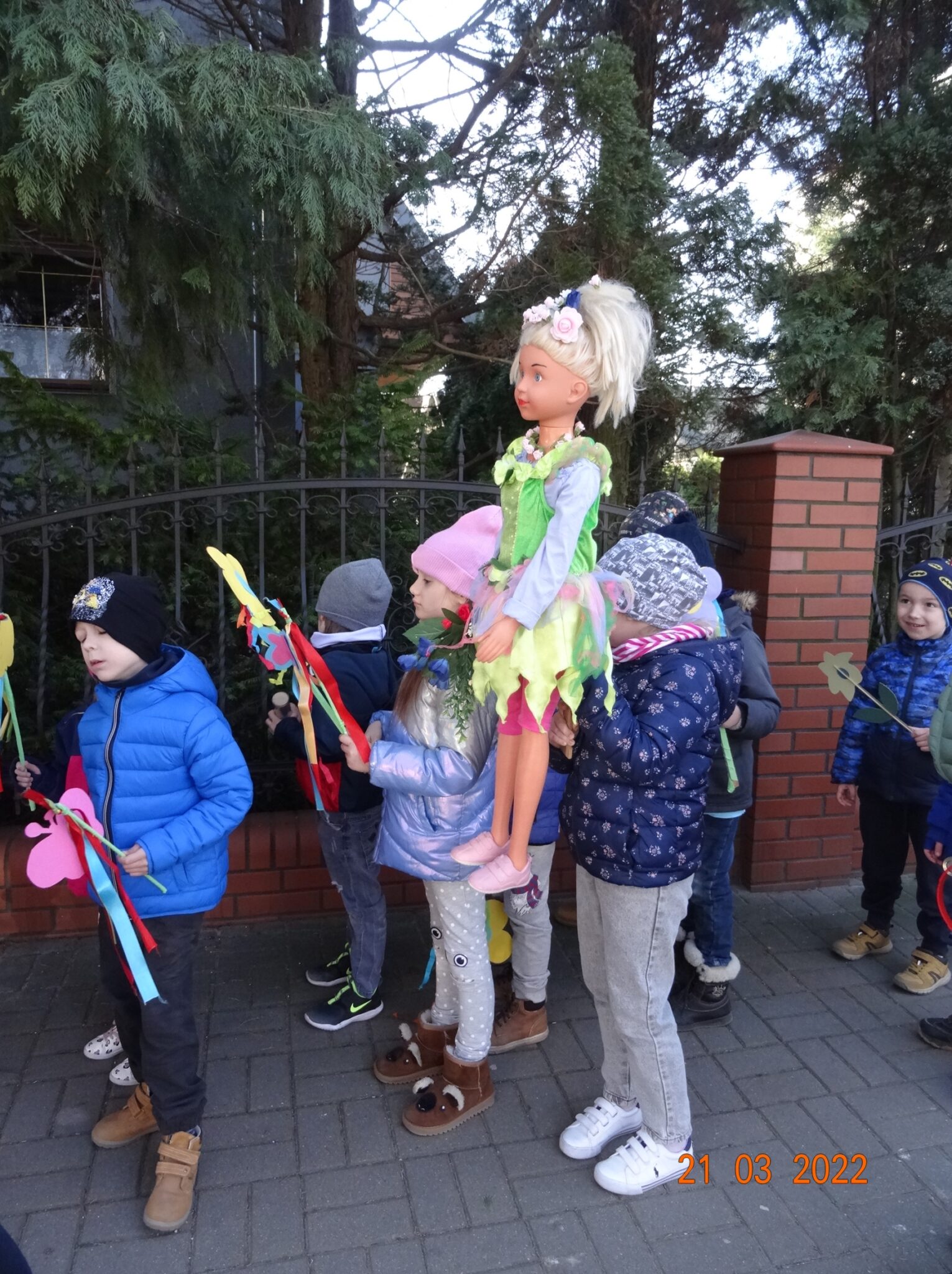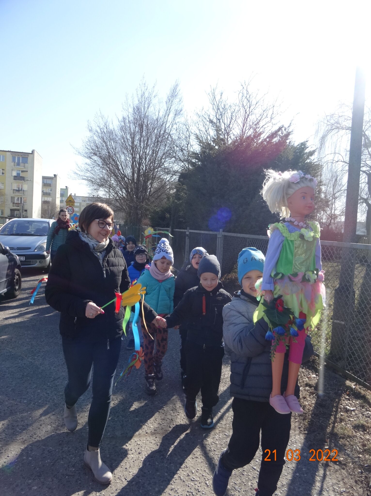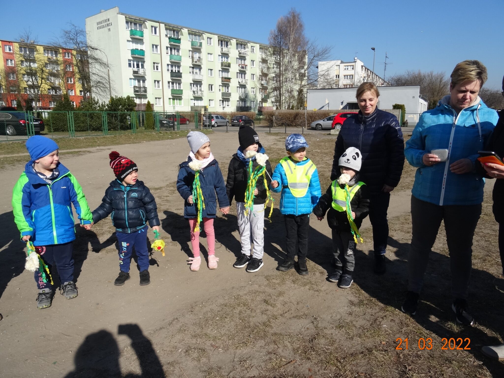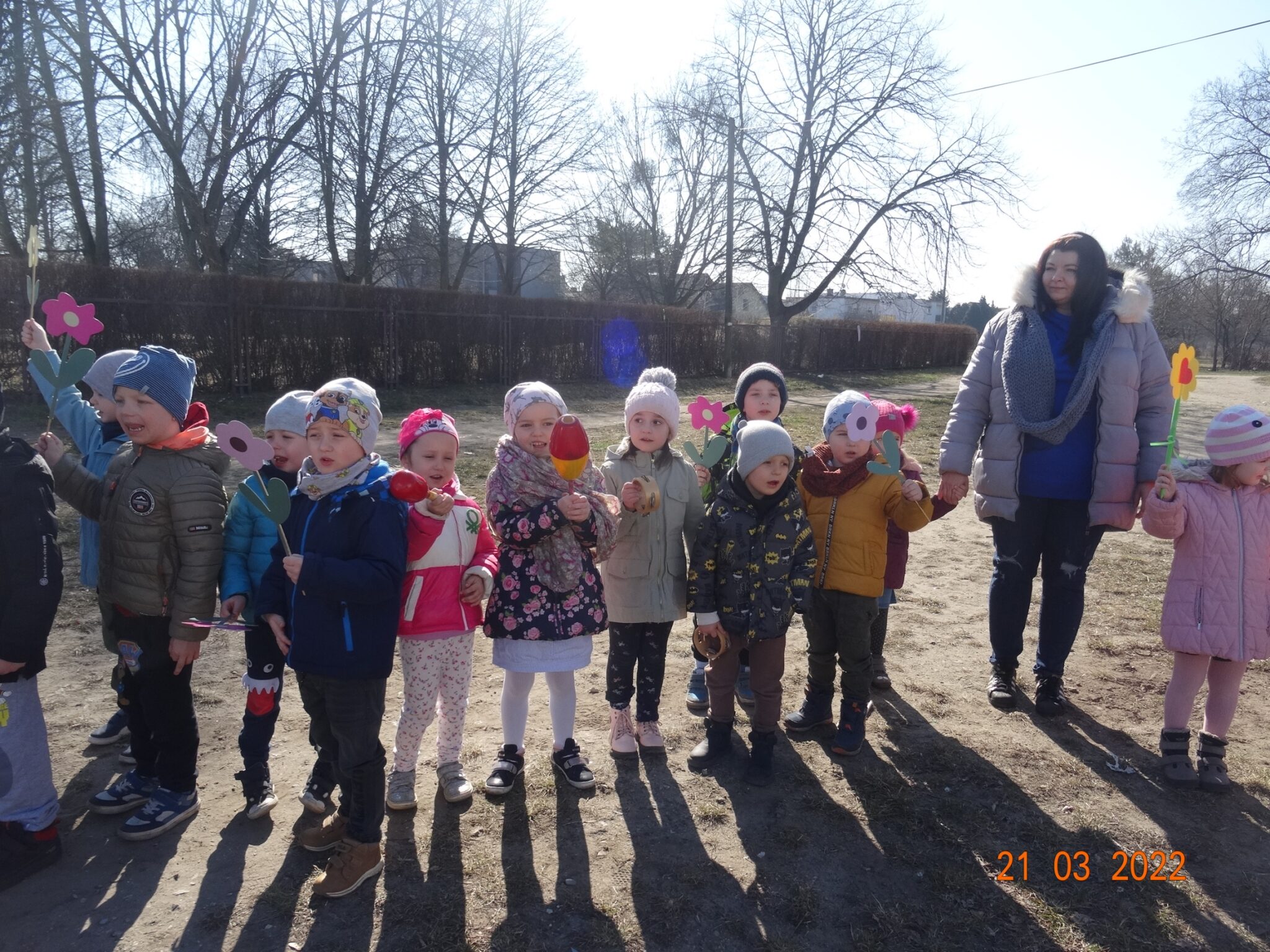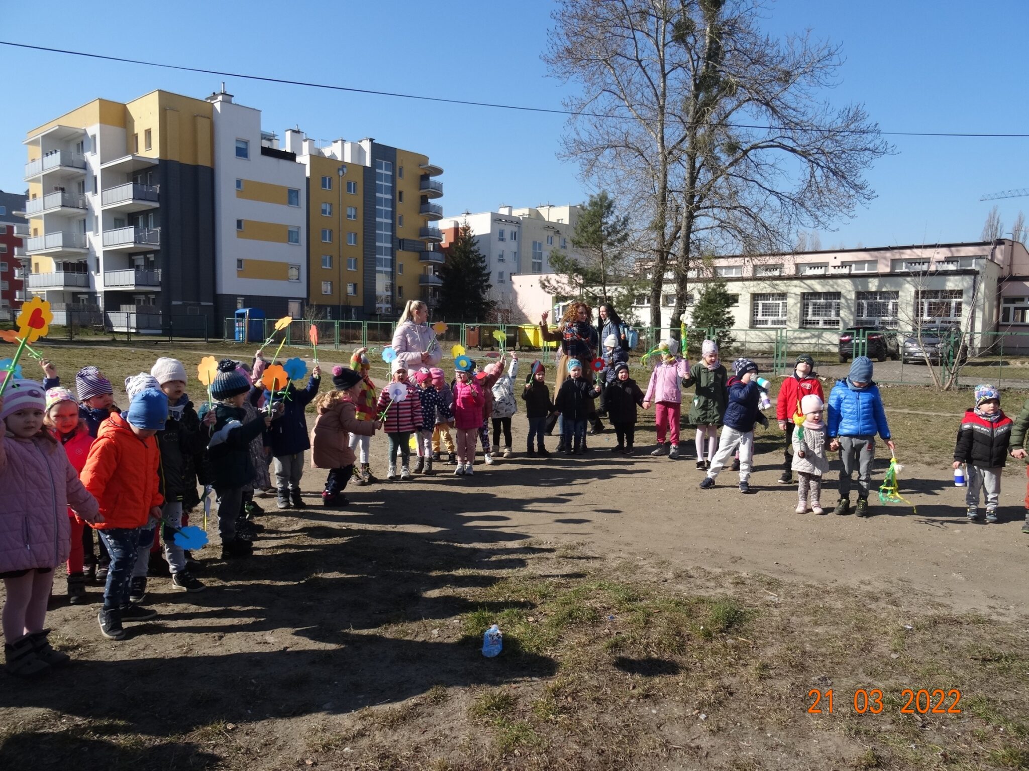 W końcu nadszedł długo wyczekiwany przez przedszkolaków pierwszy dzień wiosny. W tym dniu wszystkie grupy, wraz ze swoimi paniami wyruszyły barwnym korowodem po najbliższej okolicy przedszkola, trzymając w rękach kolorowe kwiatki i gaiki. W taki oto sposób wyraziły swoją radość z nadejścia wiosny.