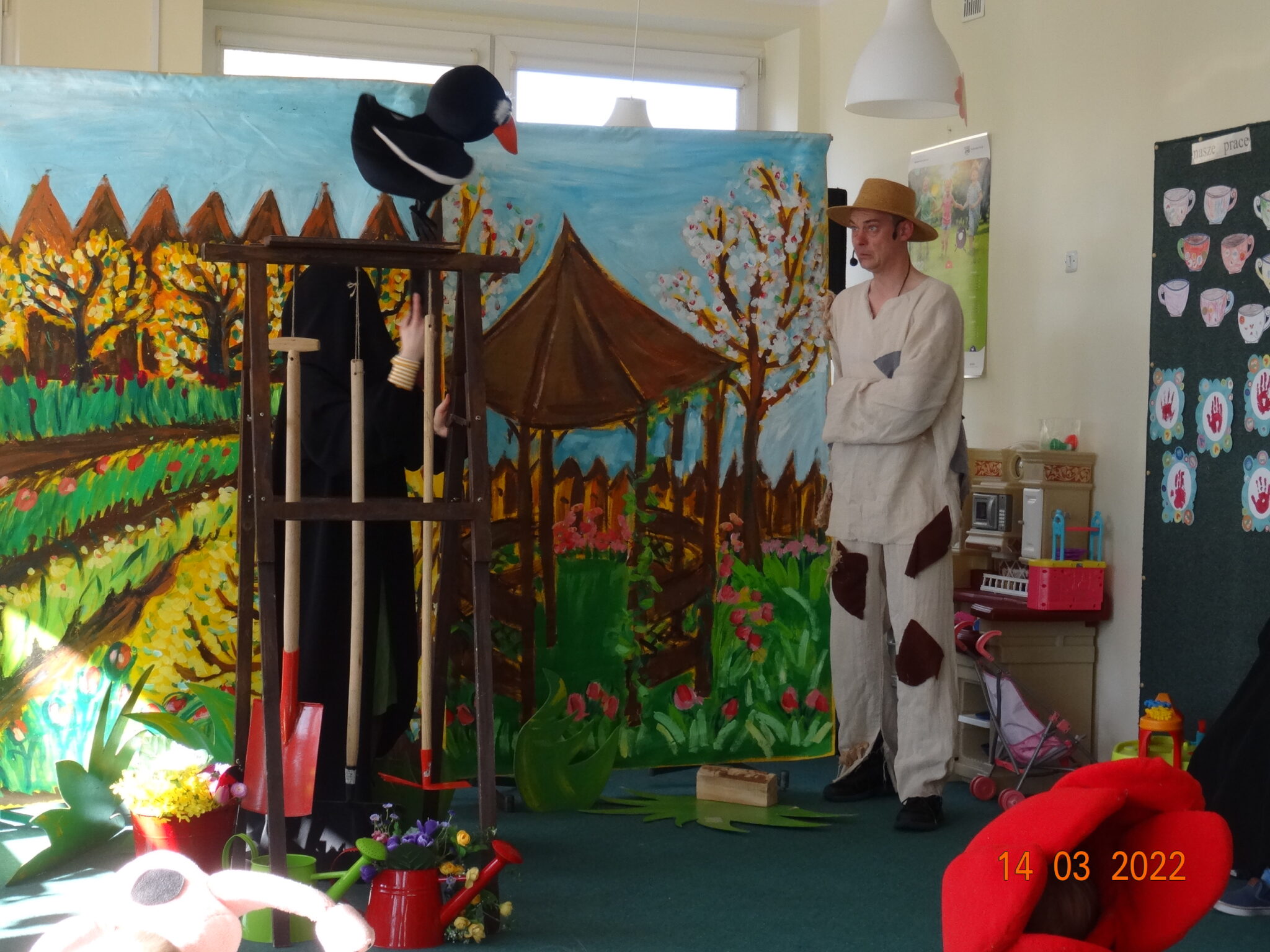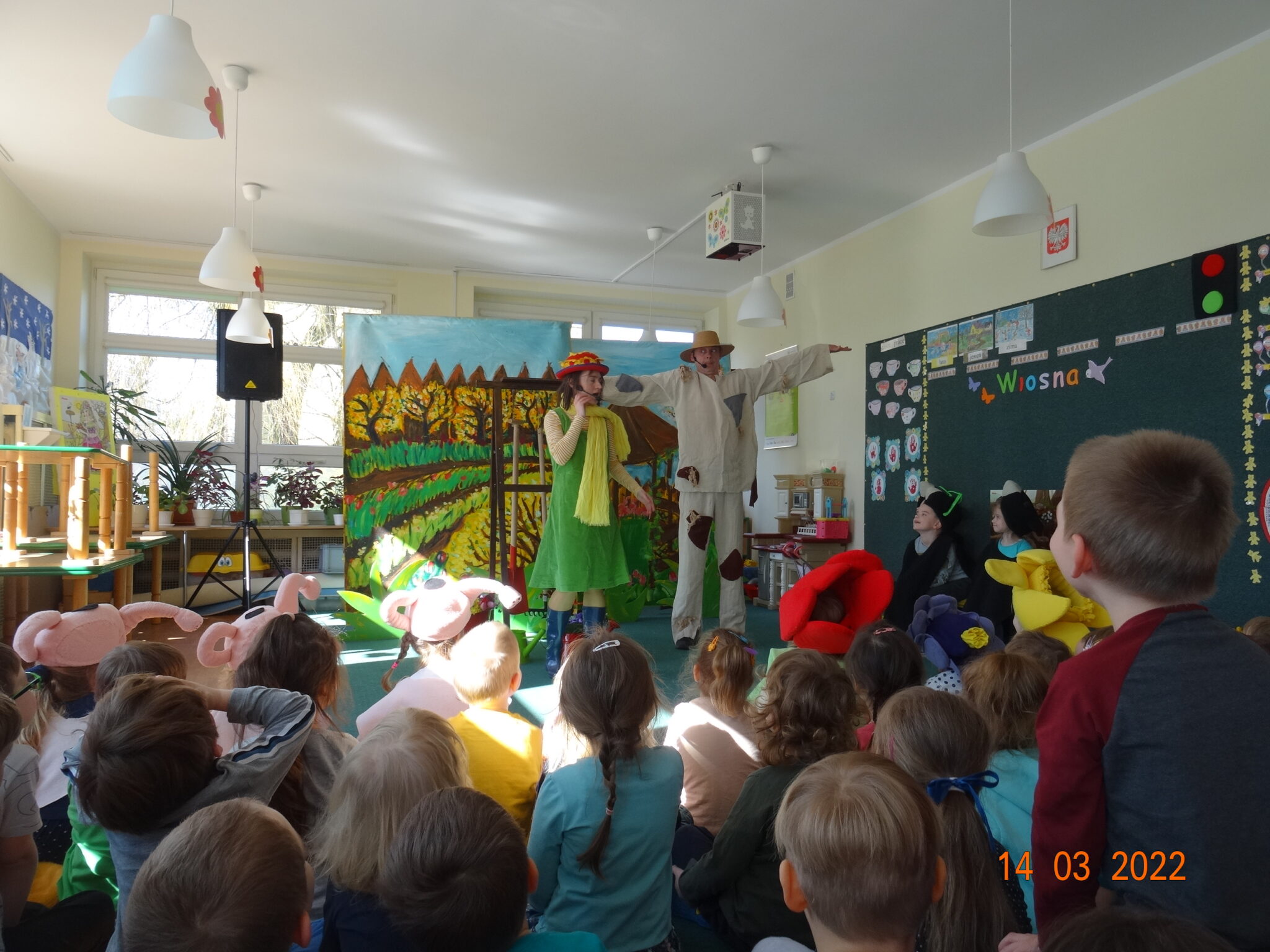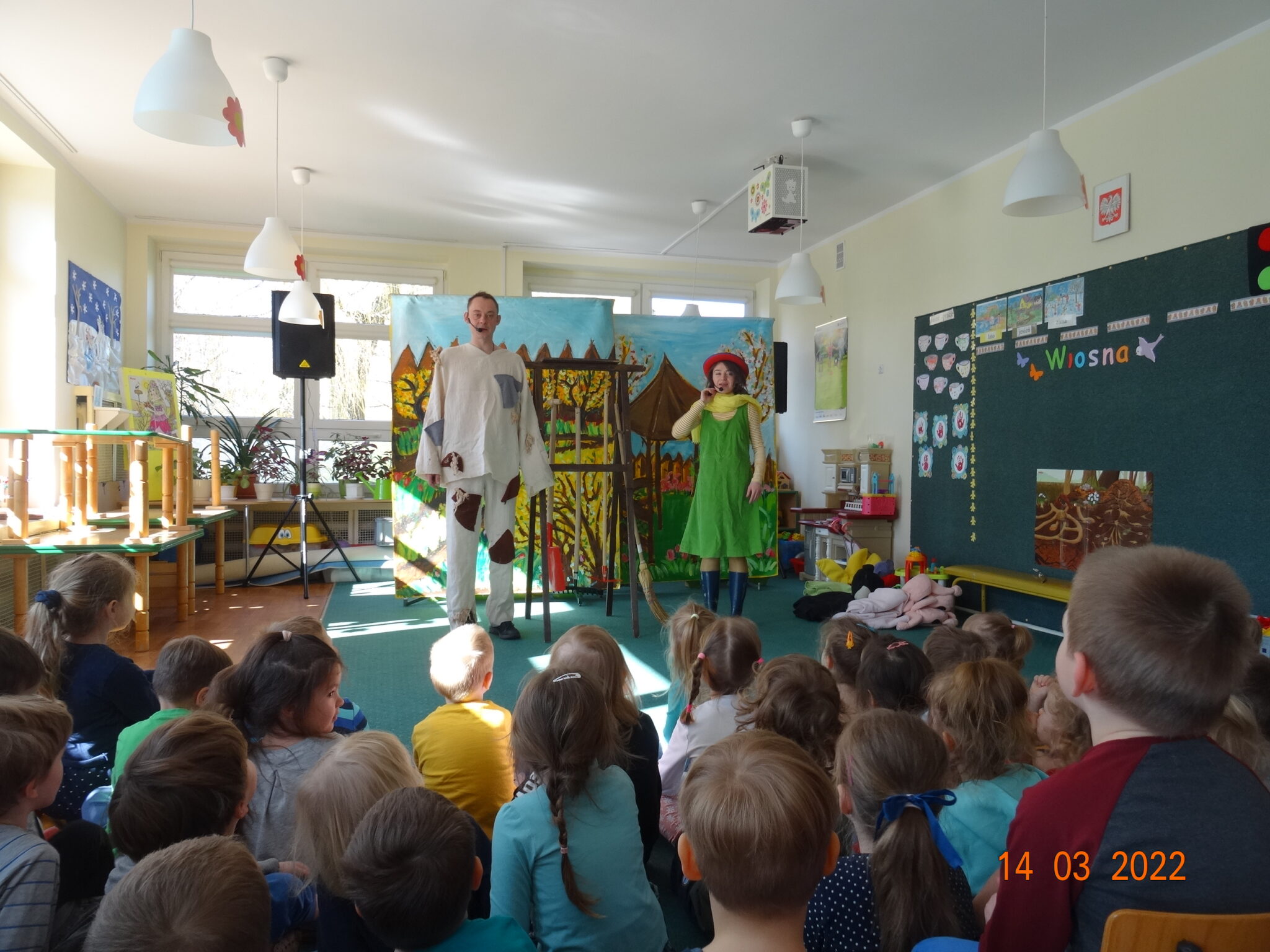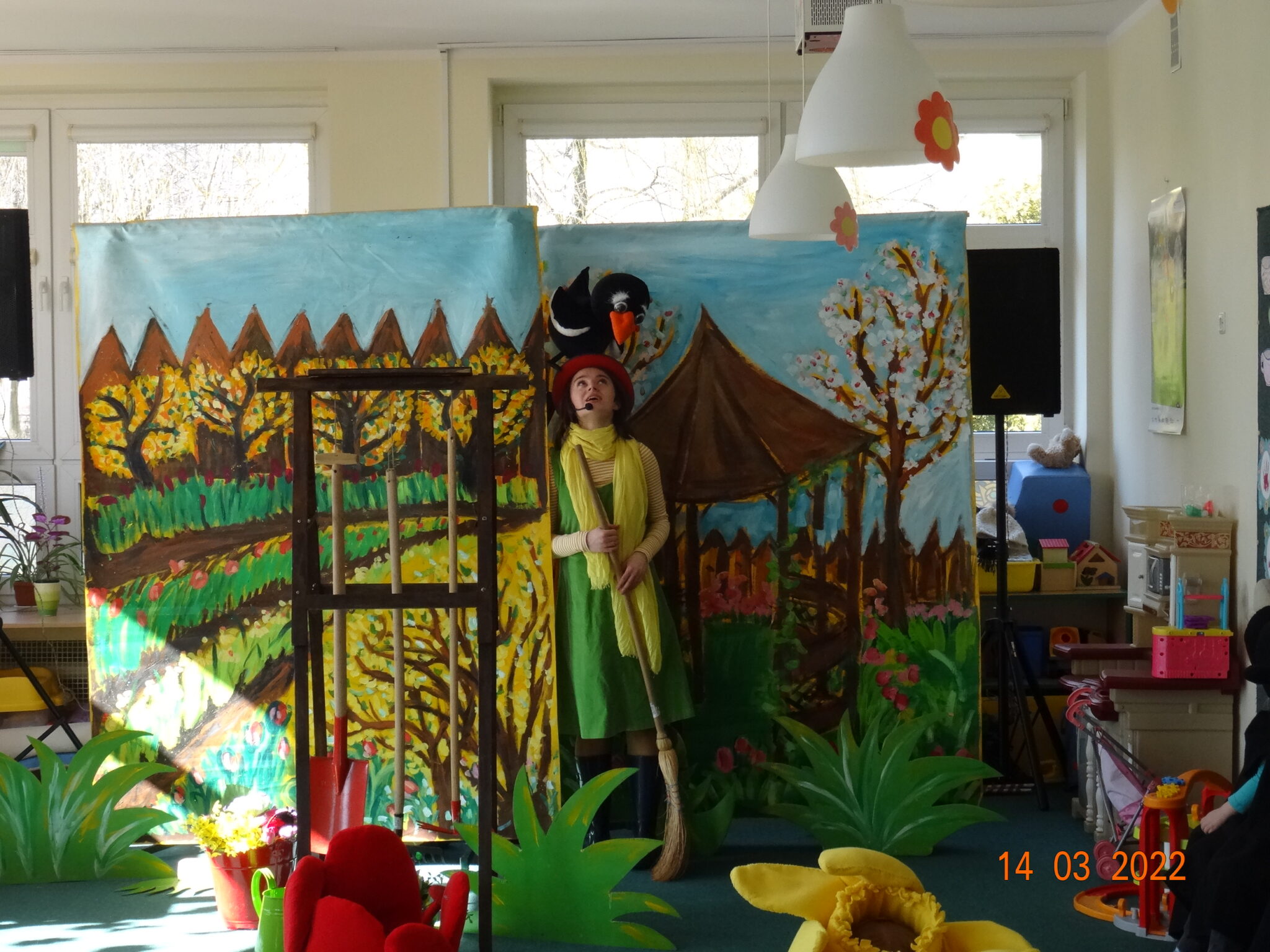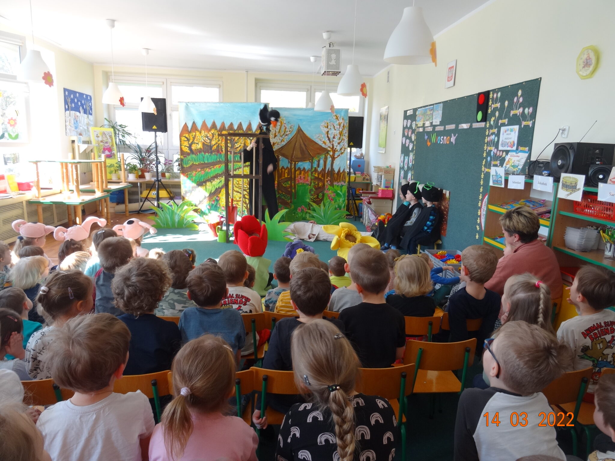 14 marca w naszym przedszkolu pojawili się aktorzy z teatru MagMowcy z opowieścią o zmieniających się porach roku pt. „Wiosna w ogrodzie”. Tytułowa Wiosna pod postacią ogrodniczki chciała przegonić zimę i pobudzić uśpione w ogrodzie życie. Wraz z małymi pomocnikami zabrała się do pracy pielęgnując i podlewając pojawiające się roślinki. Wraz z Wiosną w ogrodzie obudziły się nie tylko kwiaty ale również krety, przyleciał też czarny kruk, którego Wiosna chciała się pozbyć z pomocą starego stracha na wróble. Na szczęście wszystko zakończyło się szczęśliwie i można było powitać Wiosnę w ogrodzie.