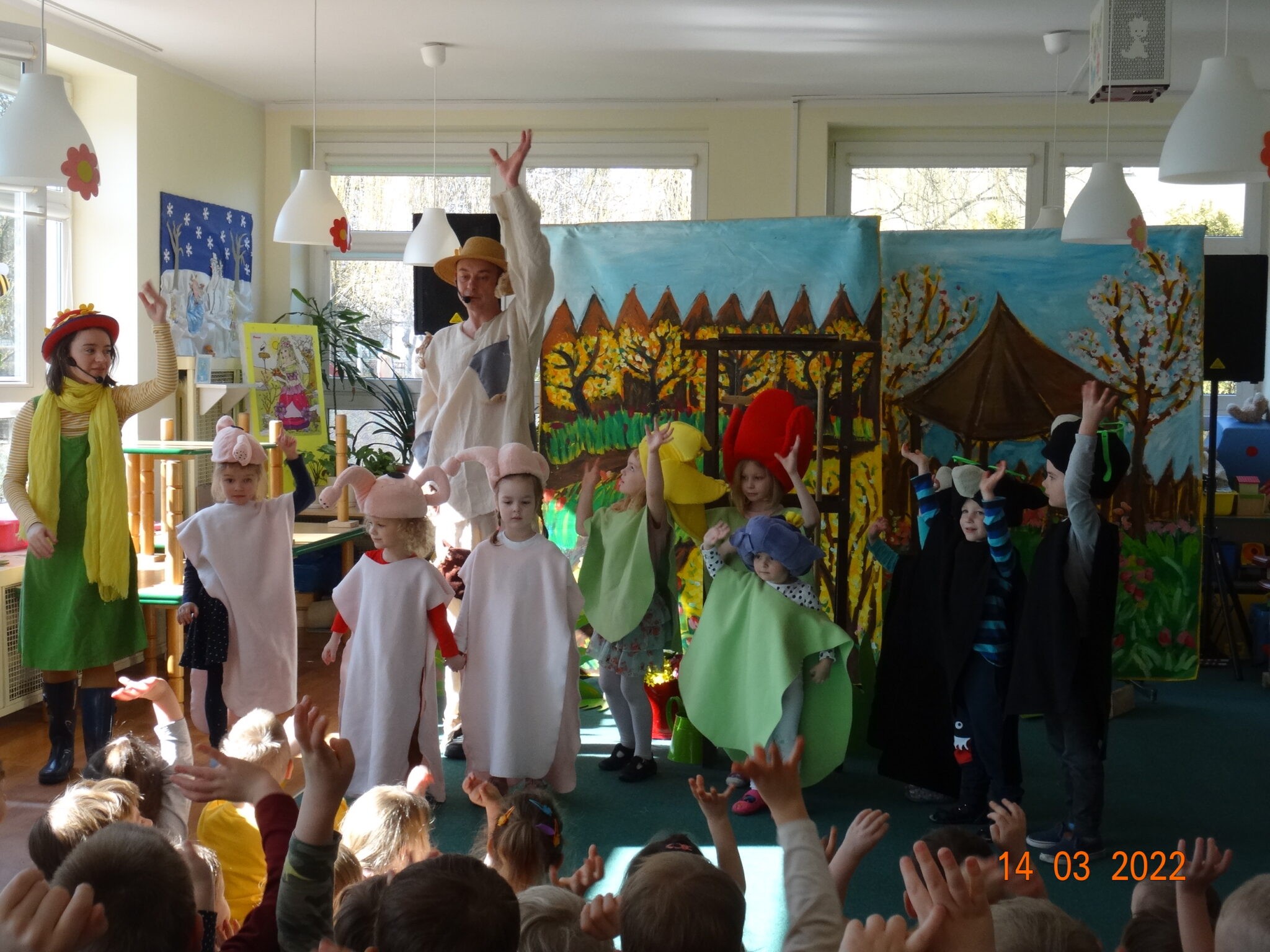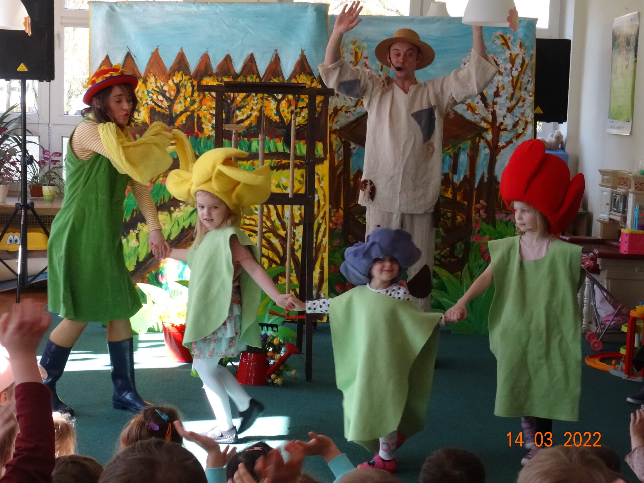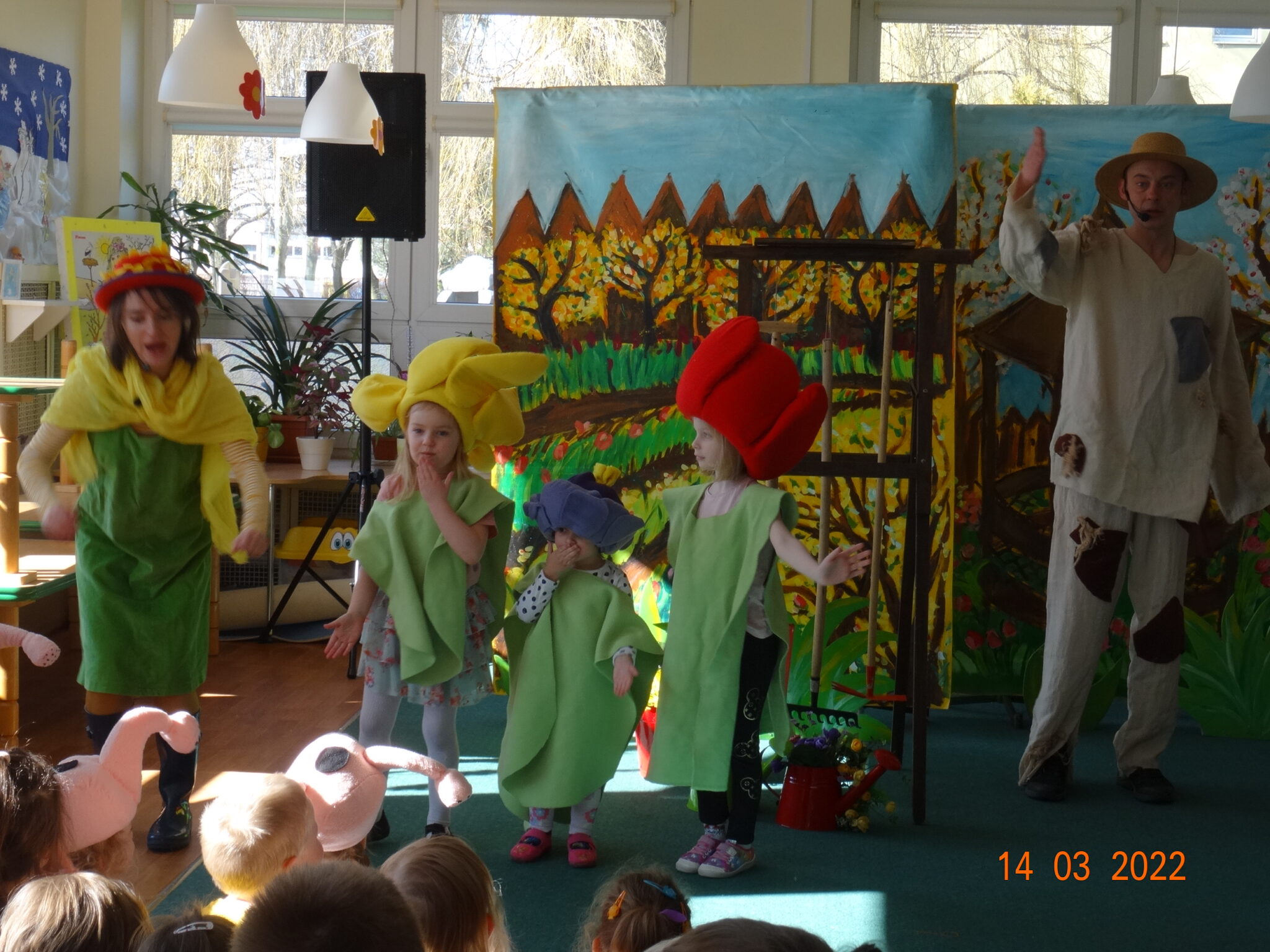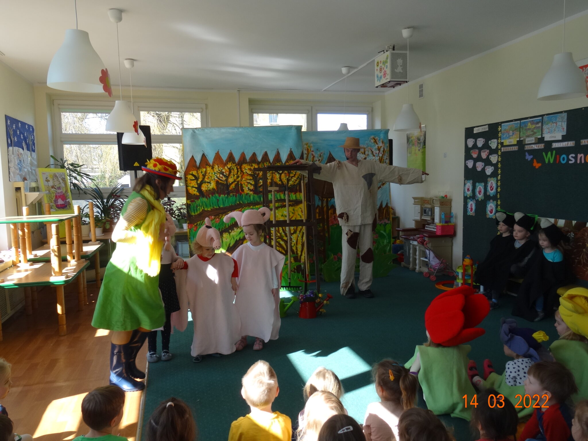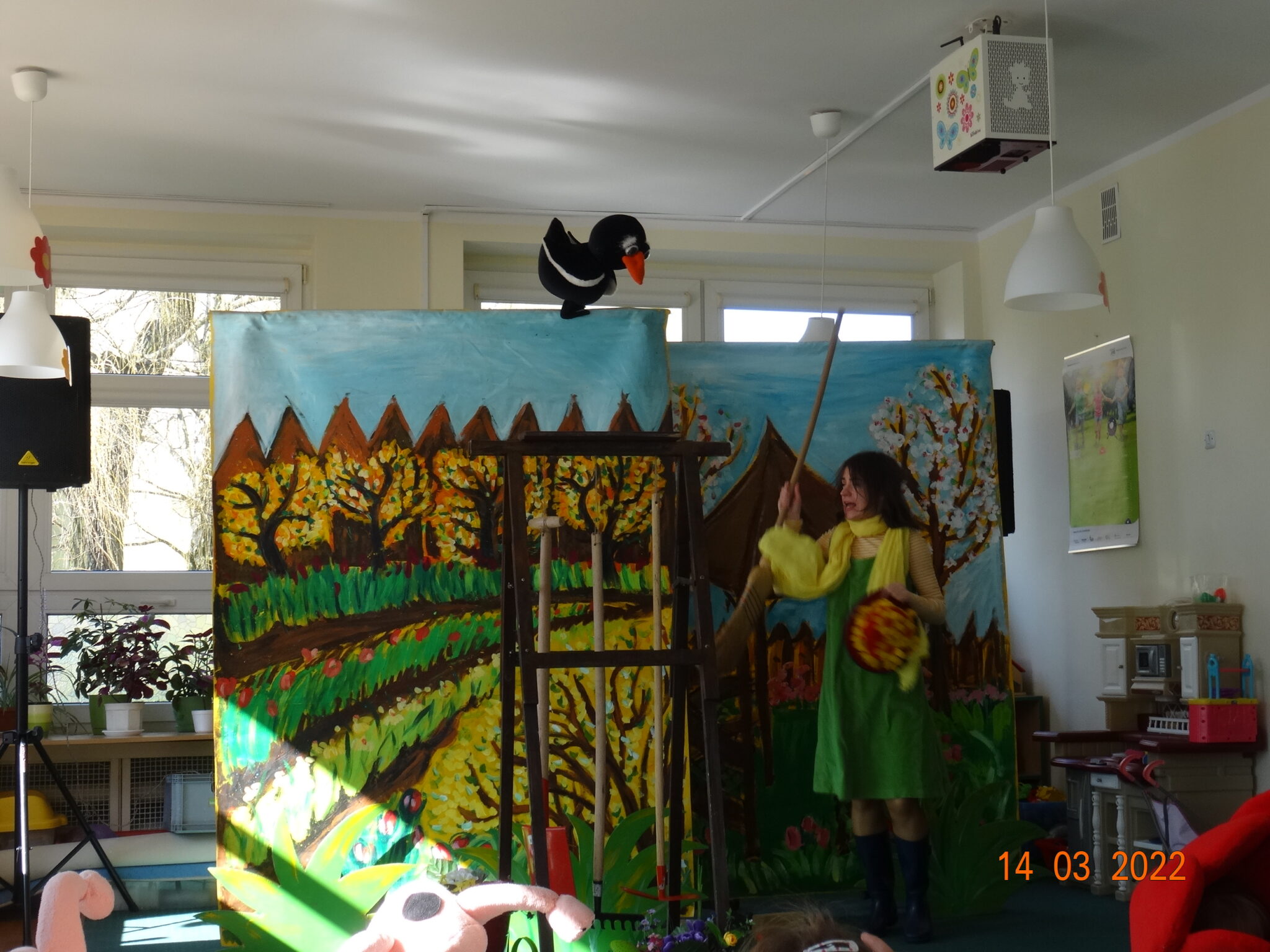 14 marca w naszym przedszkolu pojawili się aktorzy z teatru MagMowcy z opowieścią o zmieniających się porach roku pt. „Wiosna w ogrodzie”. Tytułowa Wiosna pod postacią ogrodniczki chciała przegonić zimę i pobudzić uśpione w ogrodzie życie. Wraz z małymi pomocnikami zabrała się do pracy pielęgnując i podlewając pojawiające się roślinki. Wraz z Wiosną w ogrodzie obudziły się nie tylko kwiaty ale również krety, przyleciał też czarny kruk, którego Wiosna chciała się pozbyć z pomocą starego stracha na wróble. Na szczęście wszystko zakończyło się szczęśliwie i można było powitać Wiosnę w ogrodzie.