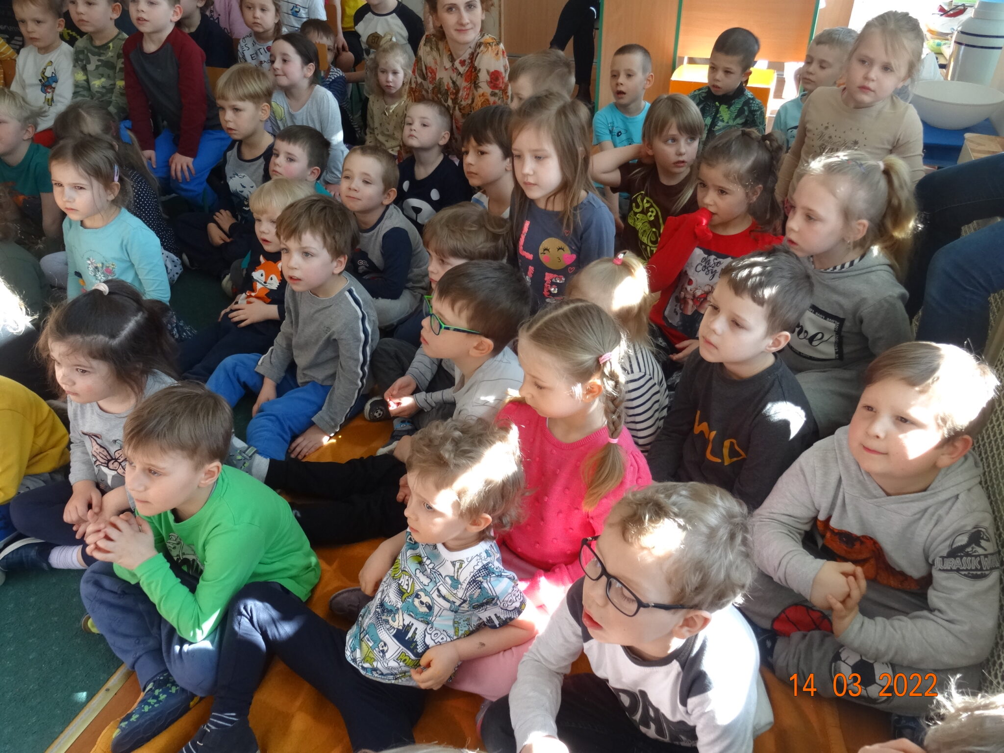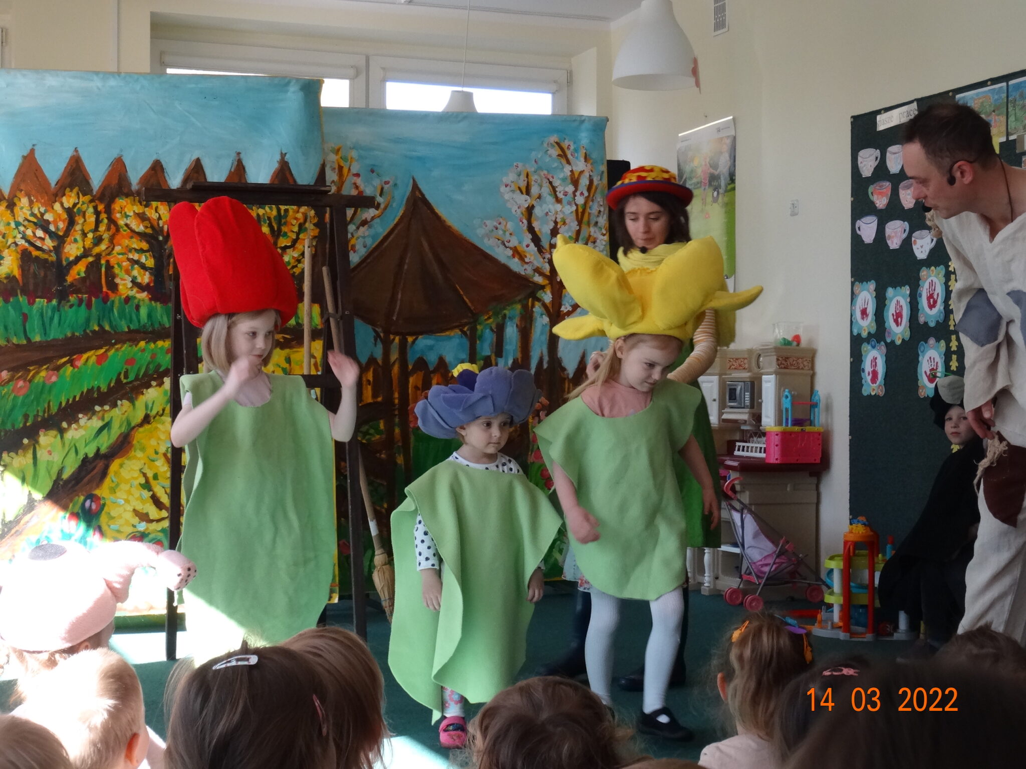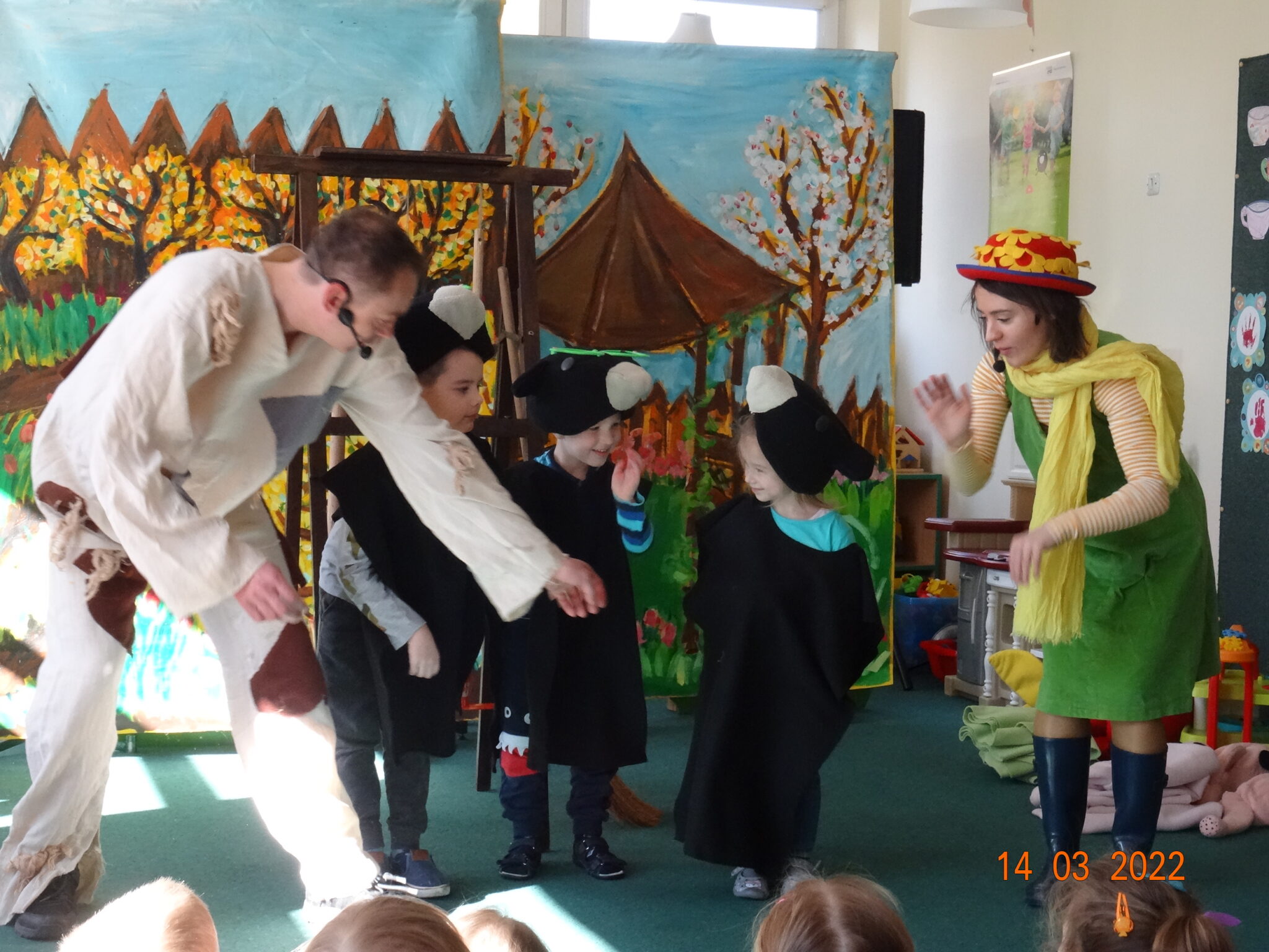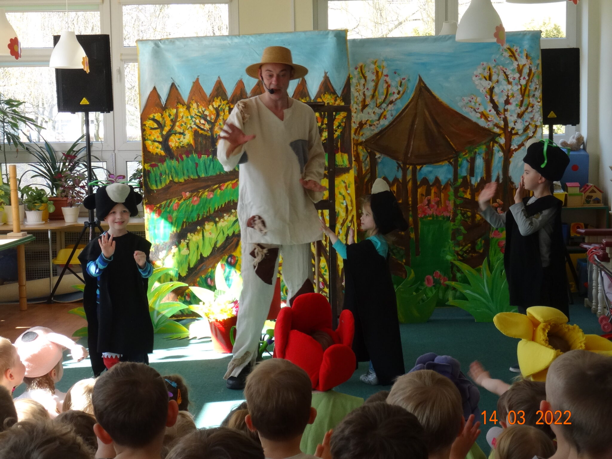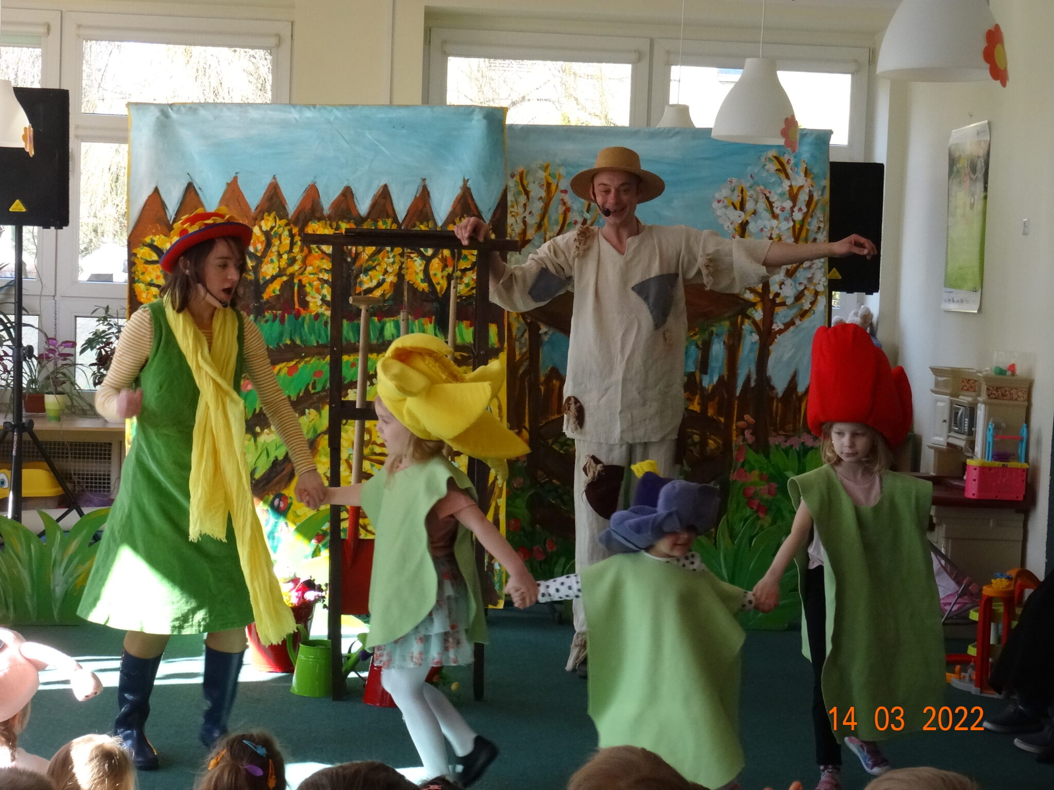14 marca w naszym przedszkolu pojawili się aktorzy z teatru MagMowcy z opowieścią o zmieniających się porach roku pt. „Wiosna w ogrodzie”. Tytułowa Wiosna pod postacią ogrodniczki chciała przegonić zimę i pobudzić uśpione w ogrodzie życie. Wraz z małymi pomocnikami zabrała się do pracy pielęgnując i podlewając pojawiające się roślinki. Wraz z Wiosną w ogrodzie obudziły się nie tylko kwiaty ale również krety, przyleciał też czarny kruk, którego Wiosna chciała się pozbyć z pomocą starego stracha na wróble. Na szczęście wszystko zakończyło się szczęśliwie i można było powitać Wiosnę w ogrodzie.