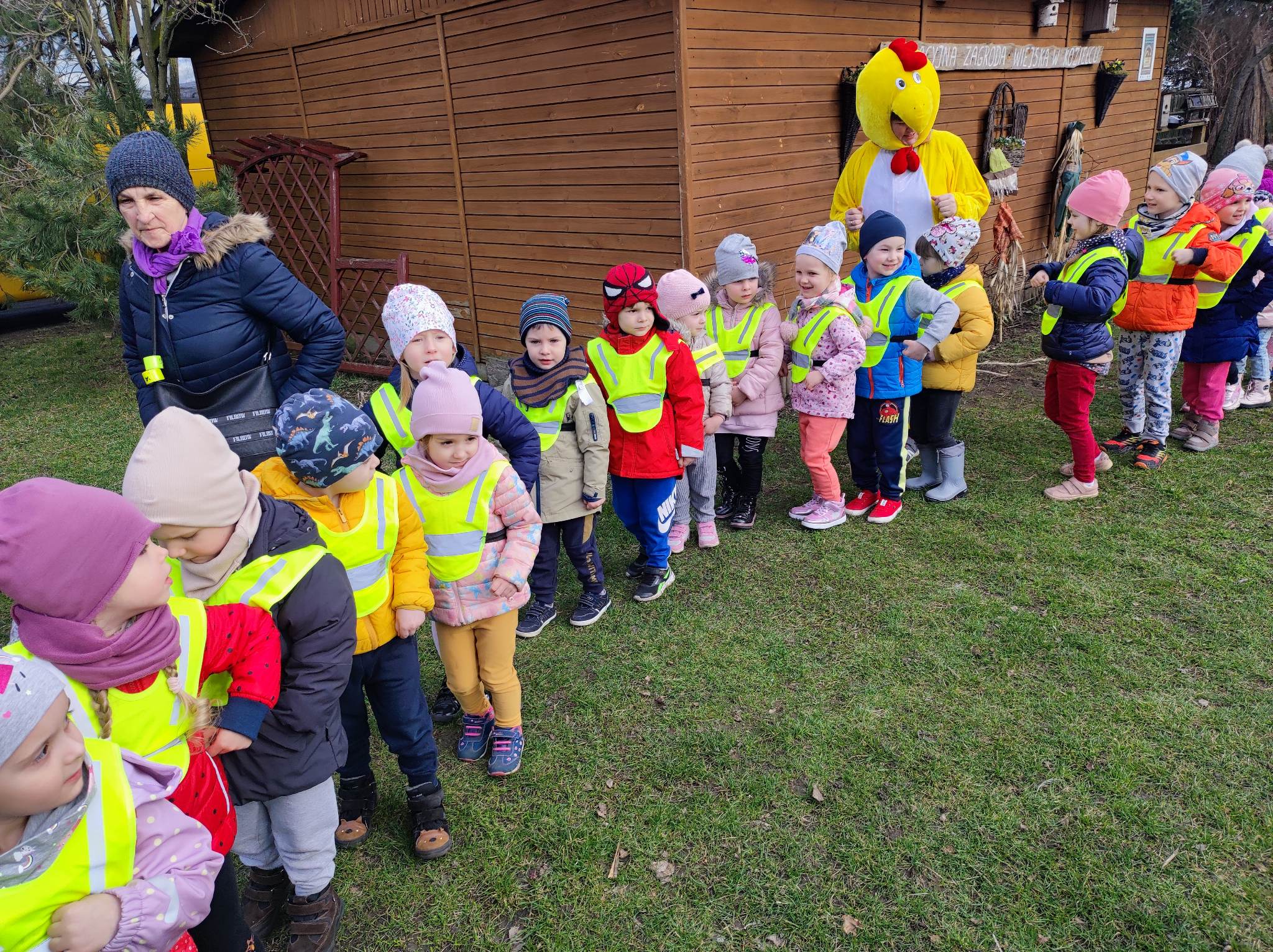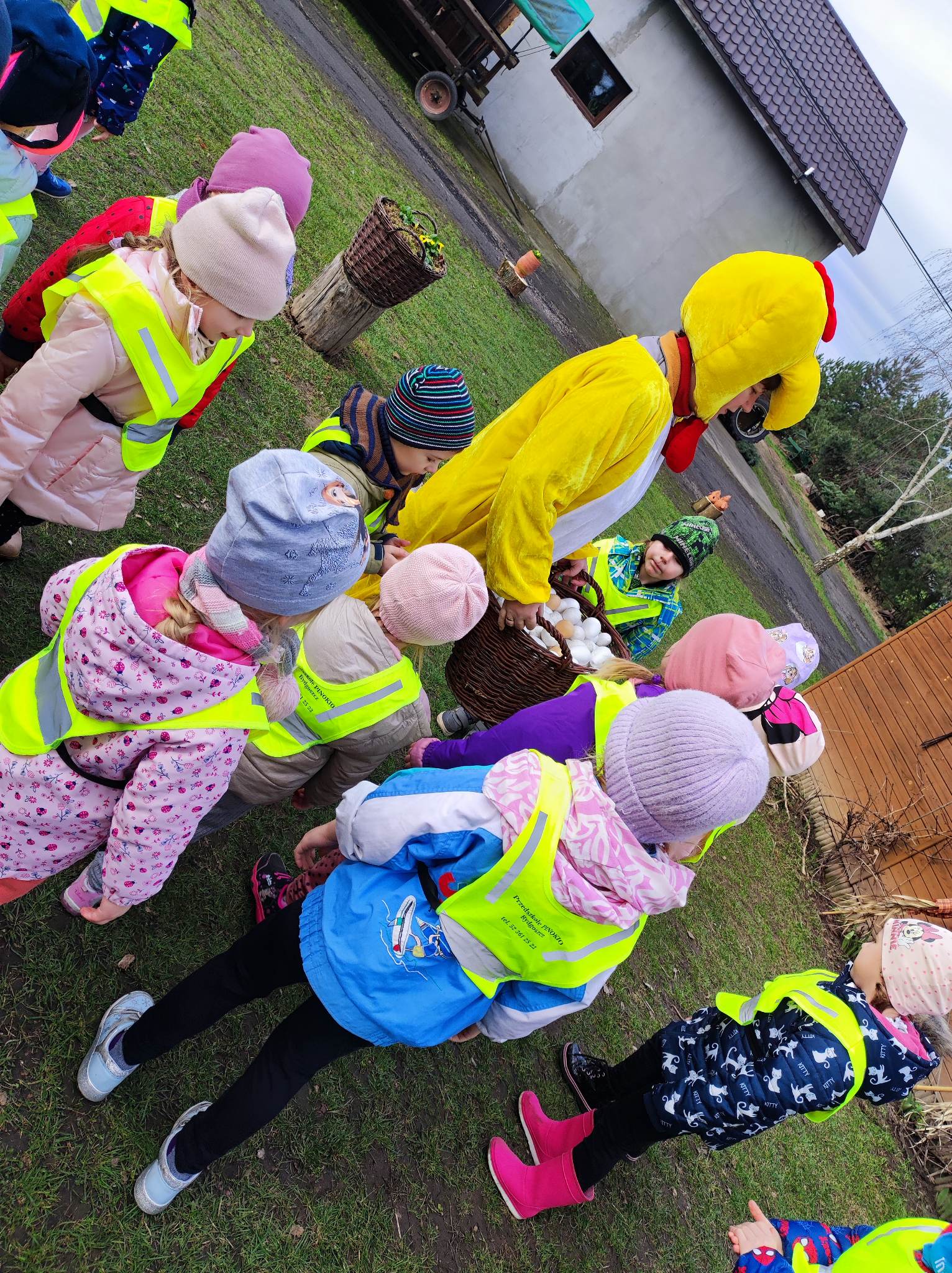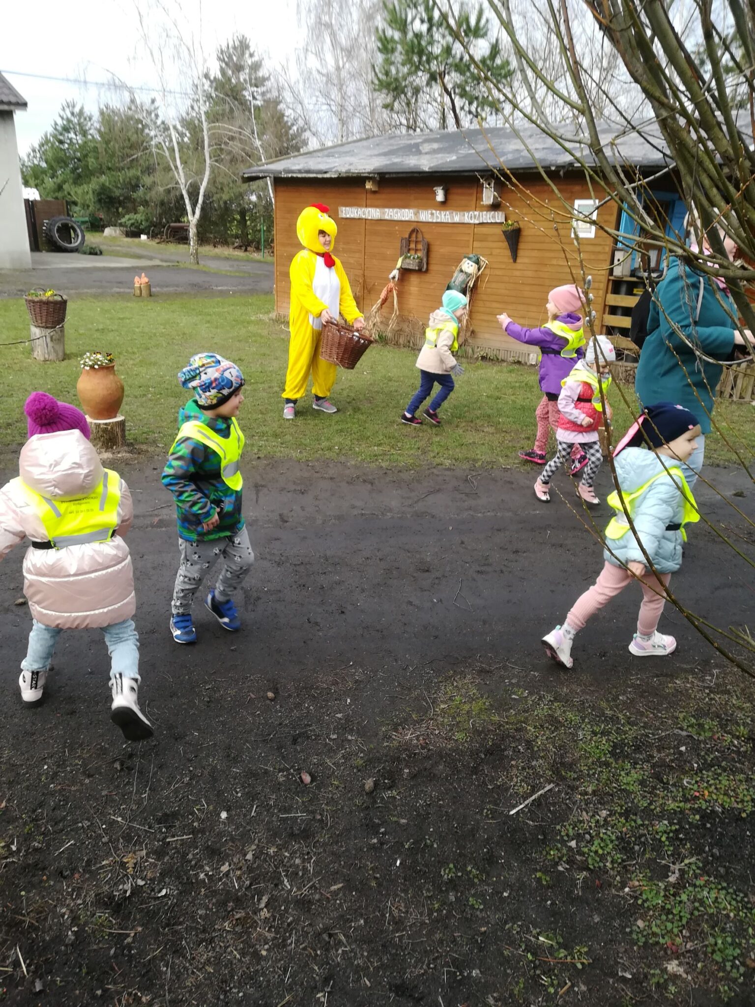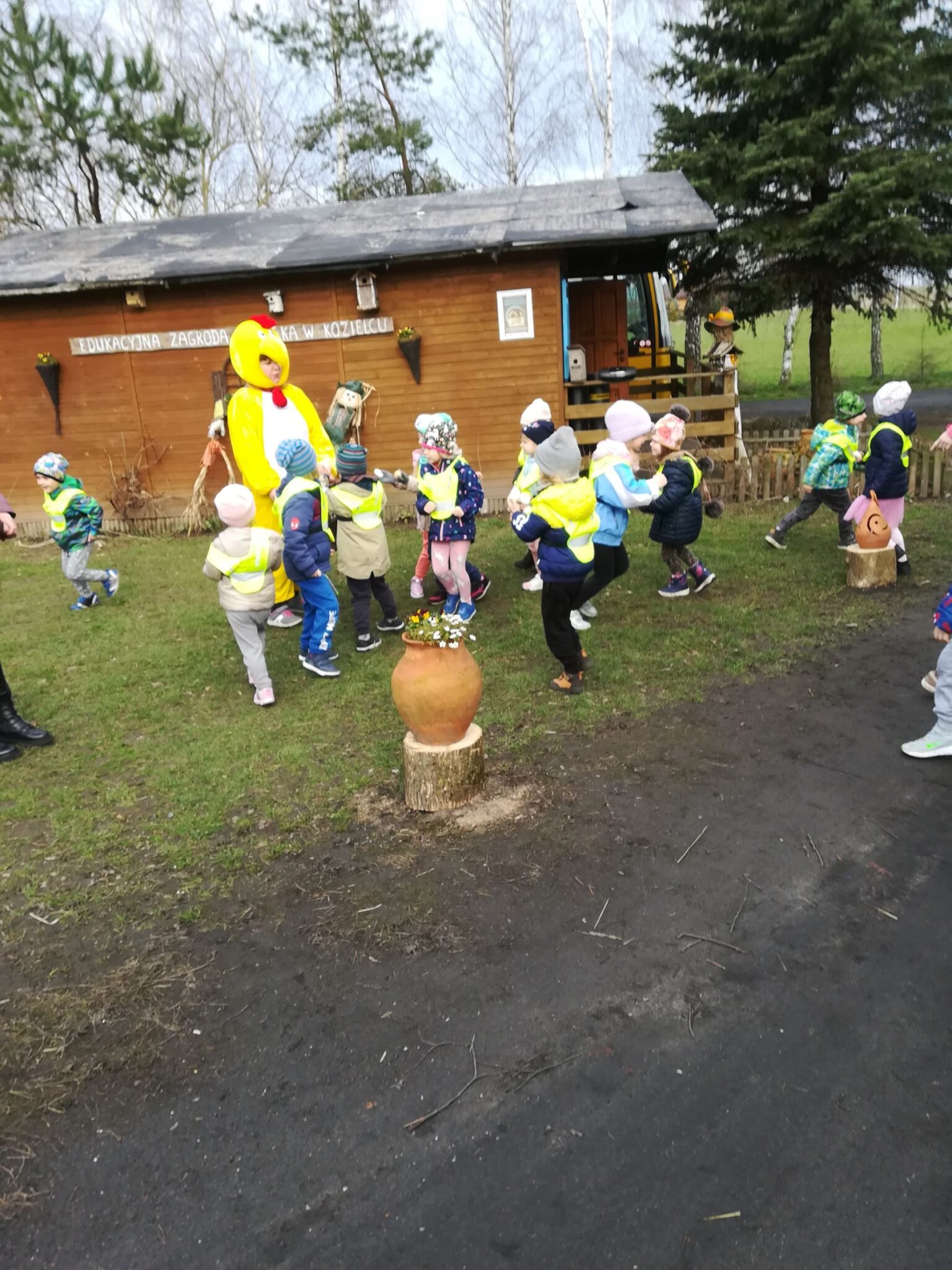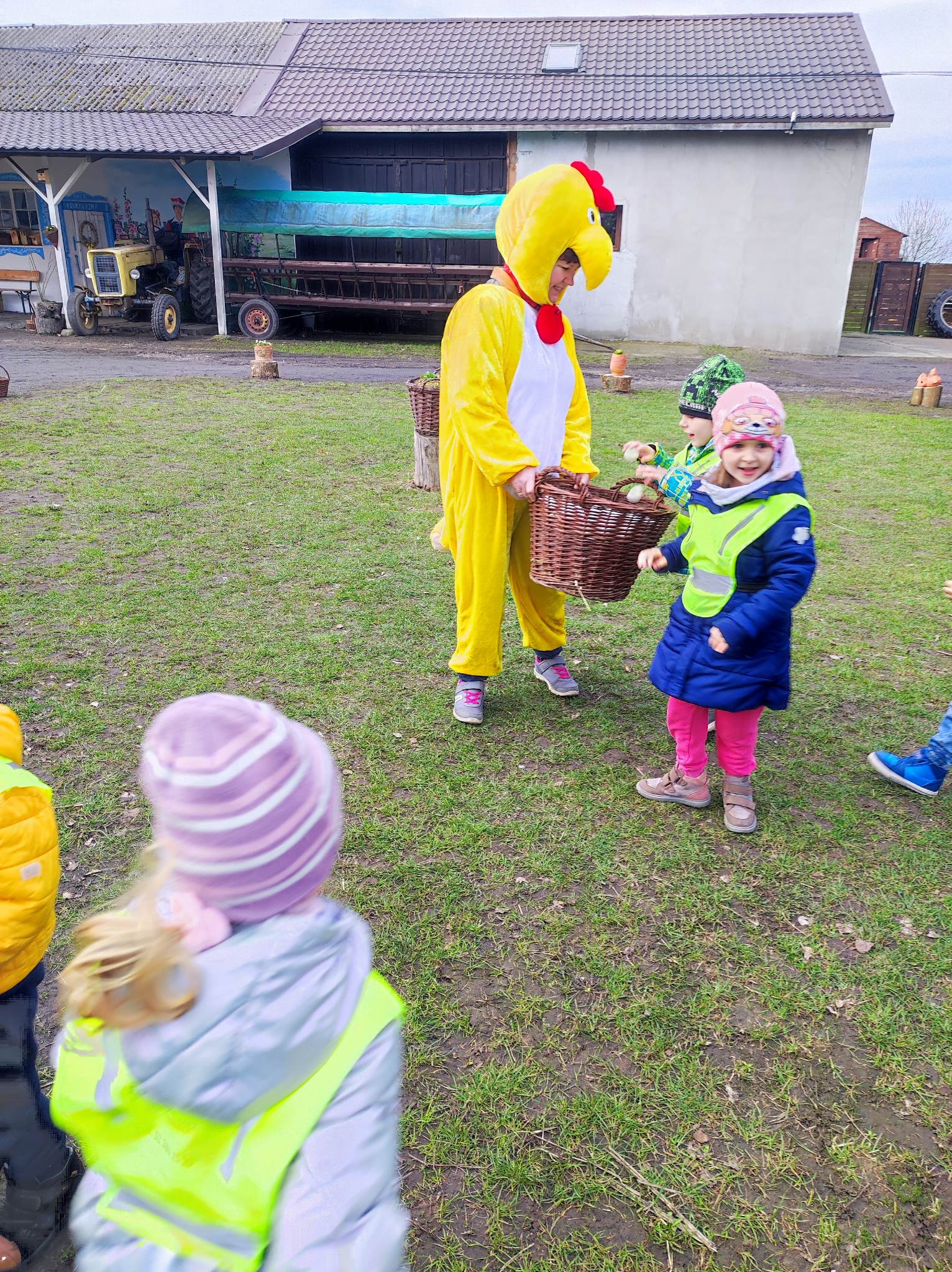 23 marca dzieci z grupy Misiów i Pszczółek wybrały się do Edukacyjnej Zagrody Wiejskiej w Kozielcu. Zostały przywitane przez Wesołego Kurczaka wspólnym tańcem. Na gości czekało zadanie – szukanie ukrytych w zagrodzie jajek, wszyscy świetnie sobie z tym poradzili. Dzieci miały okazję dotknąć i nakarmić wiejskie zwierzęta. Udały się również na strych, gdzie mogły zobaczyć stare przybory codziennego użytku. Pszczółki i Misie poznały cykl rozwojowy kurcząt, a także zaobserwowały różnicę jaj poszczególnych ptaków w zagrodzie. Na koniec dzieci wykonały wielkanocne palmy, co sprawiło im wiele radości.